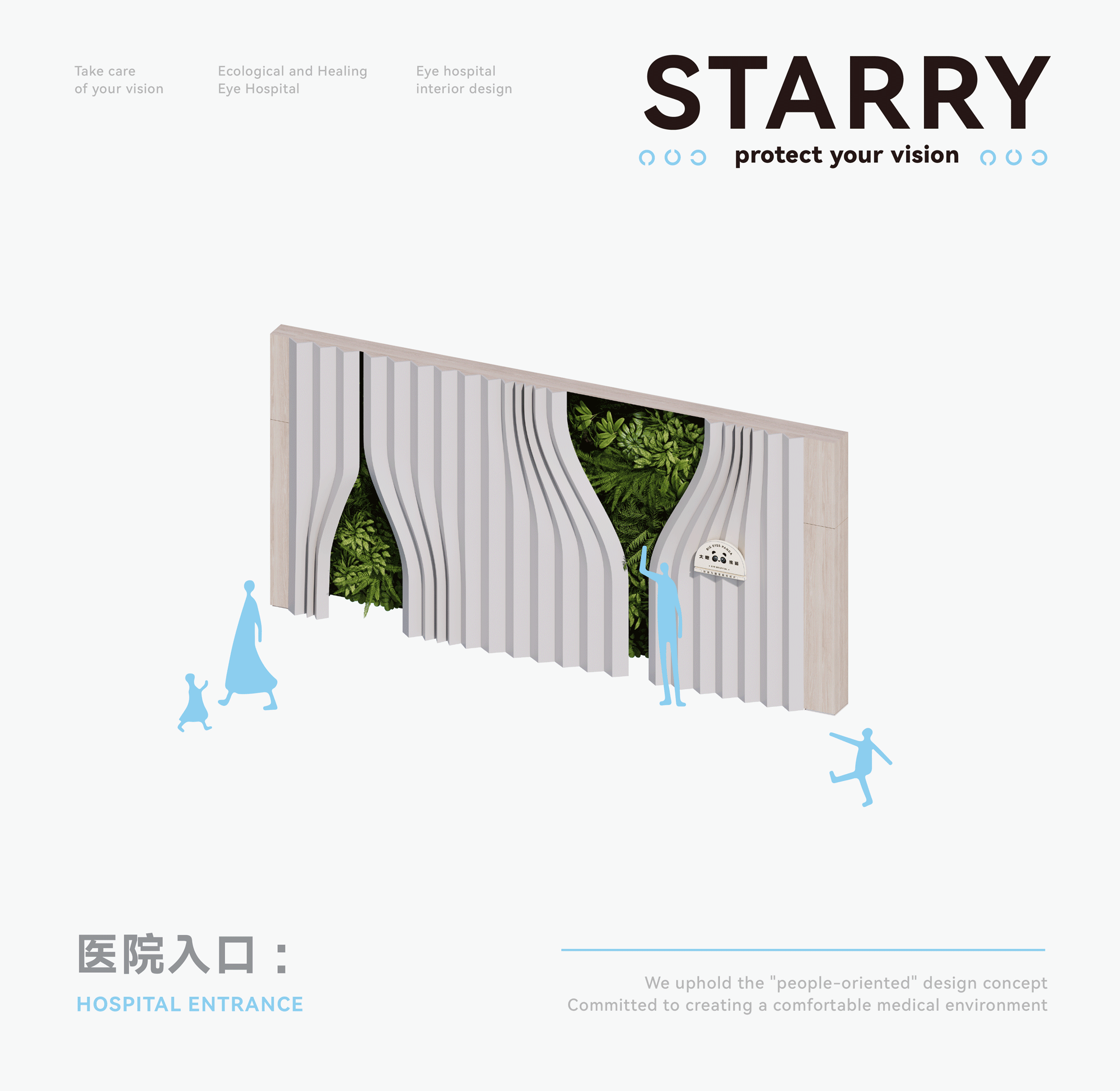 医院的墙面以绿植和功能装置造景,搭建一个眼镜回收站,既是视觉装置,也是与过去近视经历的告别仪式,给来访者鼓舞和激励。在满足医疗空间基本功能与抗菌性要求的同时,传达出细腻的医护精神。