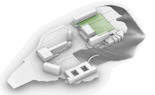通过艺术雕塑穿插其中的有遮蔽的下沉景观庭院,作为校区新的公共枢纽位于联合书院大道轴线的末端,在这个自然流通且无能源设备损耗的风廊场所,师生们可在景观与建筑之间毫无阻碍的出入,进行单纯的放松、阅读或各种简单的主题文化社交活动。急车辆通道及泊车场则自然隐匿在建筑体块背侧较低的地面,在具备建筑入口广场的功能的同时也减少了行车对联合书院草地的干扰。