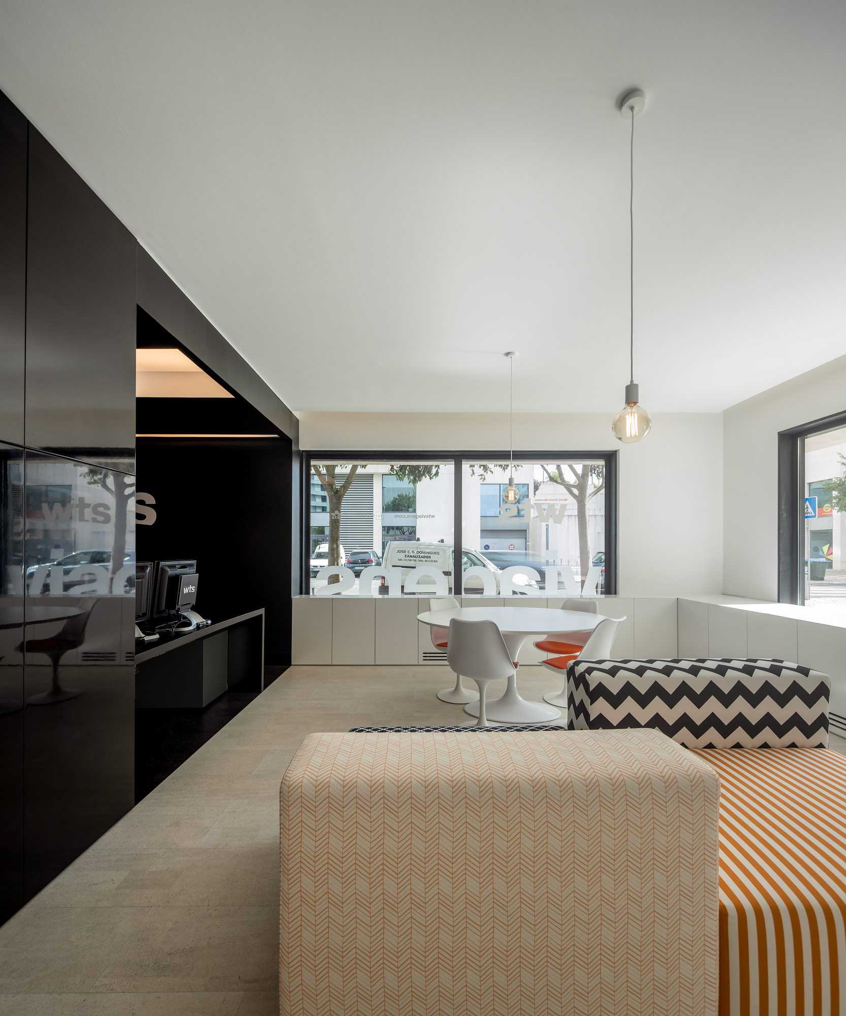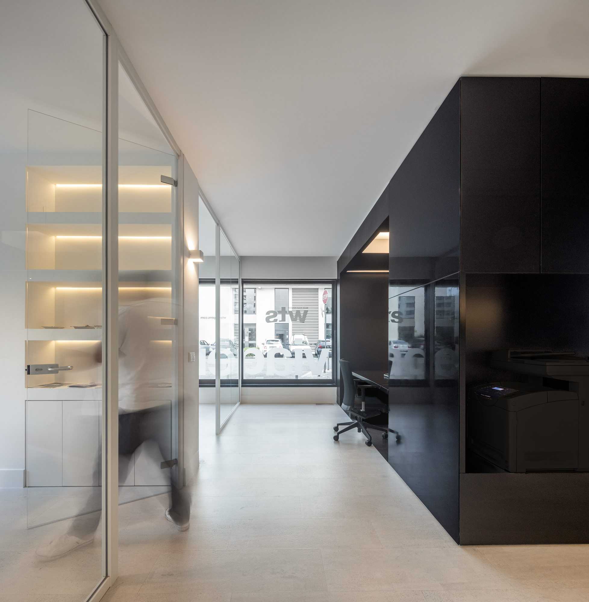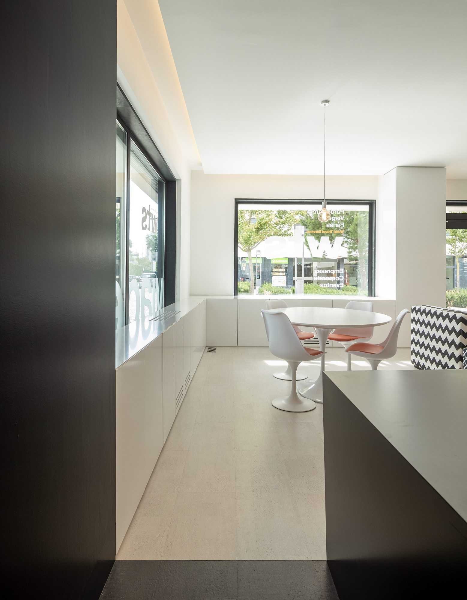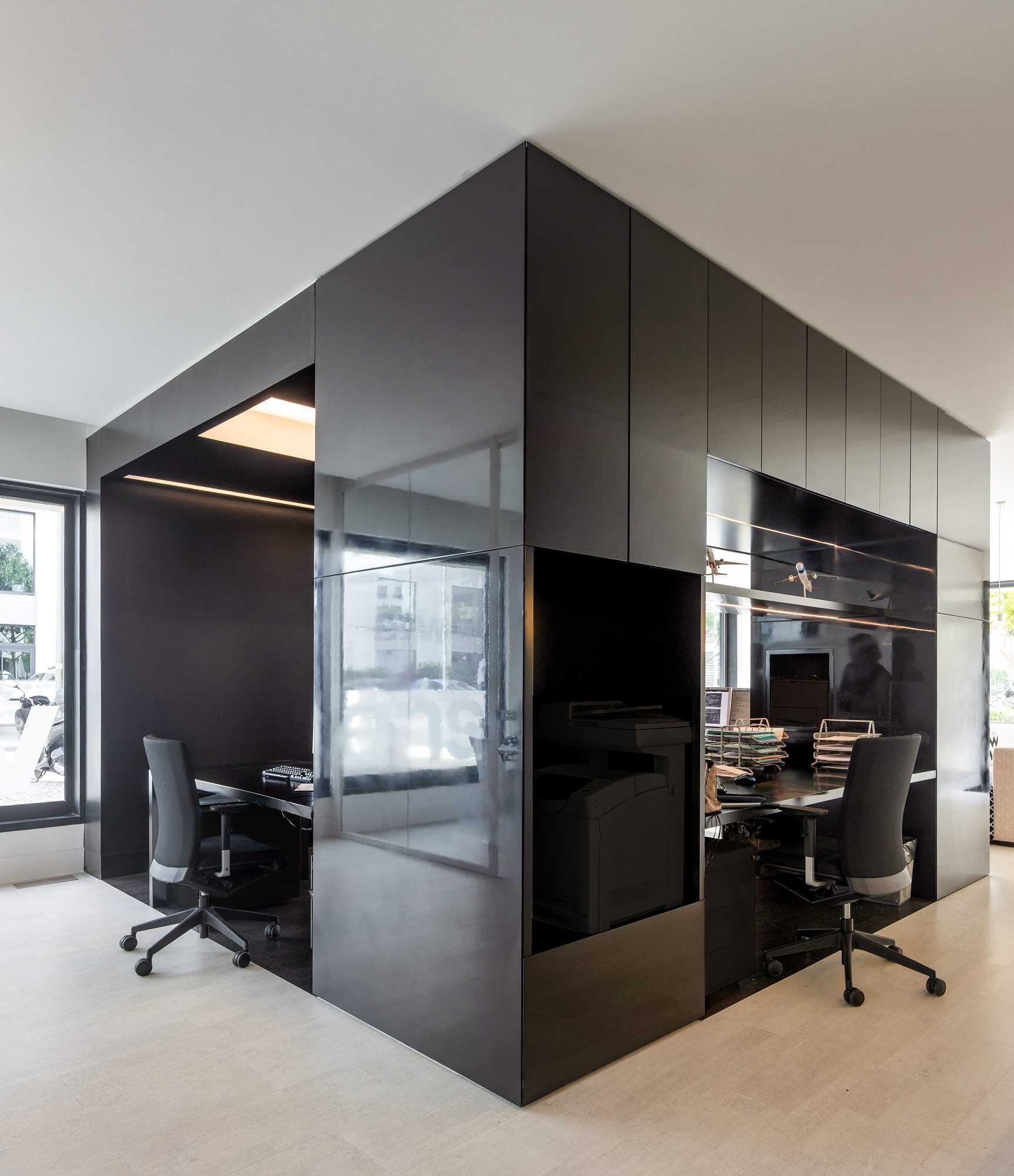 The store was a rough construction needing a project design from scratch that would be balanced, functional and inspiring. Besides a central open-space volume for employees, where there is also a waiting area and a table for meetings, that zone has one bathroom, a pantry and three individual offices are part of this zone. Following the concept, the volume, placed in the centre, is in high-gloss lacquered MDF and have six to eight workstations and plenty of room for storage and printing.