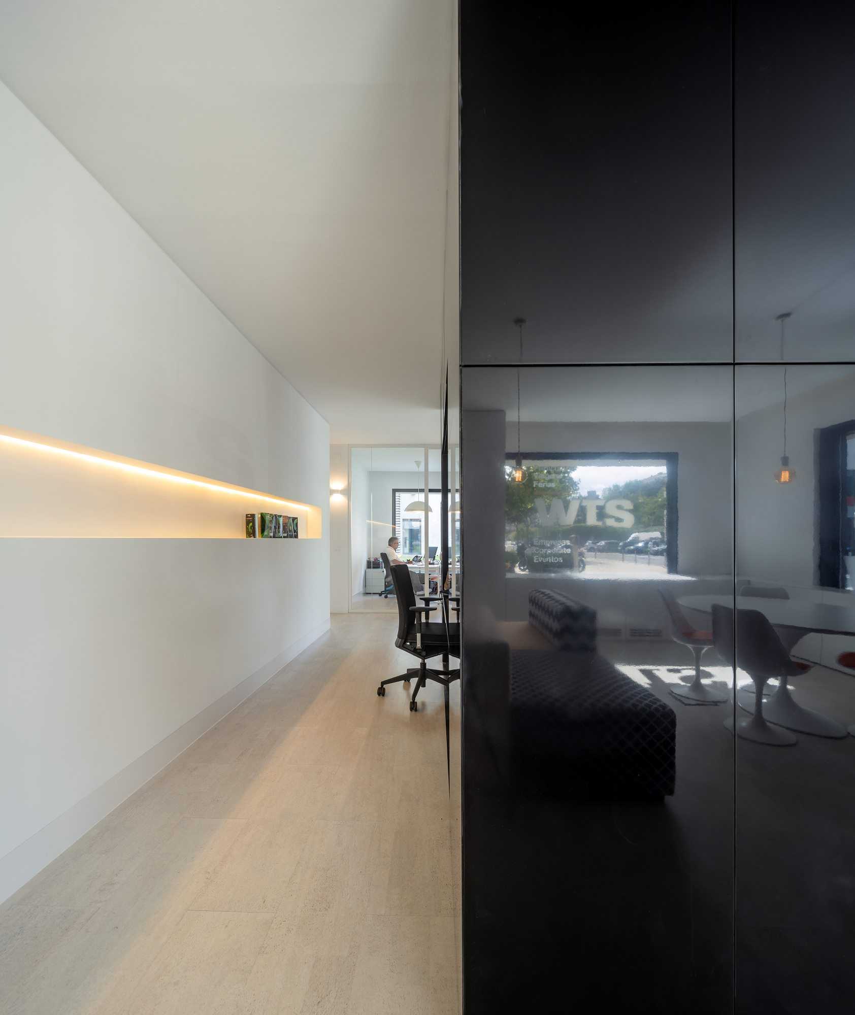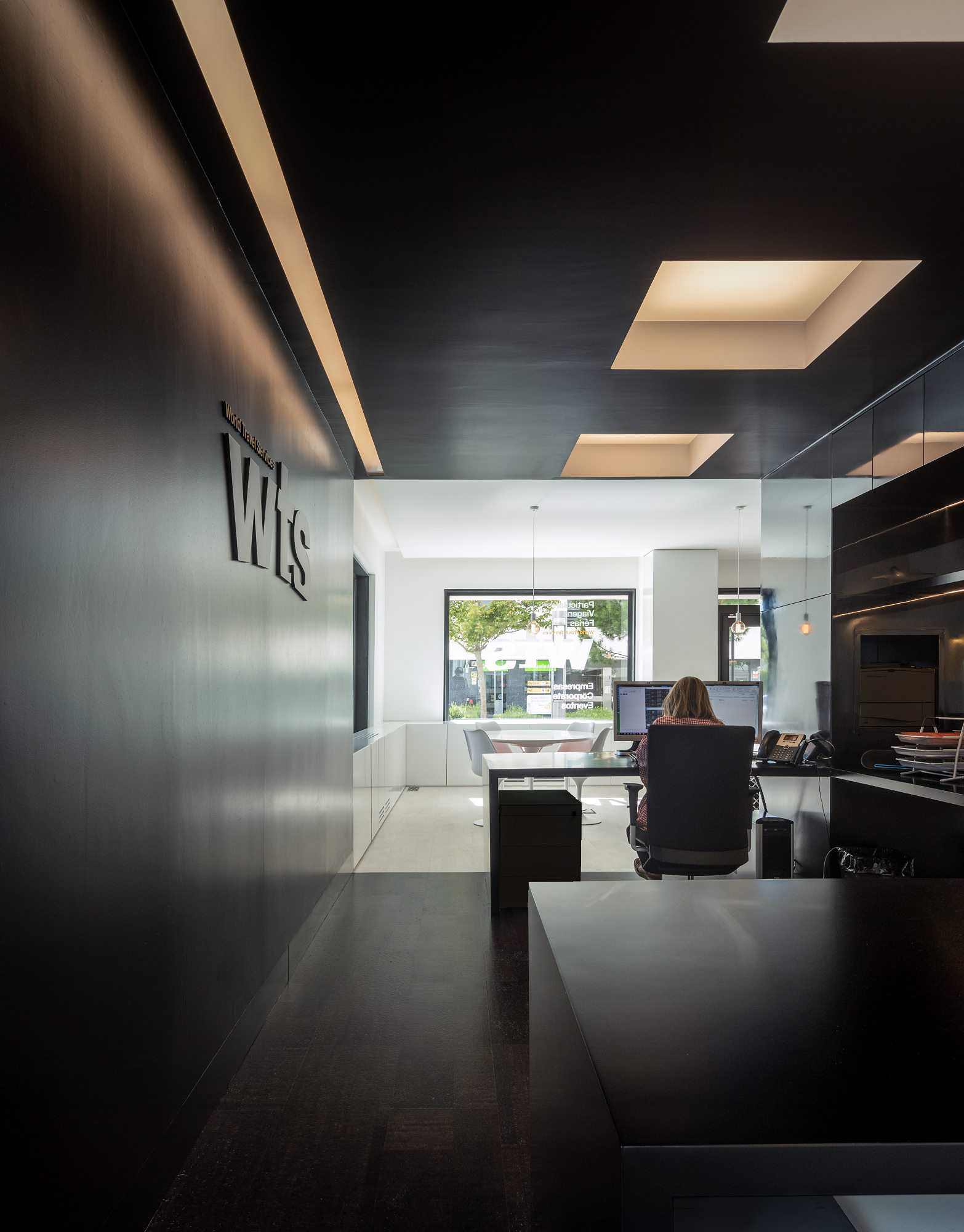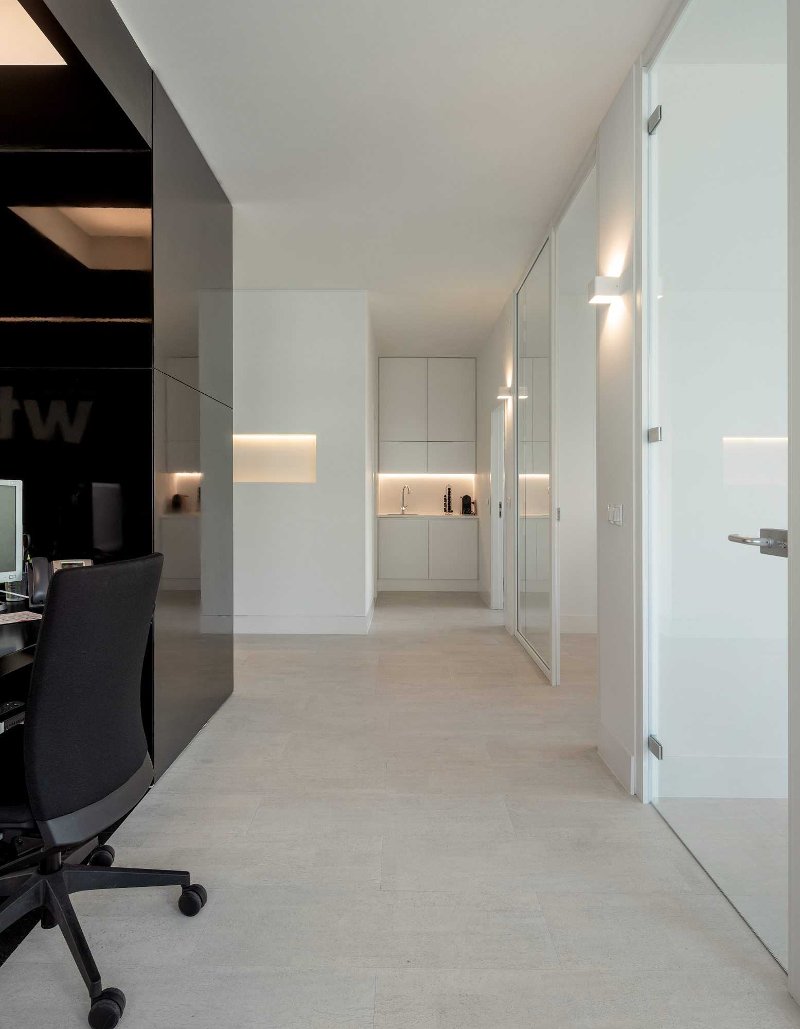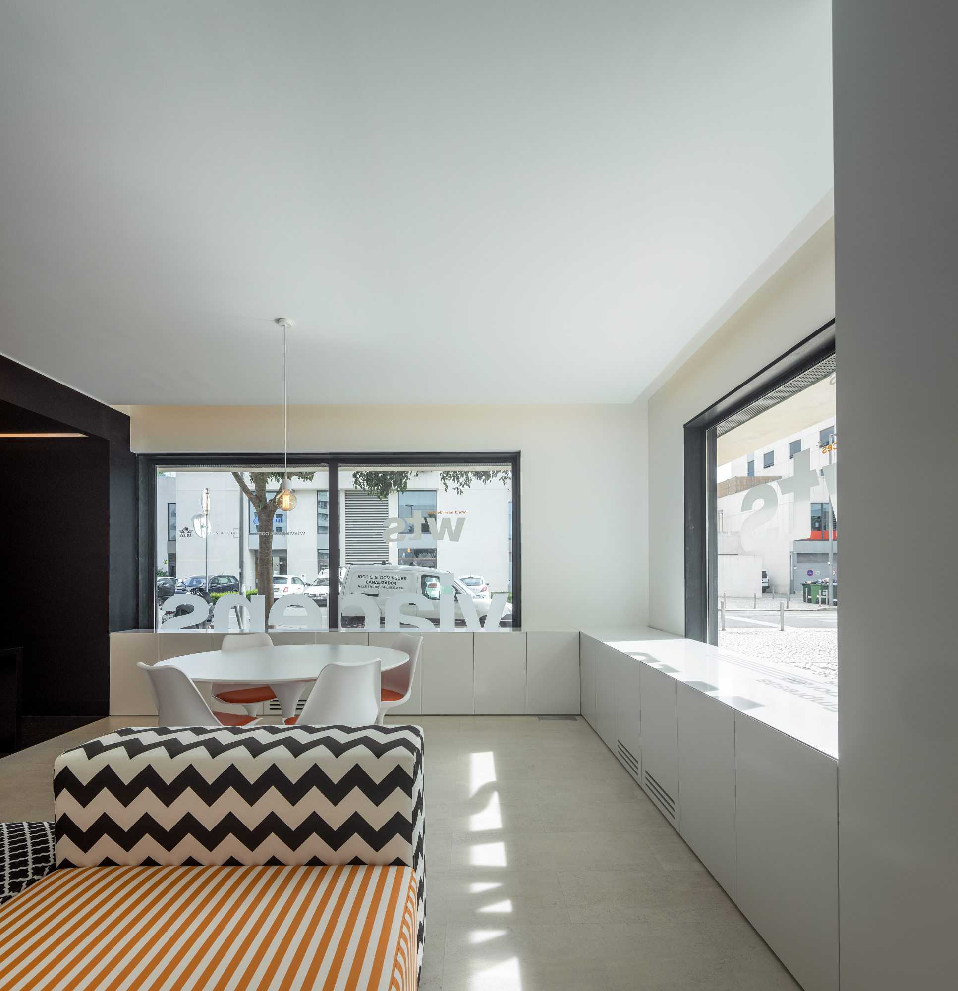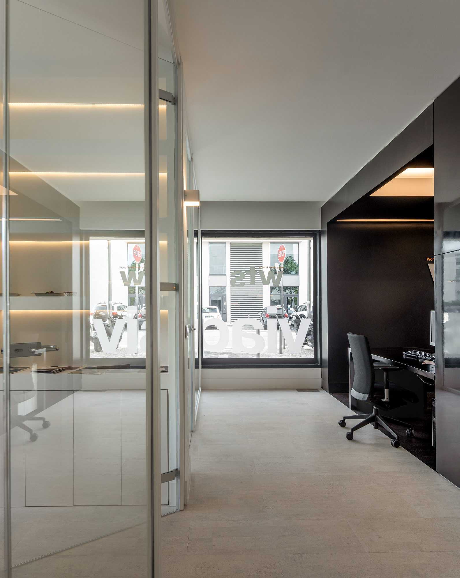 The store was a rough construction needing a project design from scratch that would be balanced, functional and inspiring. Besides a central open-space volume for employees, where there is also a waiting area and a table for meetings, that zone has one bathroom, a pantry and three individual offices are part of this zone. Following the concept, the volume, placed in the centre, is in high-gloss lacquered MDF and have six to eight workstations and plenty of room for storage and printing.