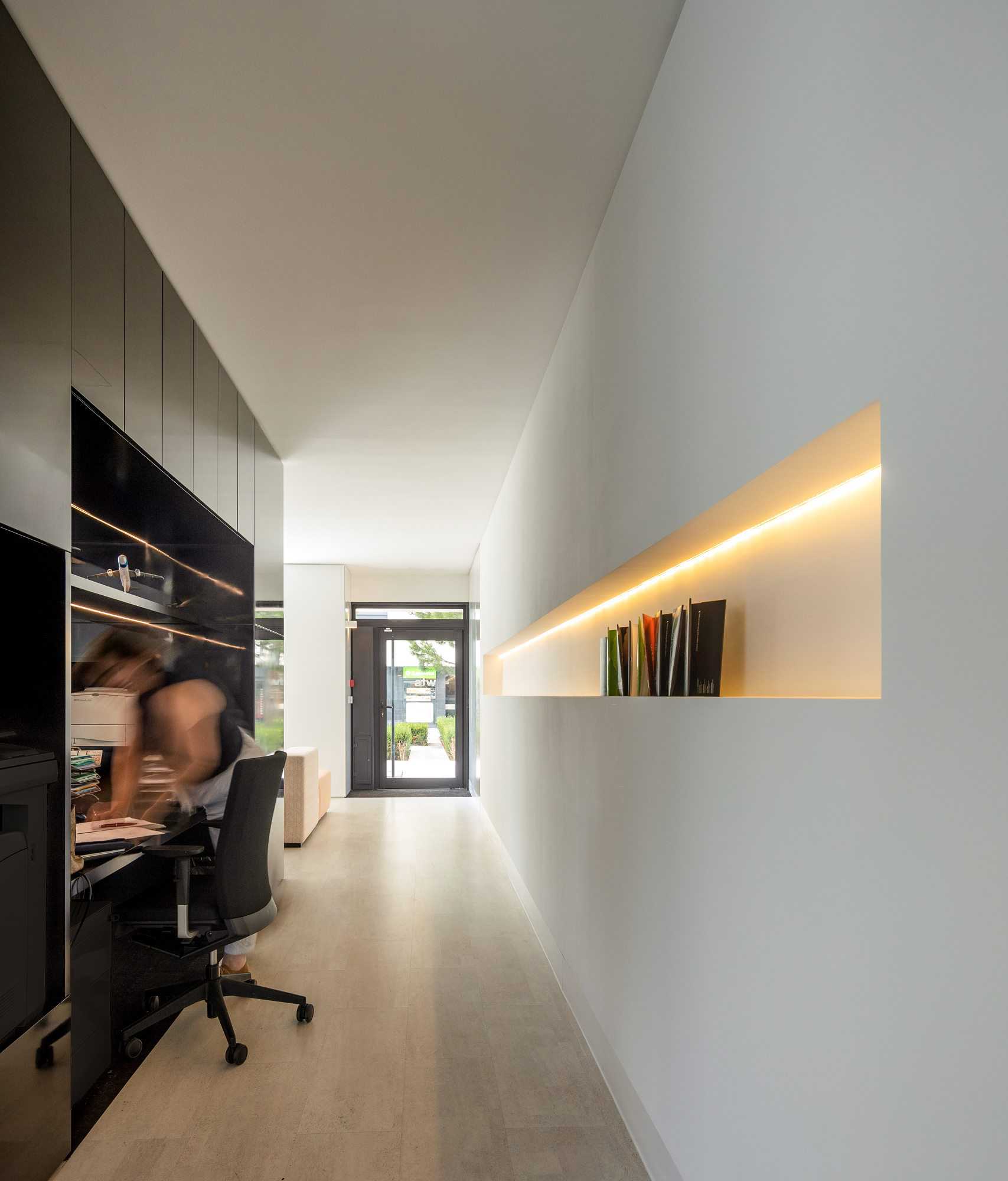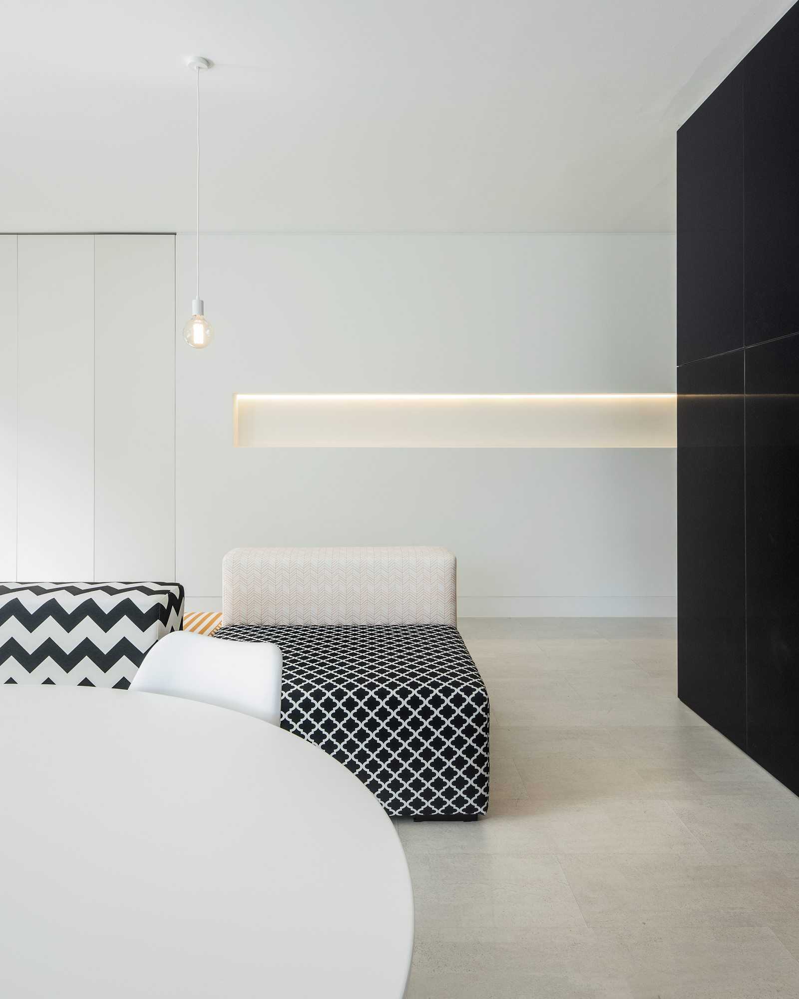 The protrusions and recesses on the dividing wall with the neighbouring fraction were entirely covered with laminated plaster and installed a light slot along the wall, forming an illuminated niche. Lighting also deserved special attention in all space design, with lightboxes in the ceilings complementing the natural lighting.