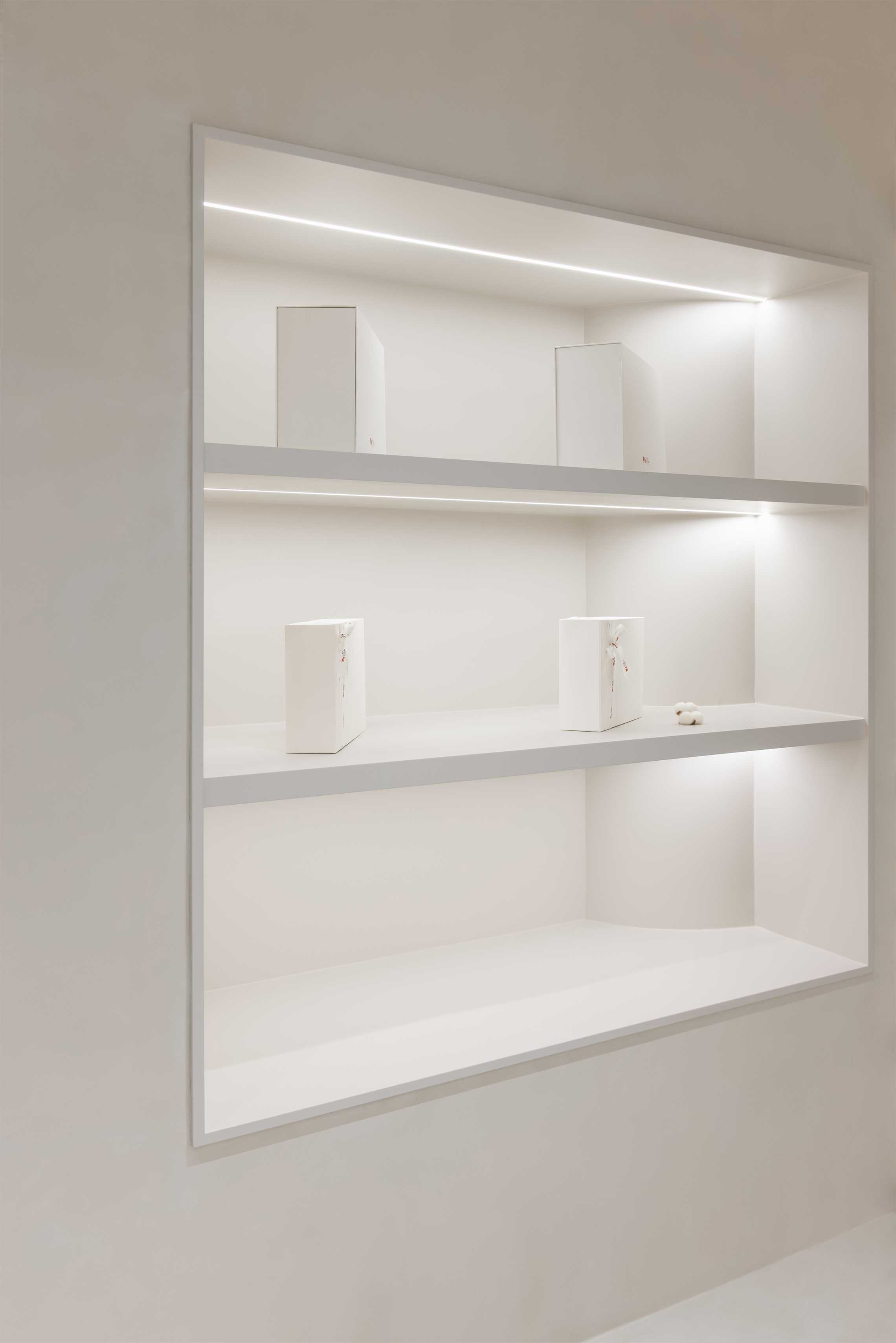 深蓝色展台营造静谧之感,暖白色空间奠定舒适基调 © WEN STUDIO