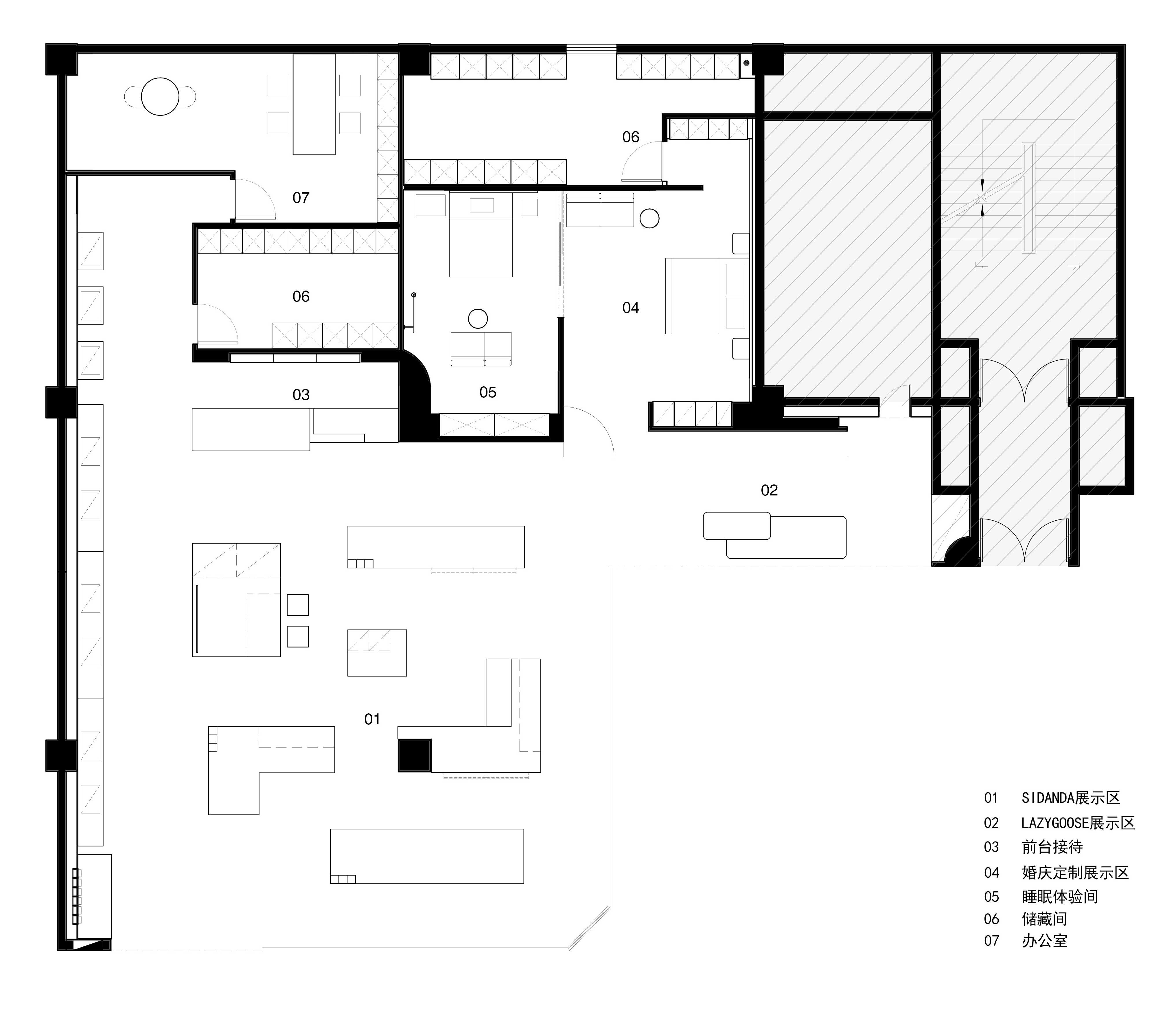关于产品的展示,设计师希望能专注于产品本身,运用简洁的素材充分传达产品的核心特质 ——柔软而温暖。所以设计师采用简单的几何形体,形成开放的大尺度展台,不仅在对比中突出产品的柔软,也创造出适合展开被子等大号产品的平面。