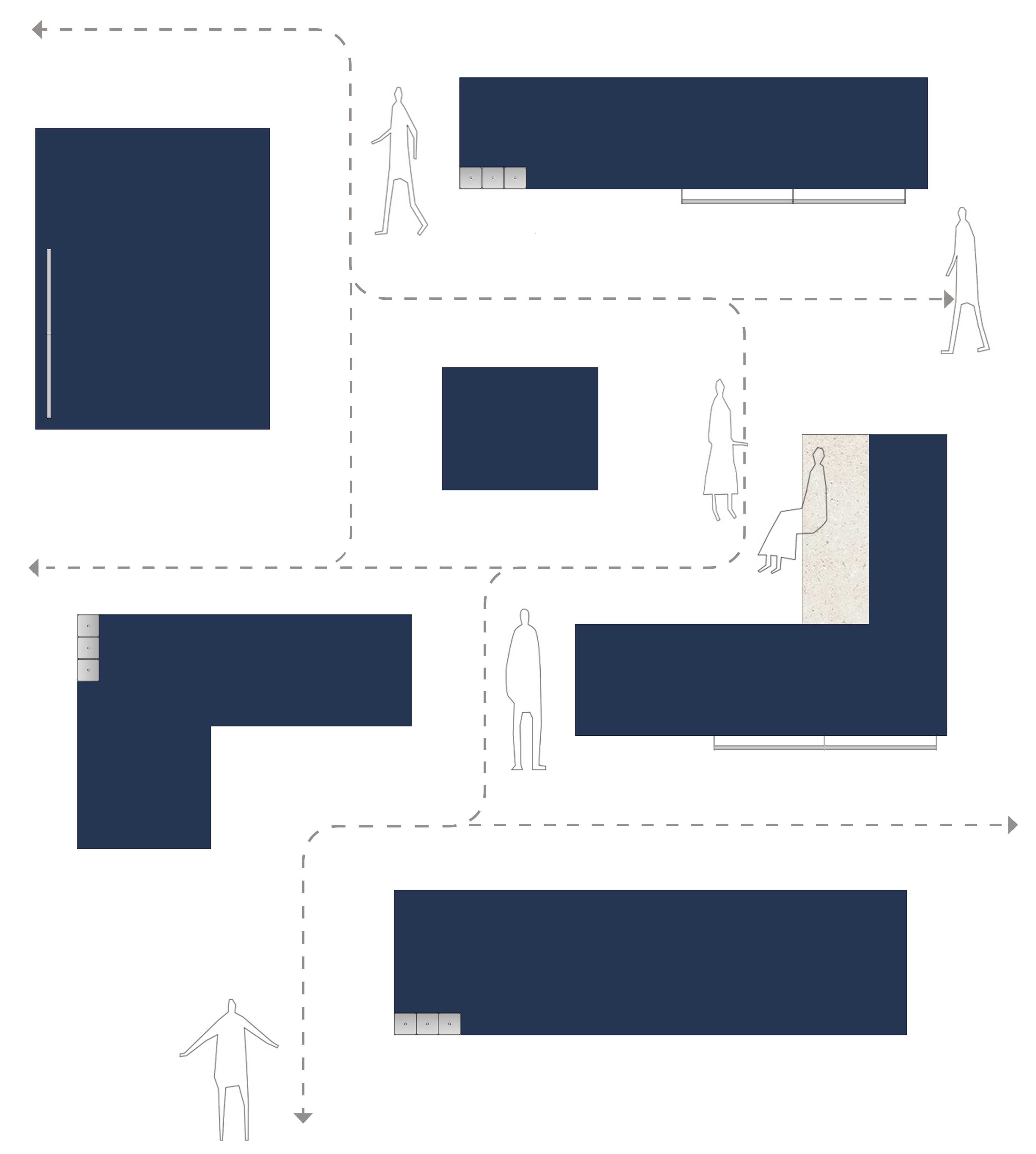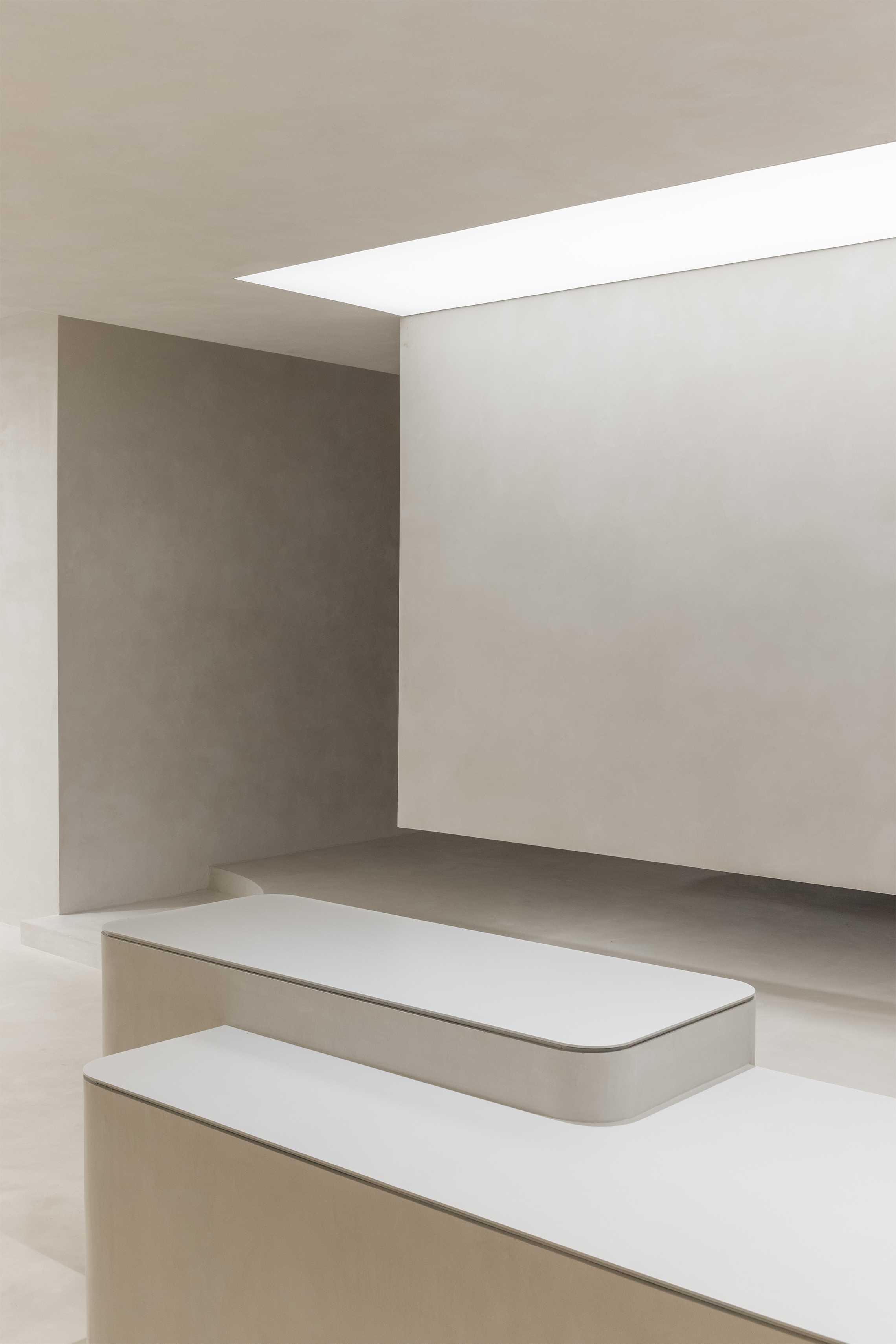 空间与空间的转换松弛而有节奏。在空间组织上兼顾公共空间的开放性与体验区域的私密感:设计通过调整地面高低、尺度大小、光线强弱来暗示功能变化。贯穿始终的建筑体块使每个区域互通有无,在这里没有绝对独立,只有相对关联。