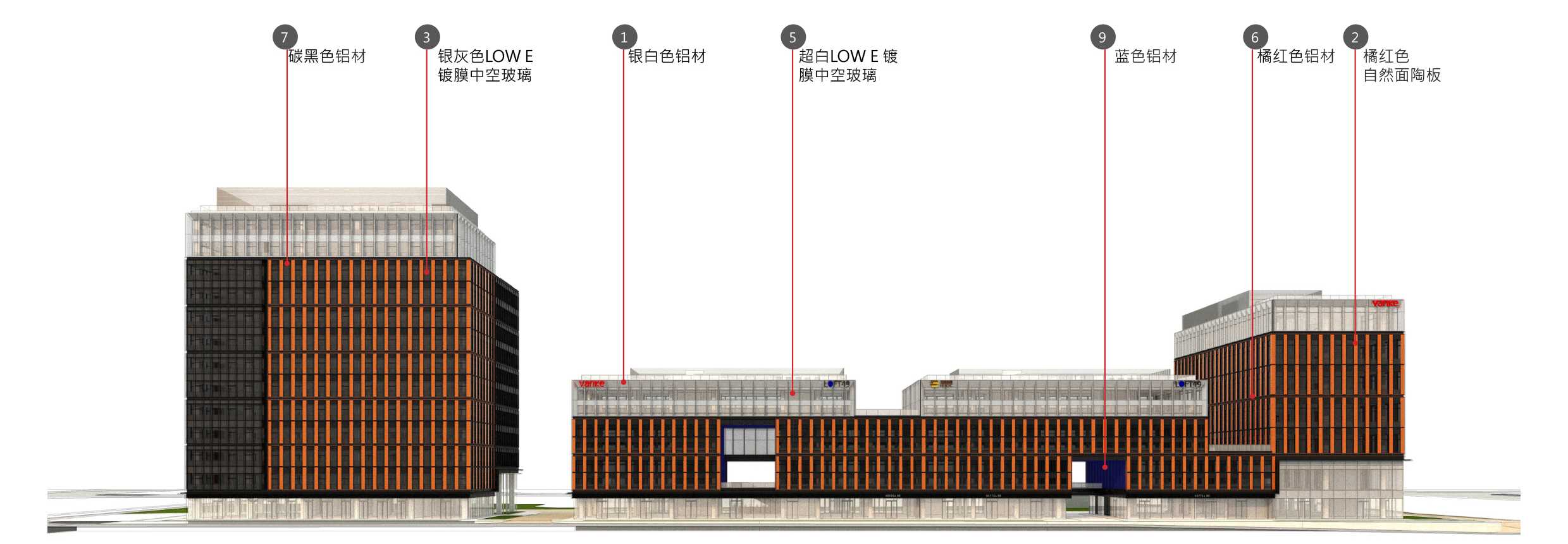 立面设计采用整体式设计,采用暖红色陶土板,旨在最大限度地减少对住宅的光污染,并与红砖工业遗产互相匹配。在负开放空间(对比鲜明的蓝色铝制百叶窗)、顶部体量(金属银色铝板)和塔角(有色灰色幕墙)处可以找到材料变化,以进一步消除笨重的体量,增加建筑的轻盈感。
