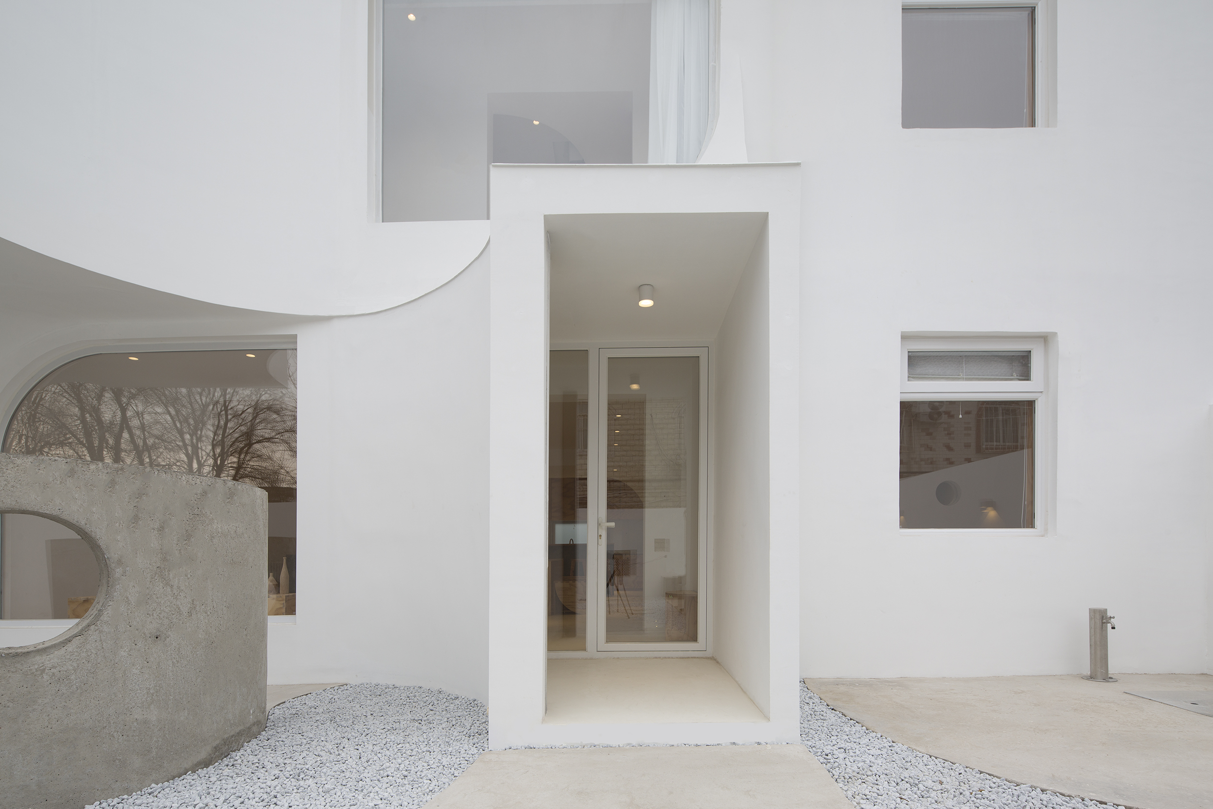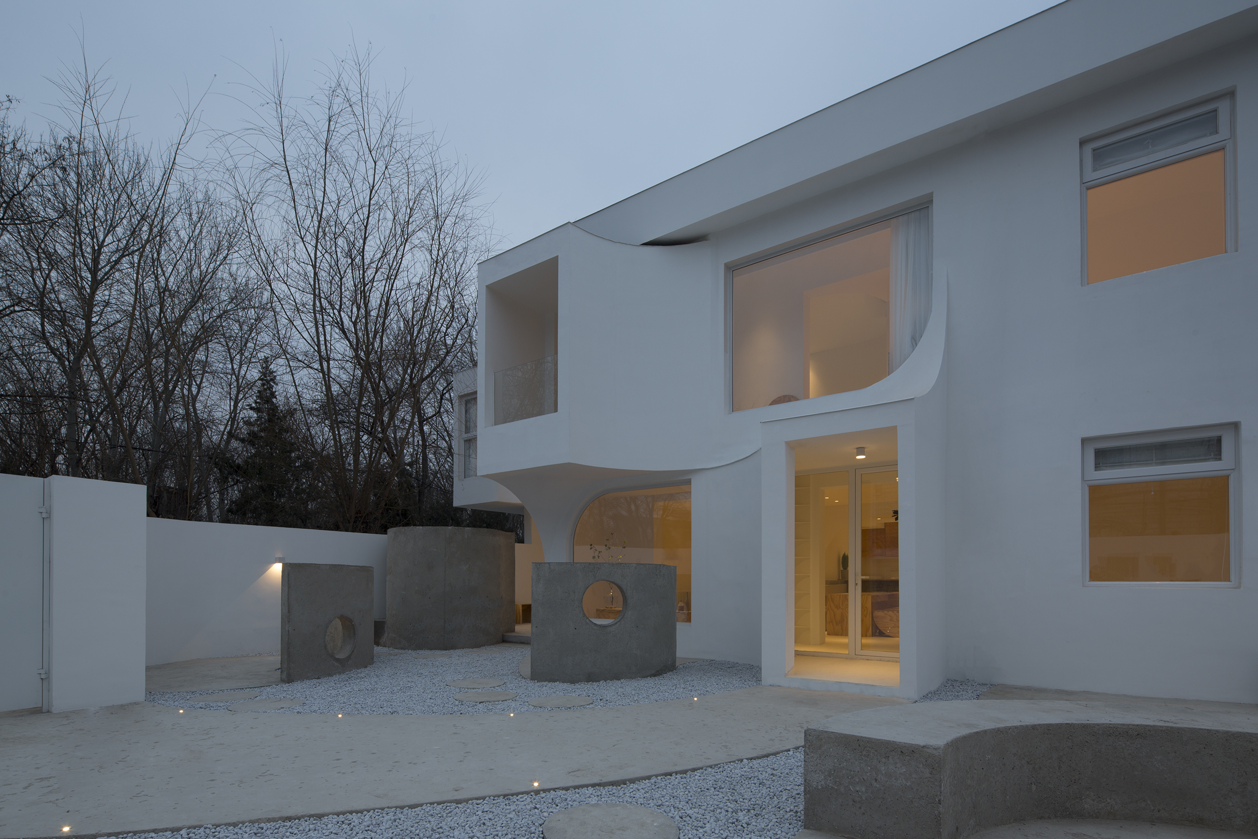 建筑与室内的设计语言是以一道1/4圆弧为出发点,以严谨的态度自由地流动在空间里,通过几何构成的方式来增加建筑的张力。立面上向外延申的建筑体块,以流动的姿态向自然靠近,将建筑、自然与人的距离拉近。而白色的外墙使得建筑变得抽象而有雕塑感,通过白色材质的渲染模糊了墙和顶的界限,流动的空间和自然的光线交融在一起,带给人纯粹的体验和想象的空间。