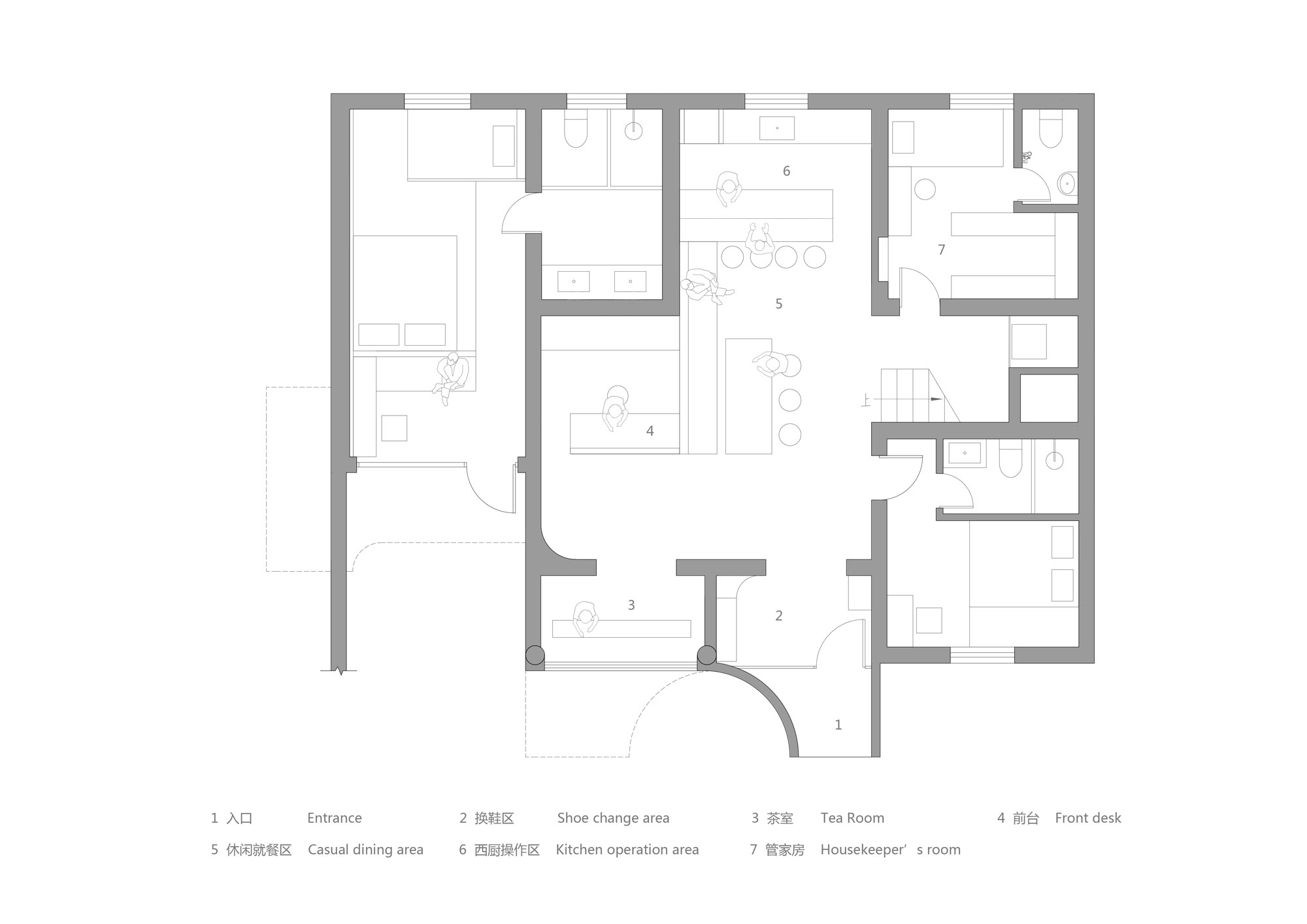We divided the rectangular courtyard of 100 square meters into several small semi-enclosed courtyards, trying to create an inner courtyard environment. Each courtyard will have a small tree as the protagonist (since it is completed in winter, the tree has not been planted), an organic connection is formed between the courtyards, and a series of interactions between tearoom, guest rooms, walls and the courtyard are created under the multi-level space. When users enter the building, they can read the interior of the building in their own way and perspective, so the container function of the building can be reflected. The shadow moves with the light, and the scenery changes with people, making the architectural space full of poetry.