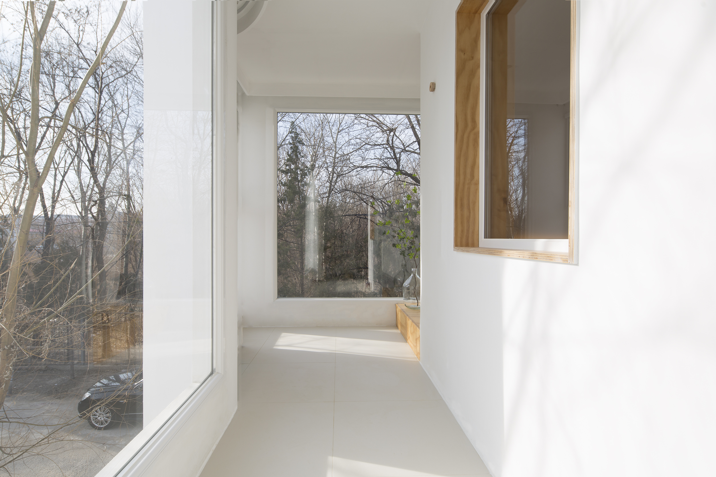 房内一体的木制家具与白色形成鲜明对比, the wooden furniture contrasts with white material©多么工作室