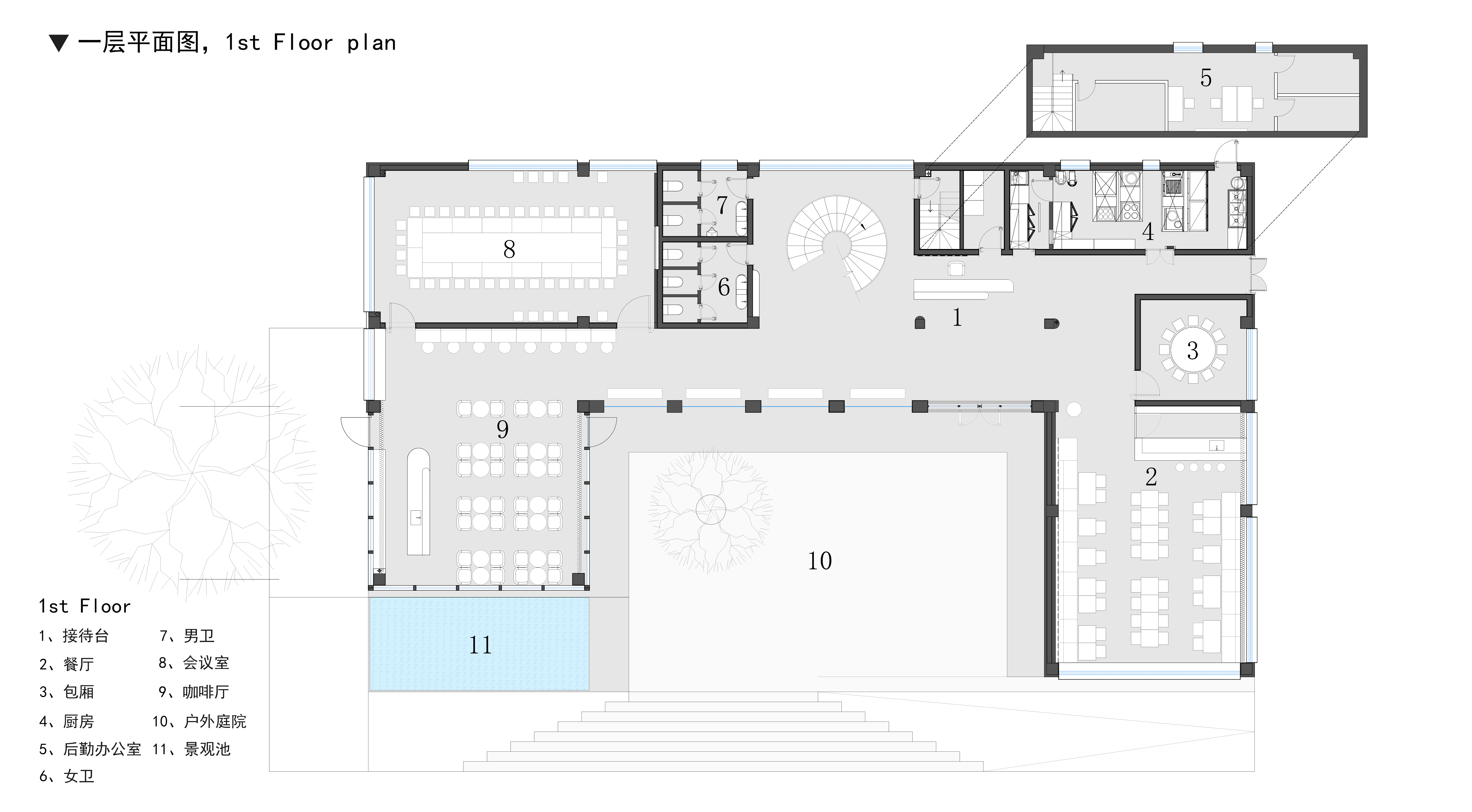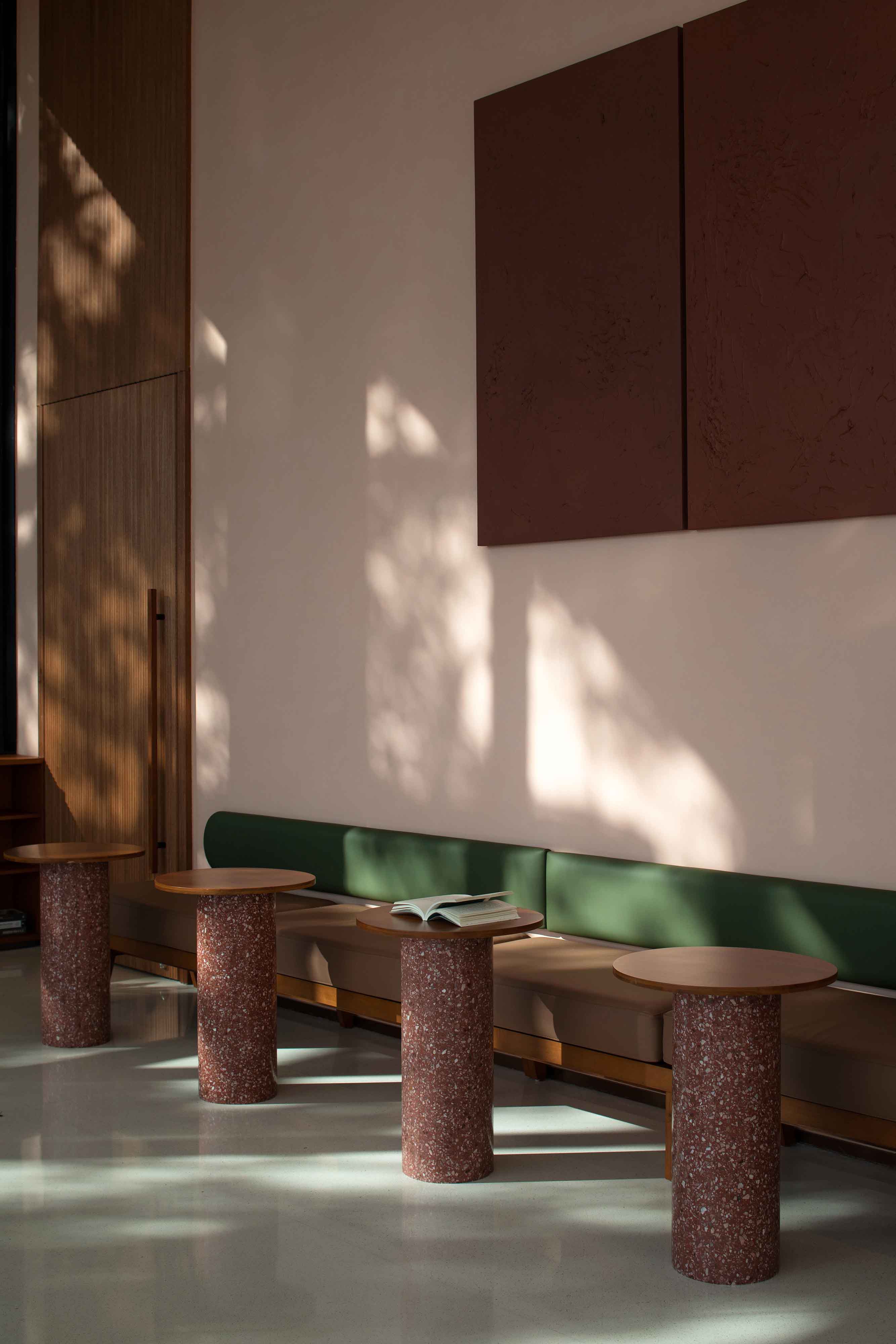 会议室外公共休息区,以冷暖色调有节奏的搭配,与婆娑的树影动静结合营造出舒缓且有厚度的闲暇时光。这样的配合与公共空间的互动功能相得益彰。