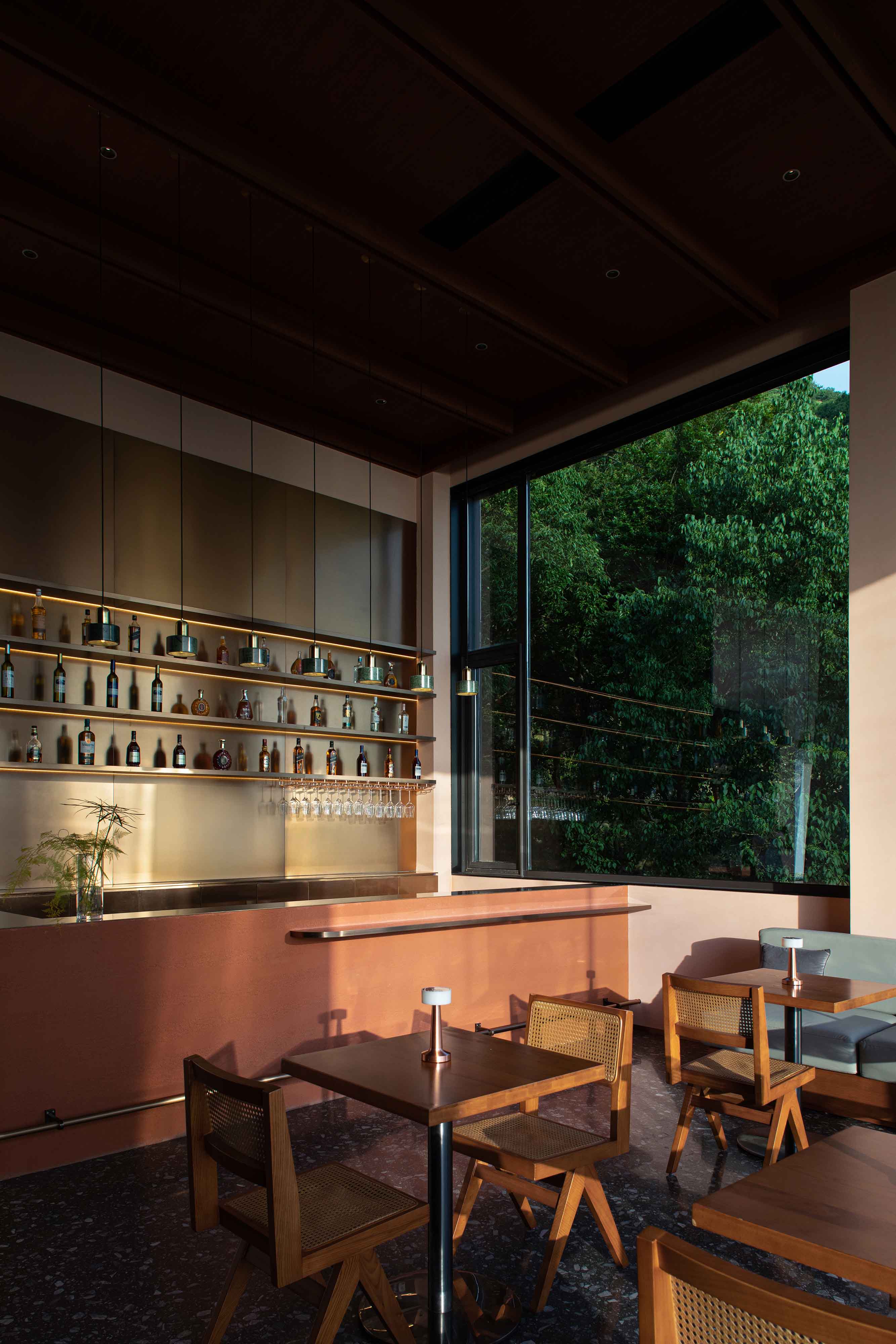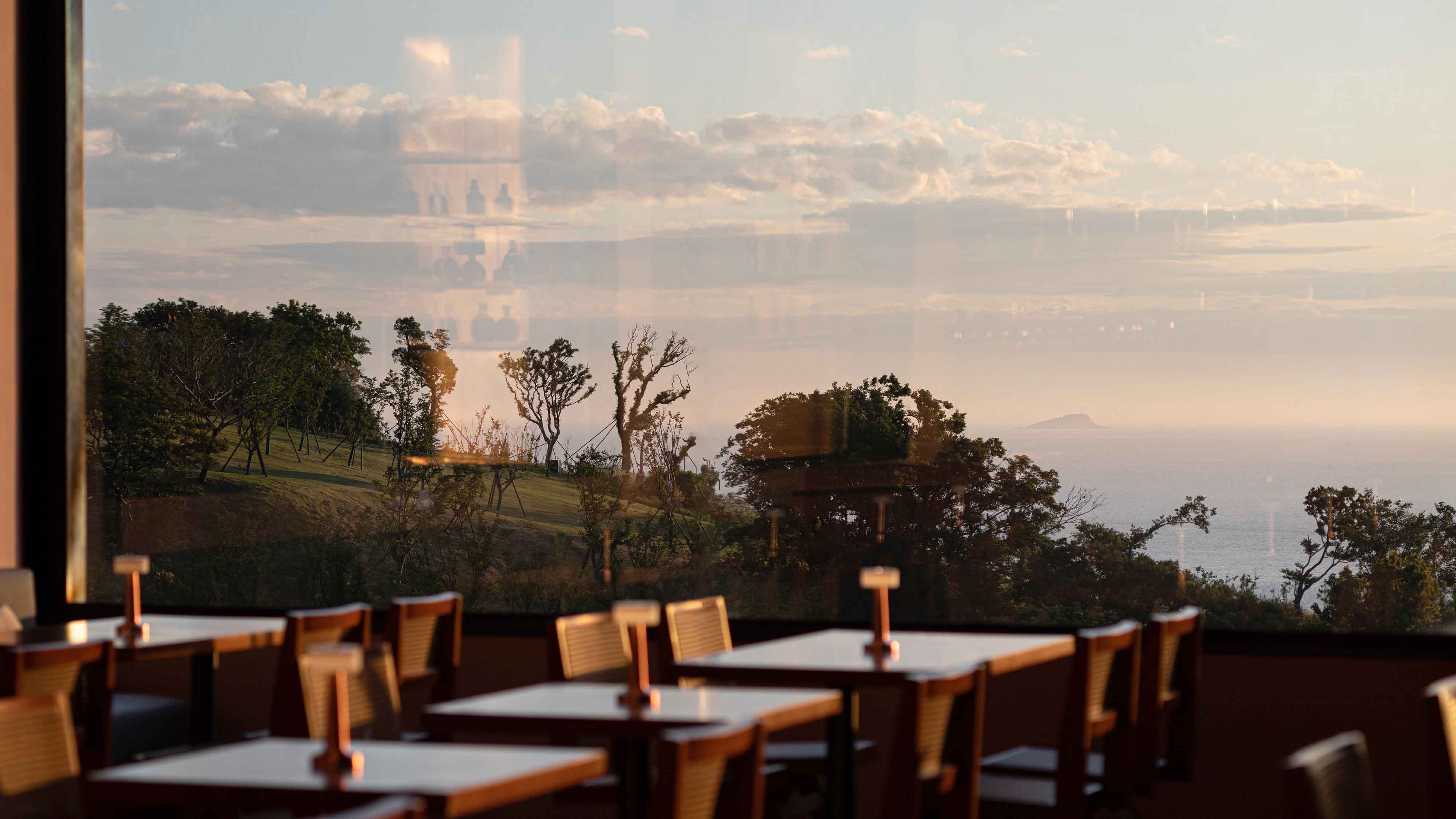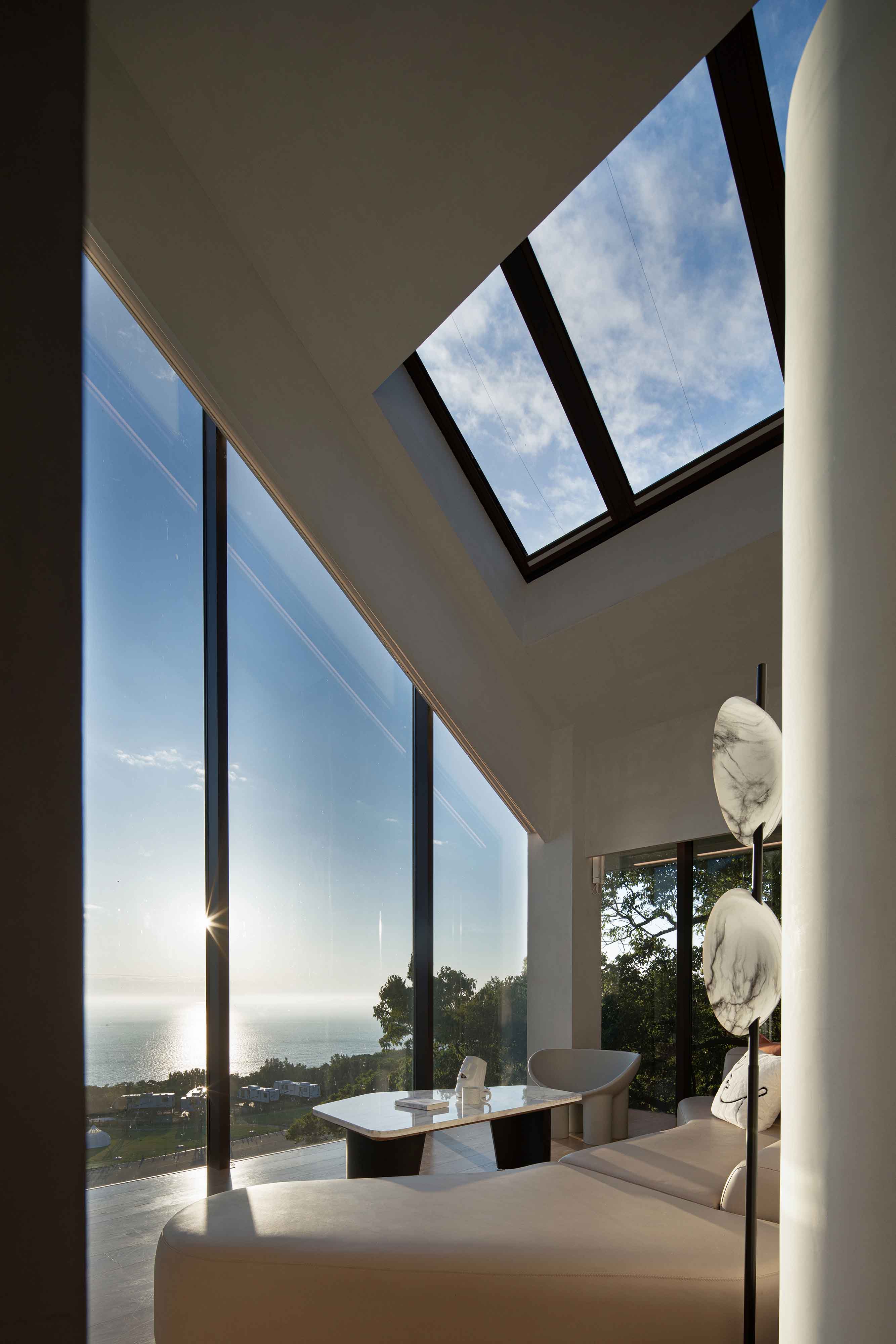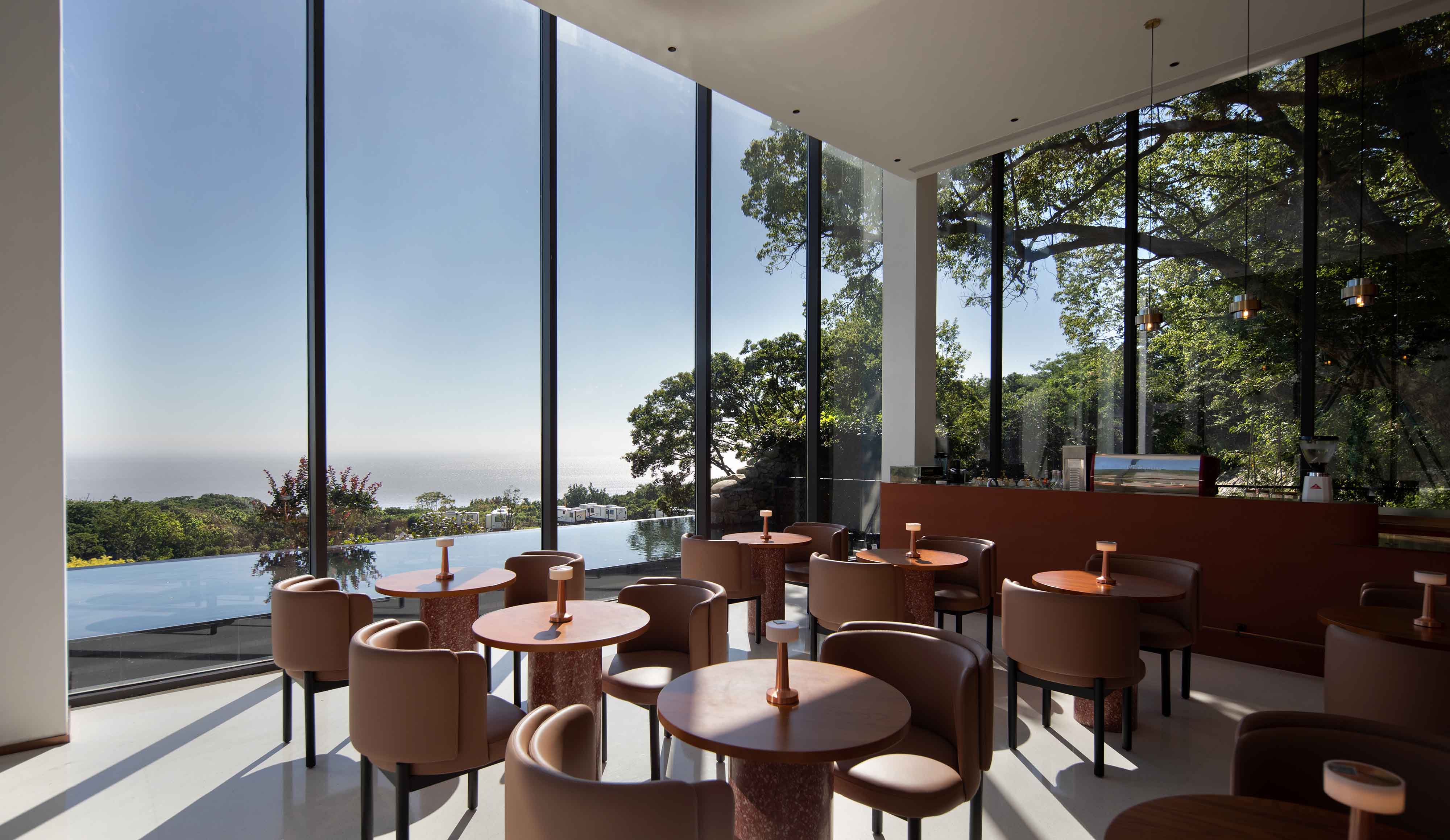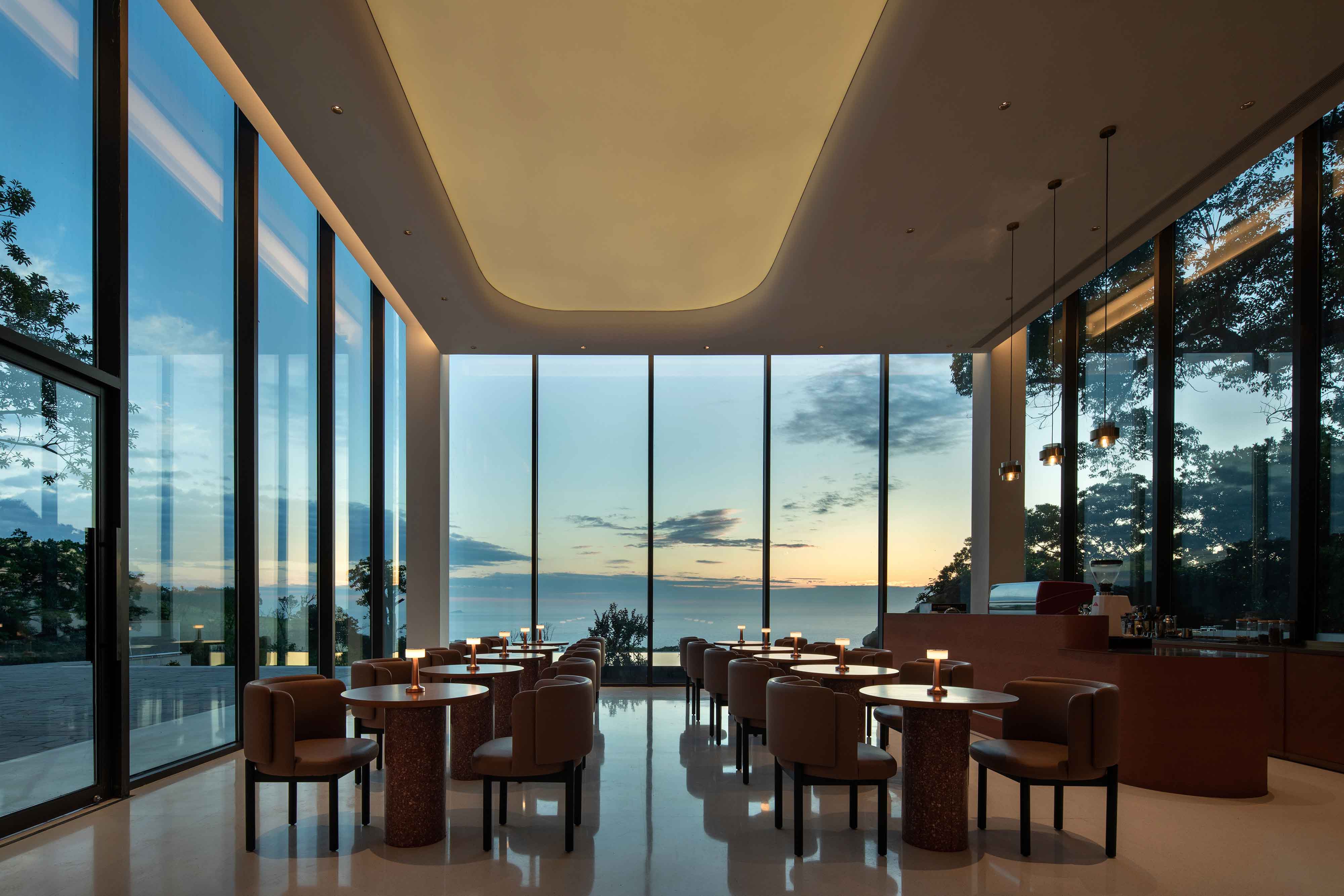 西侧的咖啡区是另一个可以涤净纷乱思绪的好去处。三面开敞的全明落地窗将室外的山水树木、朝阳彩霞、海涛小岛…尽收眼底