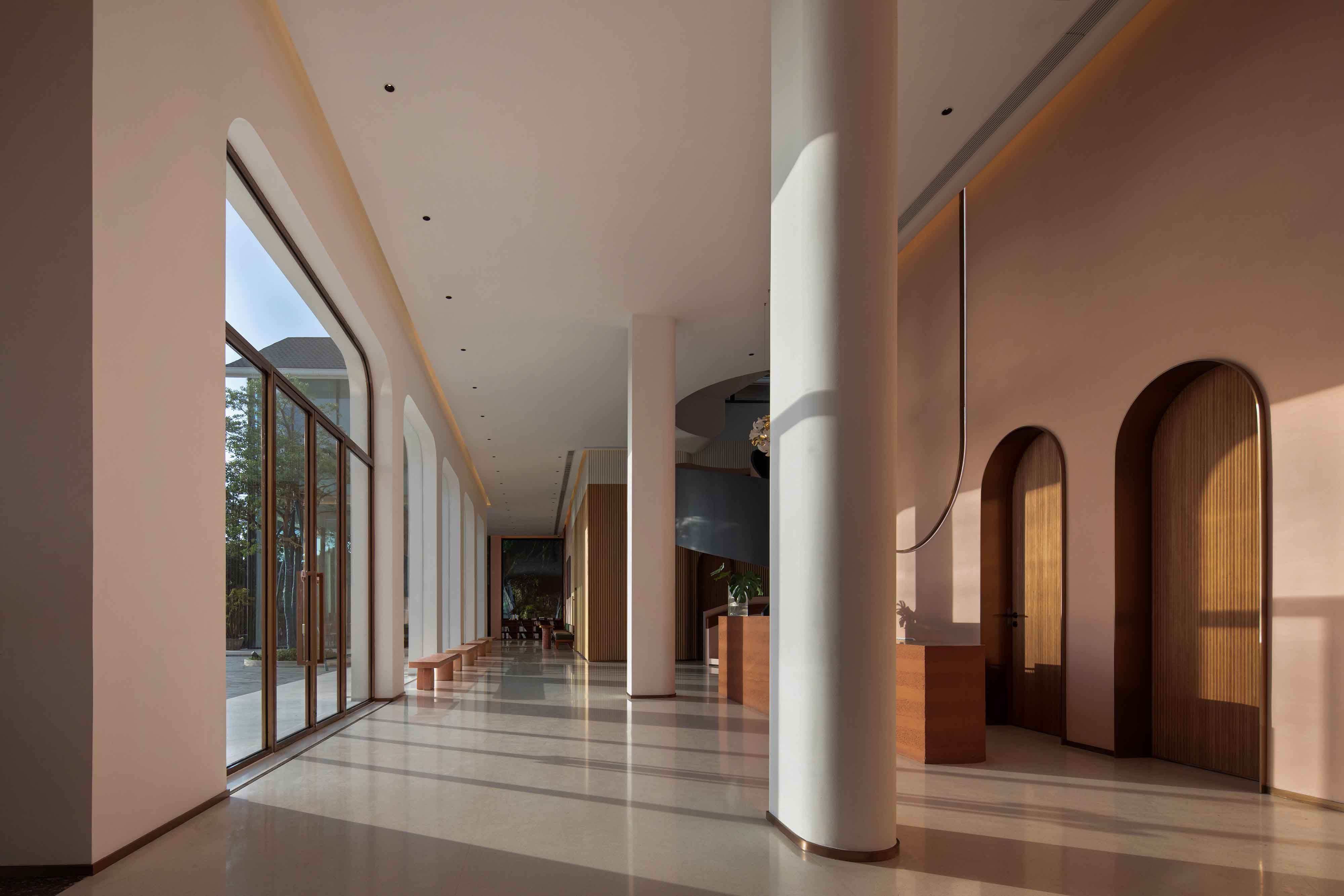 位于建筑中心的前台接待区渲染了整个公共区域悠然闲适的氛围,设计团队十分谨慎,避免繁复的设计喧宾夺主,令自然景观失了颜色。因此,以简单纯粹的材料与干净利落的线条为主,营造连贯且舒畅的空间形态,让视觉与动线结合,传递出一种平和、轻松,尺度、光线和色彩给人积极、灵动、柔和的氛围之感。