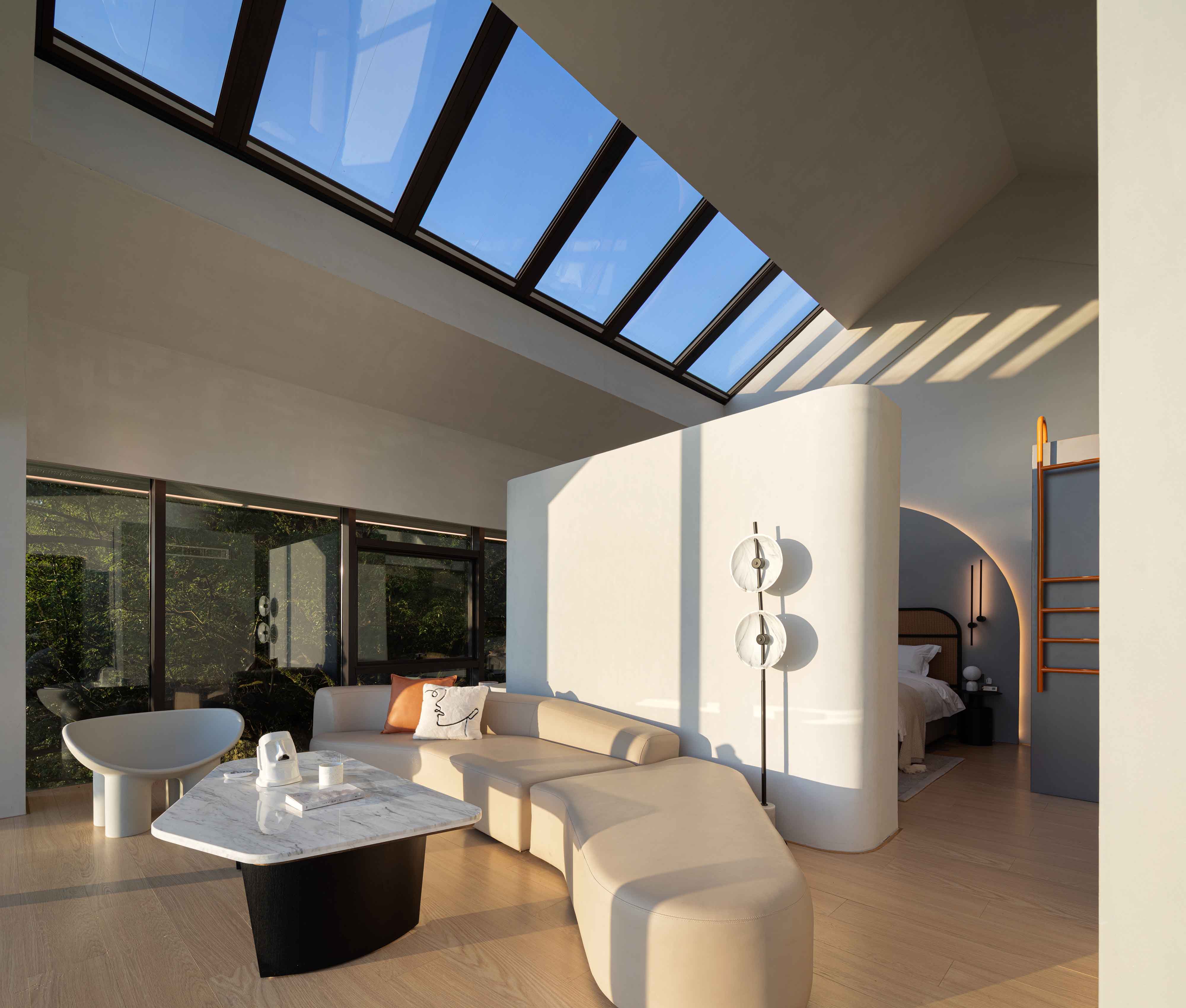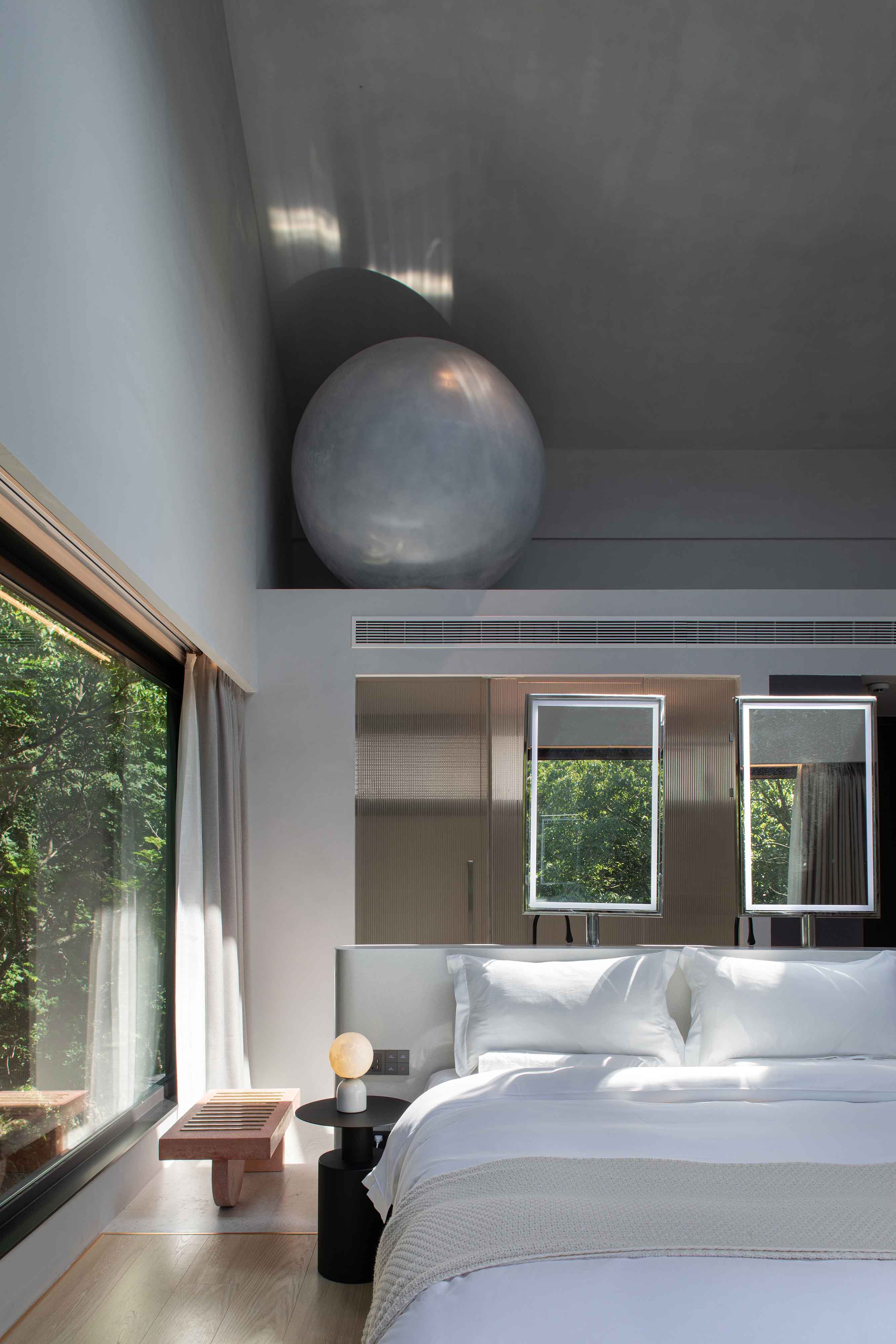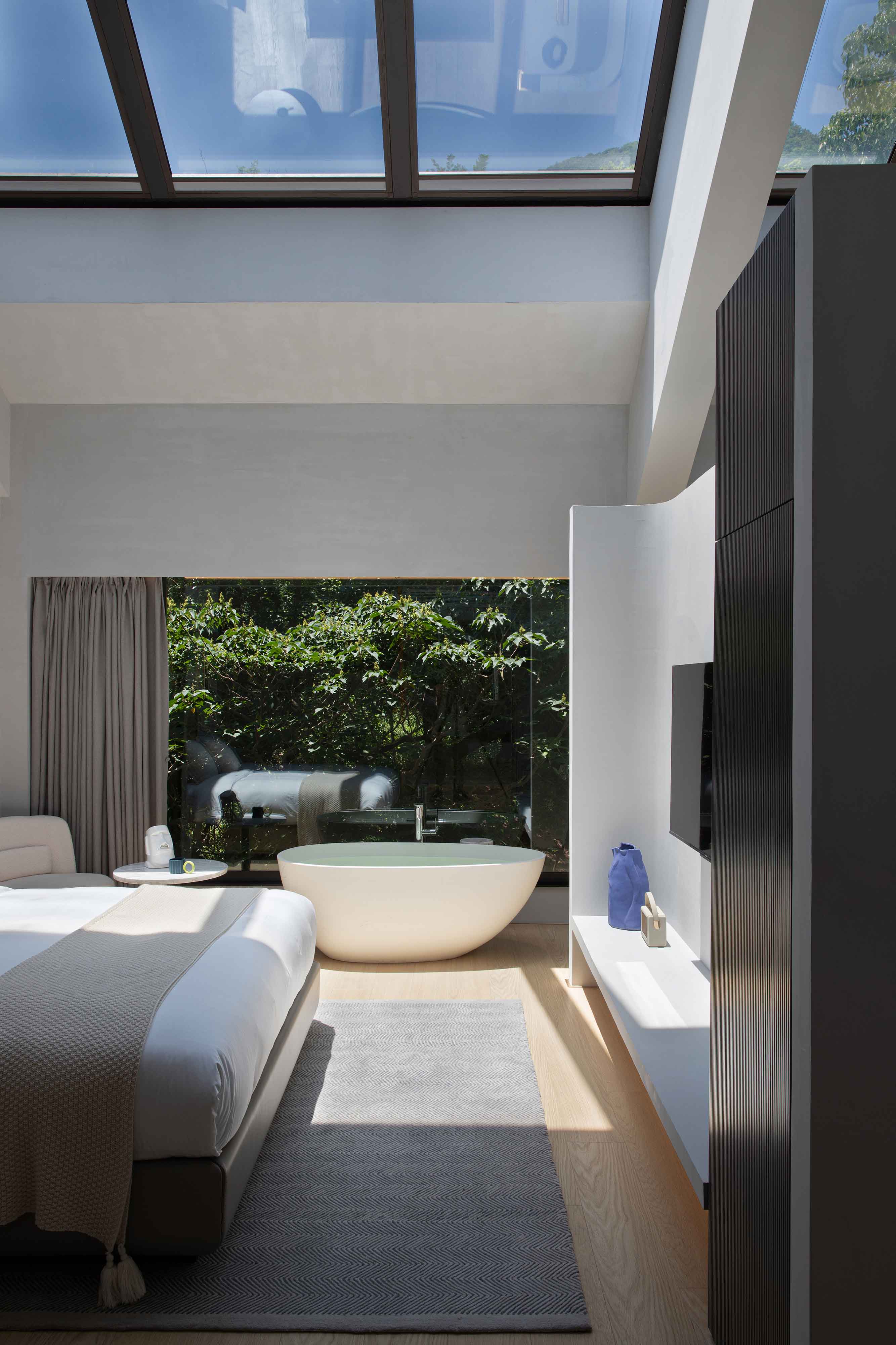 二楼客房的设计手法以简洁大方、干净利落为主,省略了不必要的装饰与色彩,突出自然环境之美。落地窗与星空顶窗就如一副副风景画框,与一年四季、山川海岛一同做成装点房间的画面,带游客走进风光不与四时同的如诗美卷。