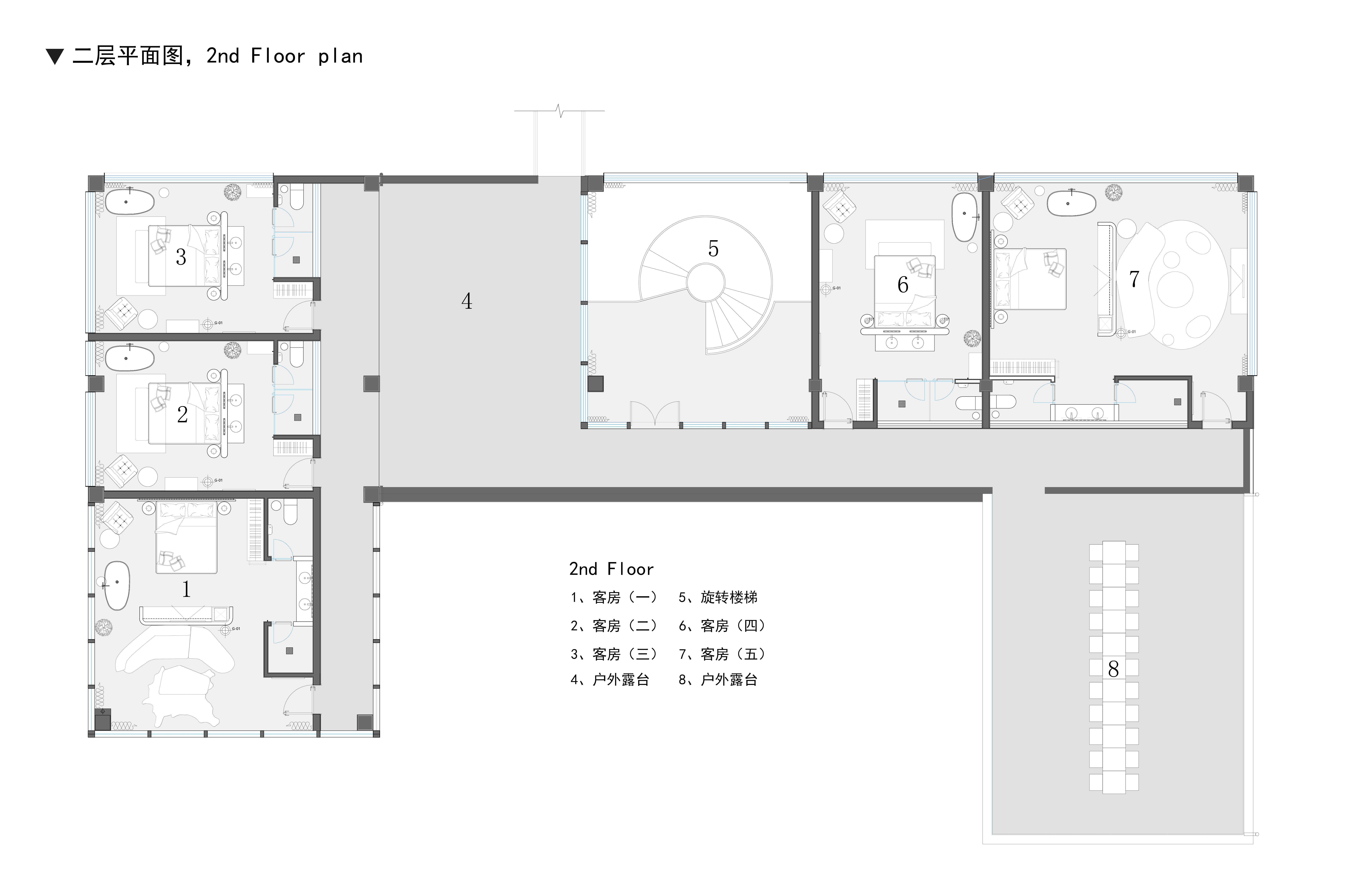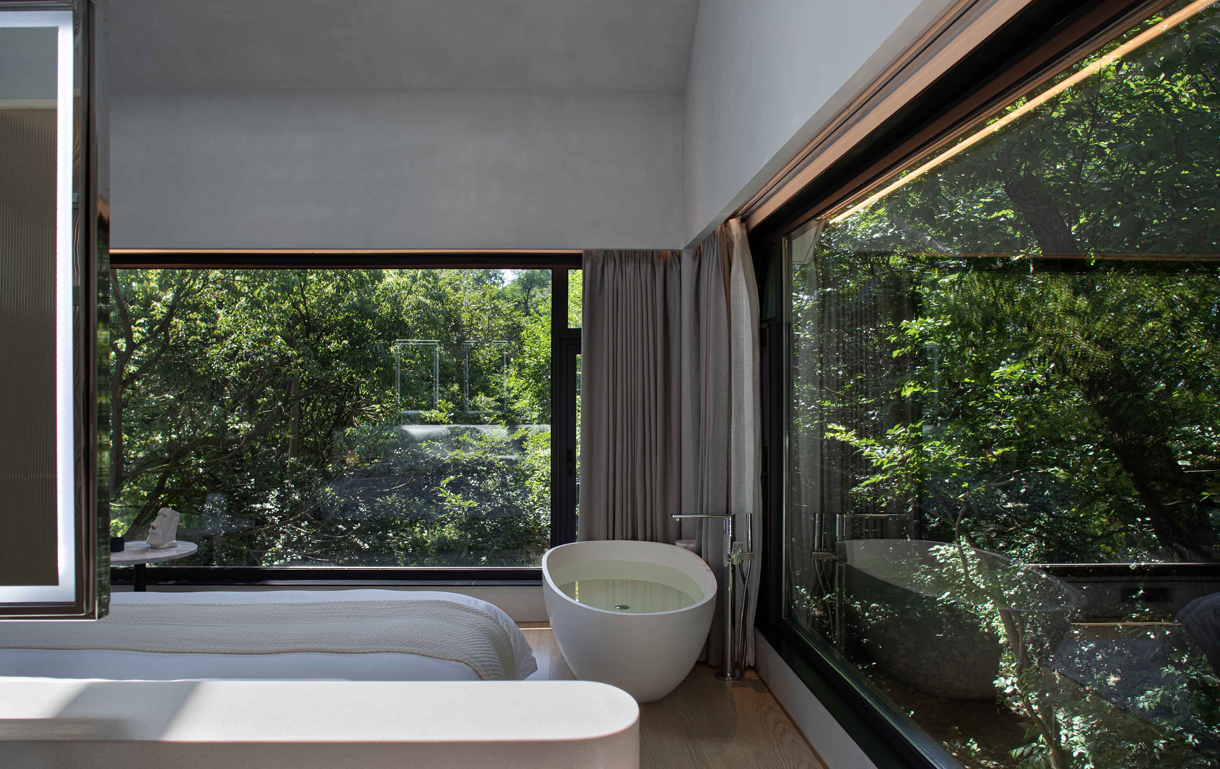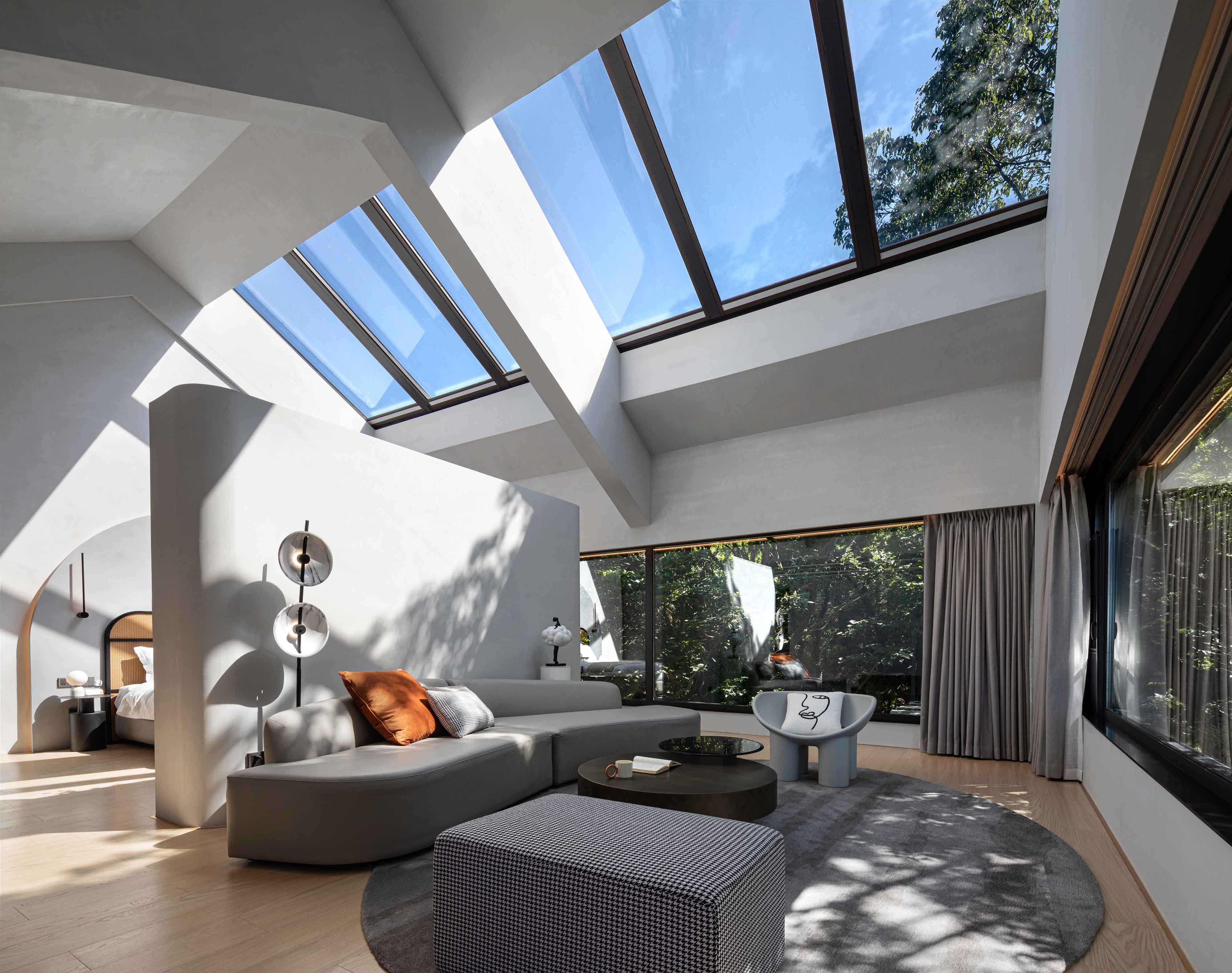 二楼客房的设计手法以简洁大方、干净利落为主,省略了不必要的装饰与色彩,突出自然环境之美。落地窗与星空顶窗就如一副副风景画框,与一年四季、山川海岛一同做成装点房间的画面,带游客走进风光不与四时同的如诗美卷。