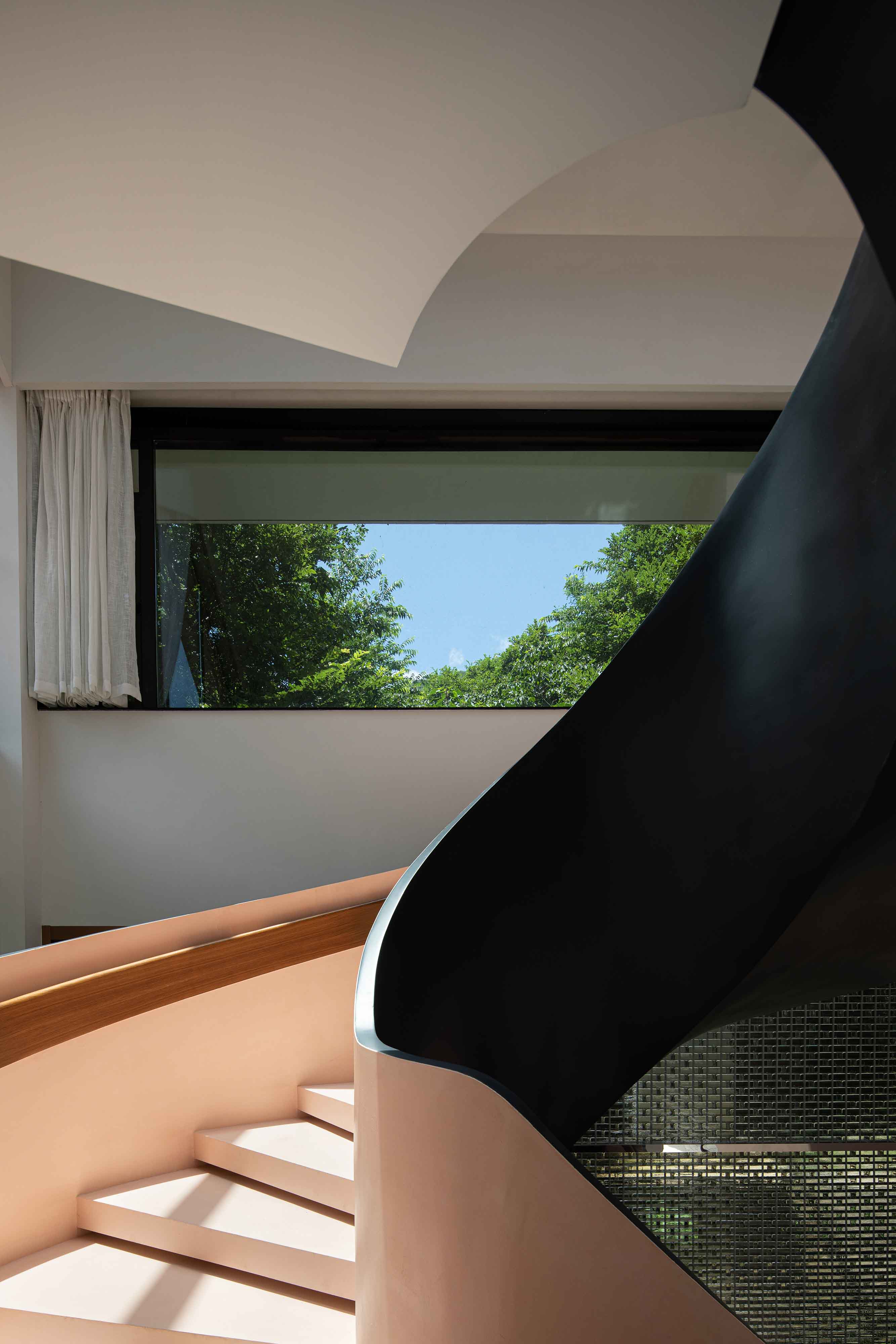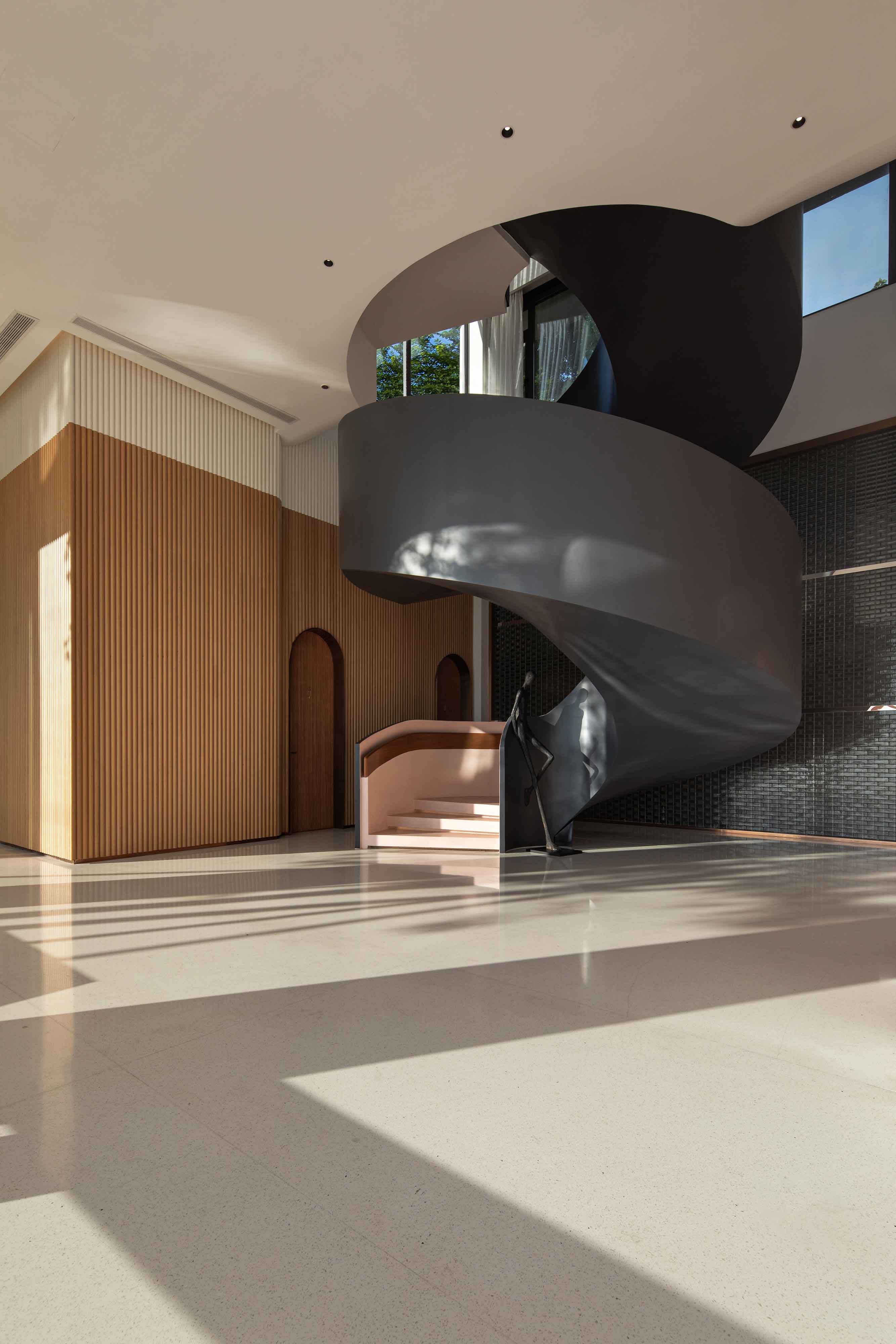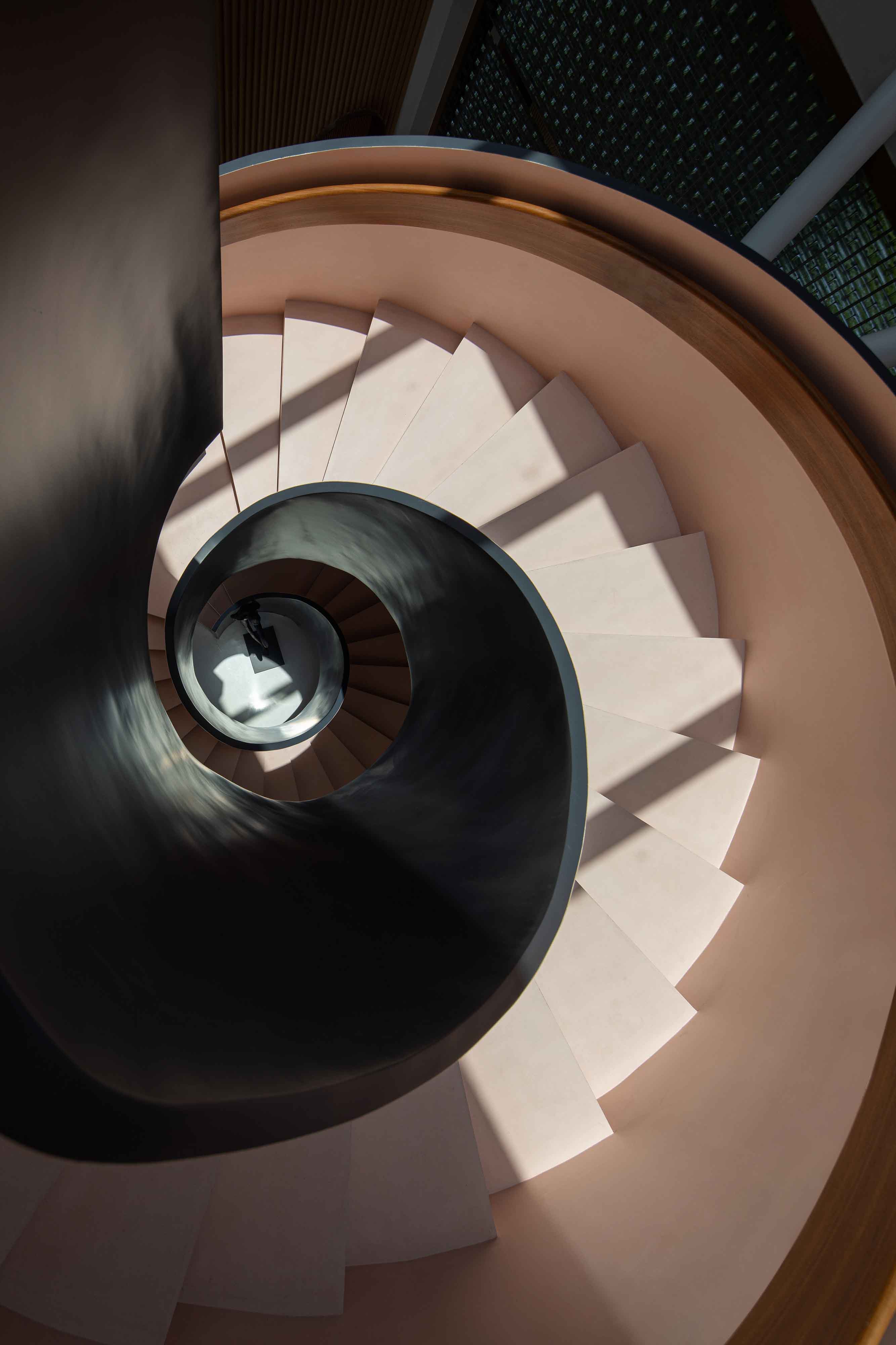 连通一二两层的是一架线条流畅的旋转楼梯于建筑中心处,打破建筑布局硬朗的直线型,成为室内空间设计一道独特的风景。