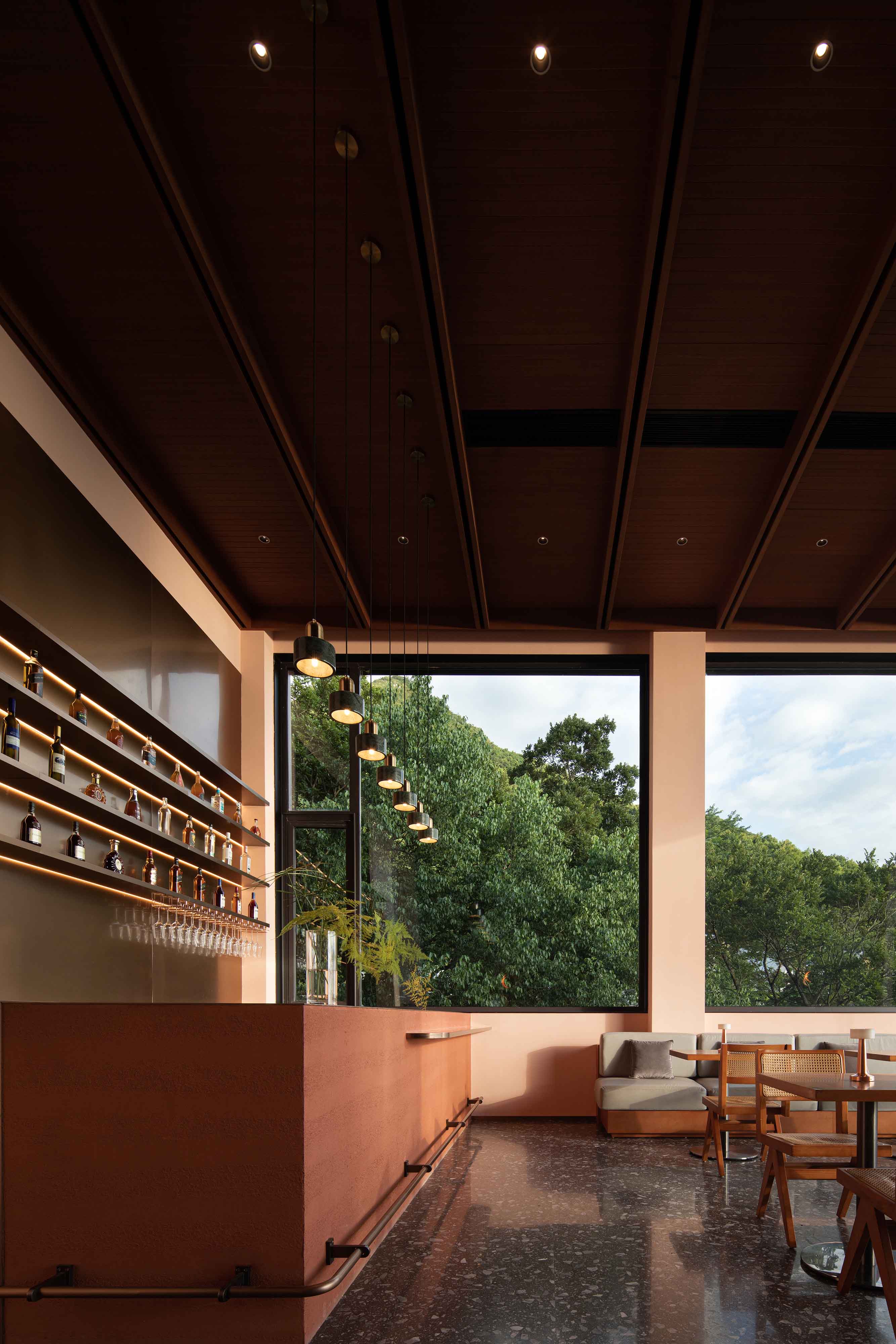 厅内装饰大面积玻璃幕墙,框取东部舒缓的青山与正对面海天一色的美景,西侧以火山岩拼贴的石材装饰墙体与寂静的海面形成鲜明对比,留给人们海浪即将拍打岩石的无限遐想。