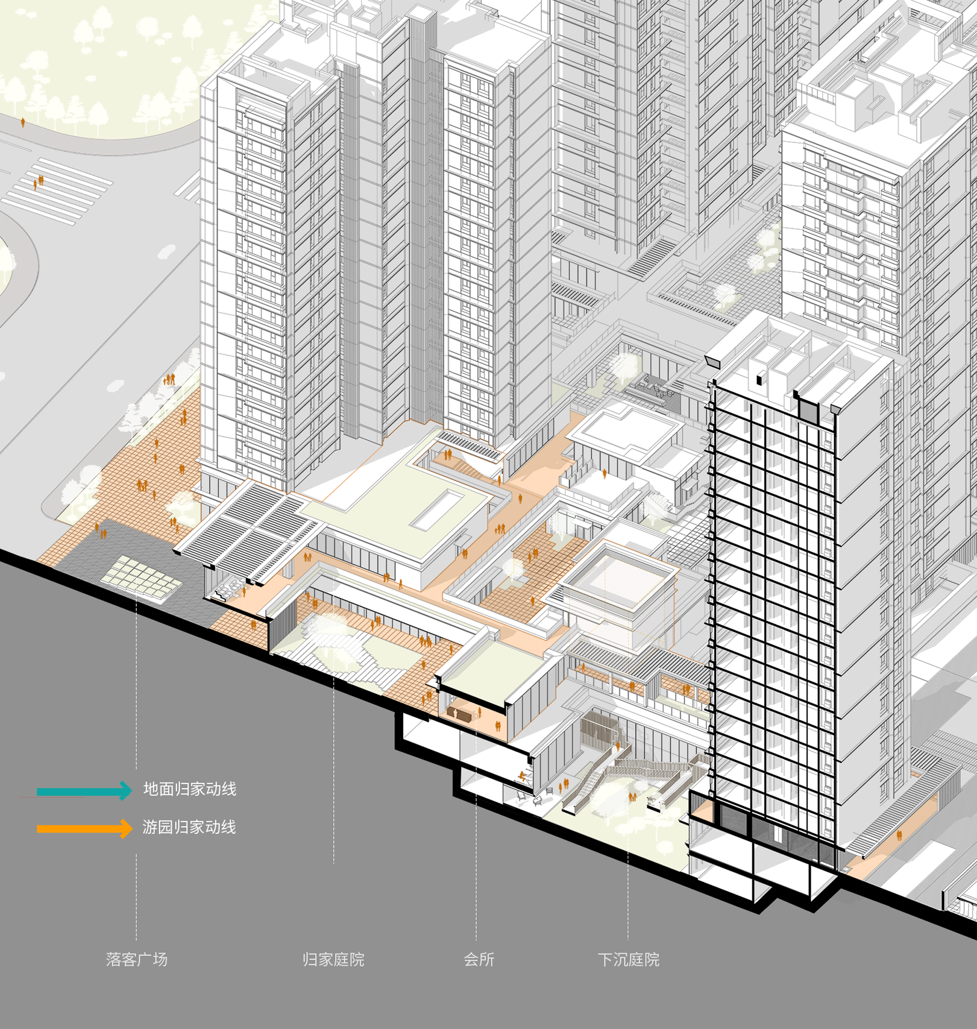 南侧四座住宅楼栋的业主拥有多样的归家方式。可通过地面商业街直接抵达楼栋电梯厅,以获得“无缝衔接城市烟火气”的便捷体验;也可选择更具仪式感和私密性的方式:穿过商业街、抵达住区二层通高大堂,门禁刷卡后步入电梯直达二层的专属屋顶花园入户。立体化的动线系统帮助每一座楼栋的业主在享受城市活力的同时,依然保有居住的私密感和价值感。