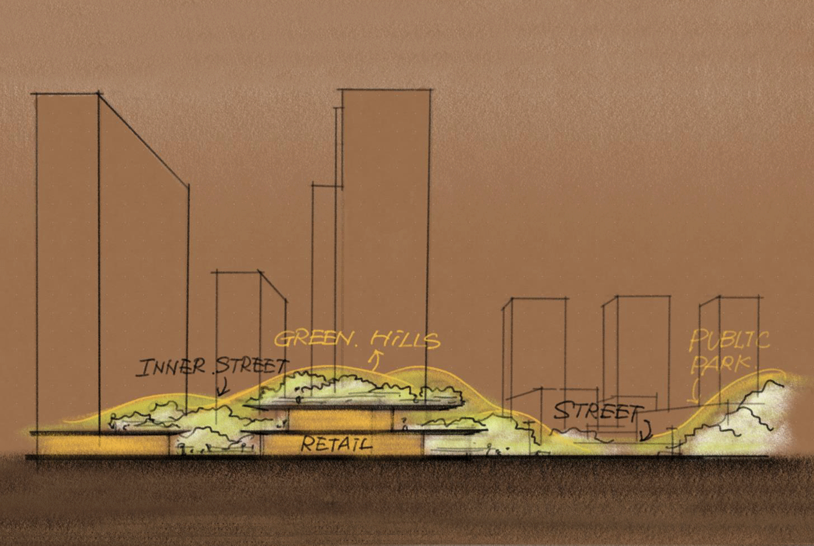 建筑师与景观团队密切合作,在设计中强化自然景观元素与建筑的互动关系,以实现高品质的整体环境。地块南边界被设想为一道三维立体的“城市绿丘”。从人行道地面延伸至商业街多标高处的绿色元素营造了宜人、健康的微环境,也补足了从江浦公园到滨水绿化带的绿色生态体系。