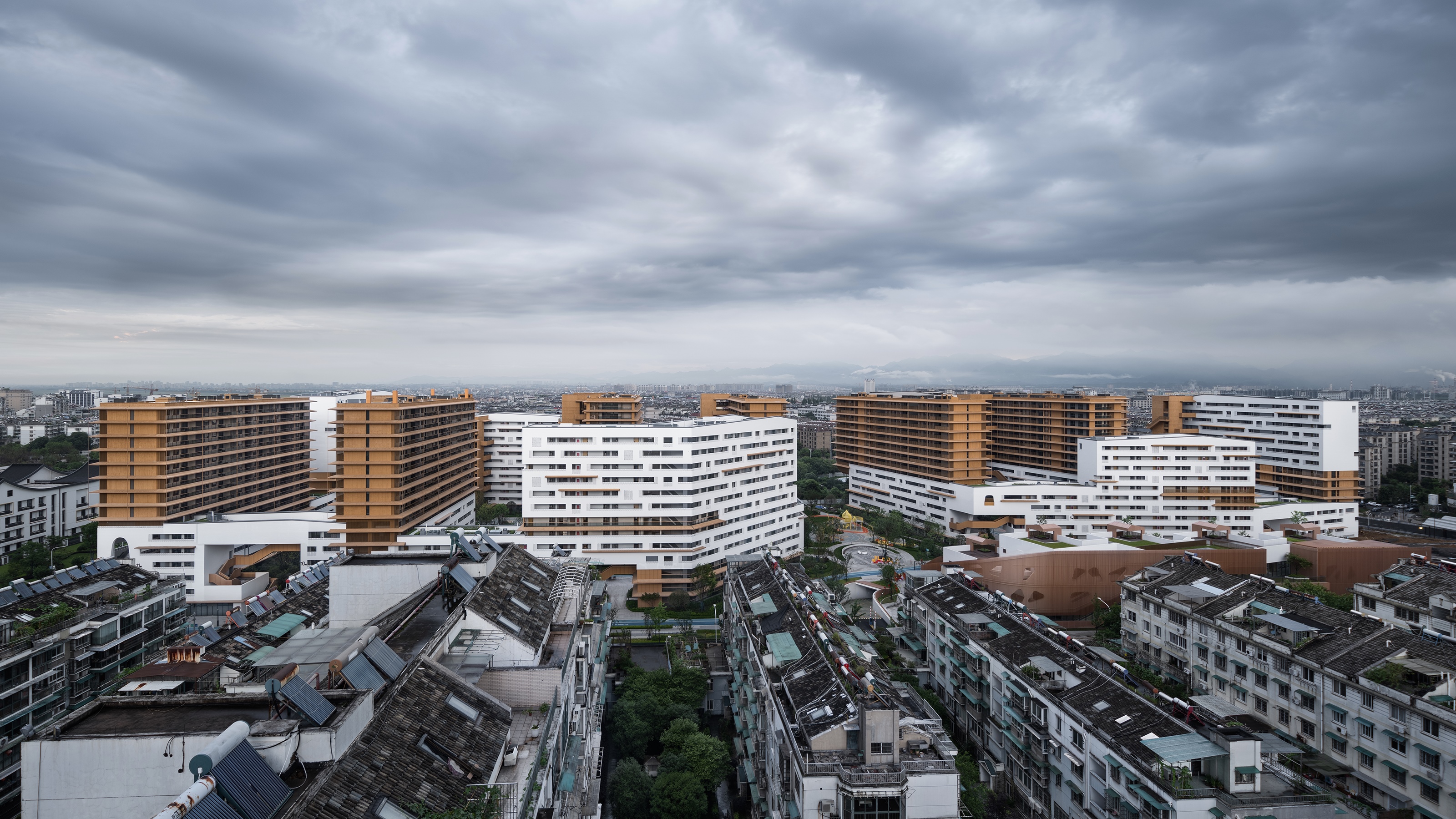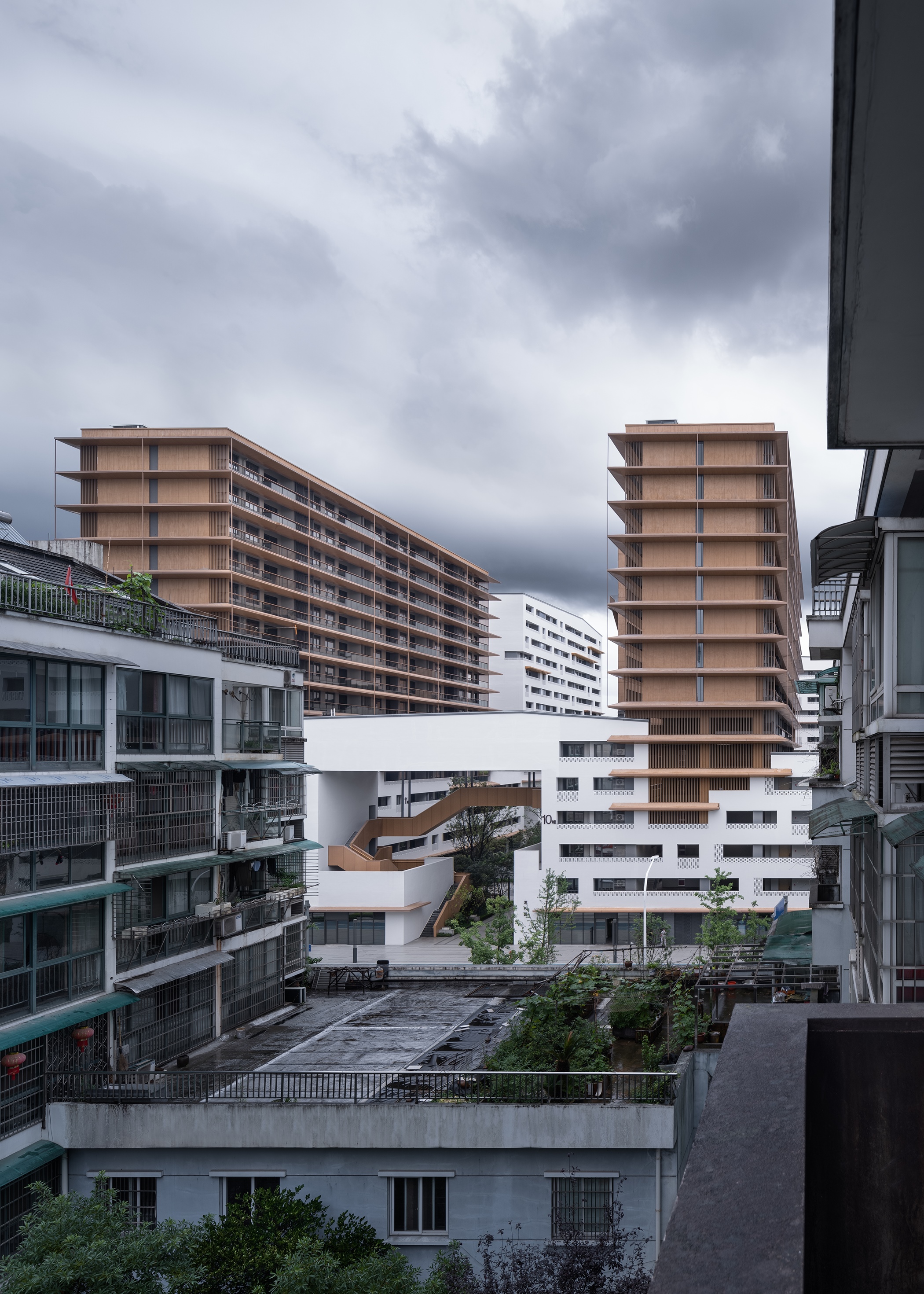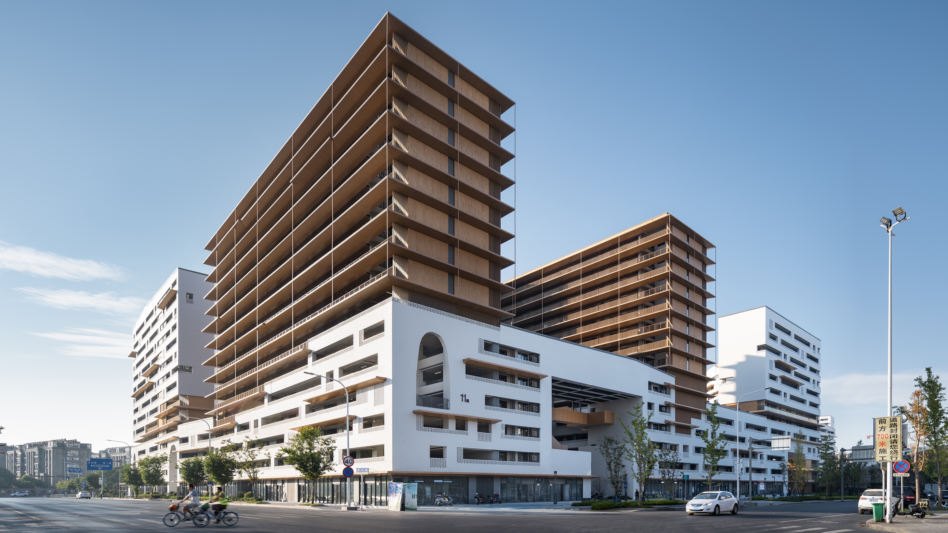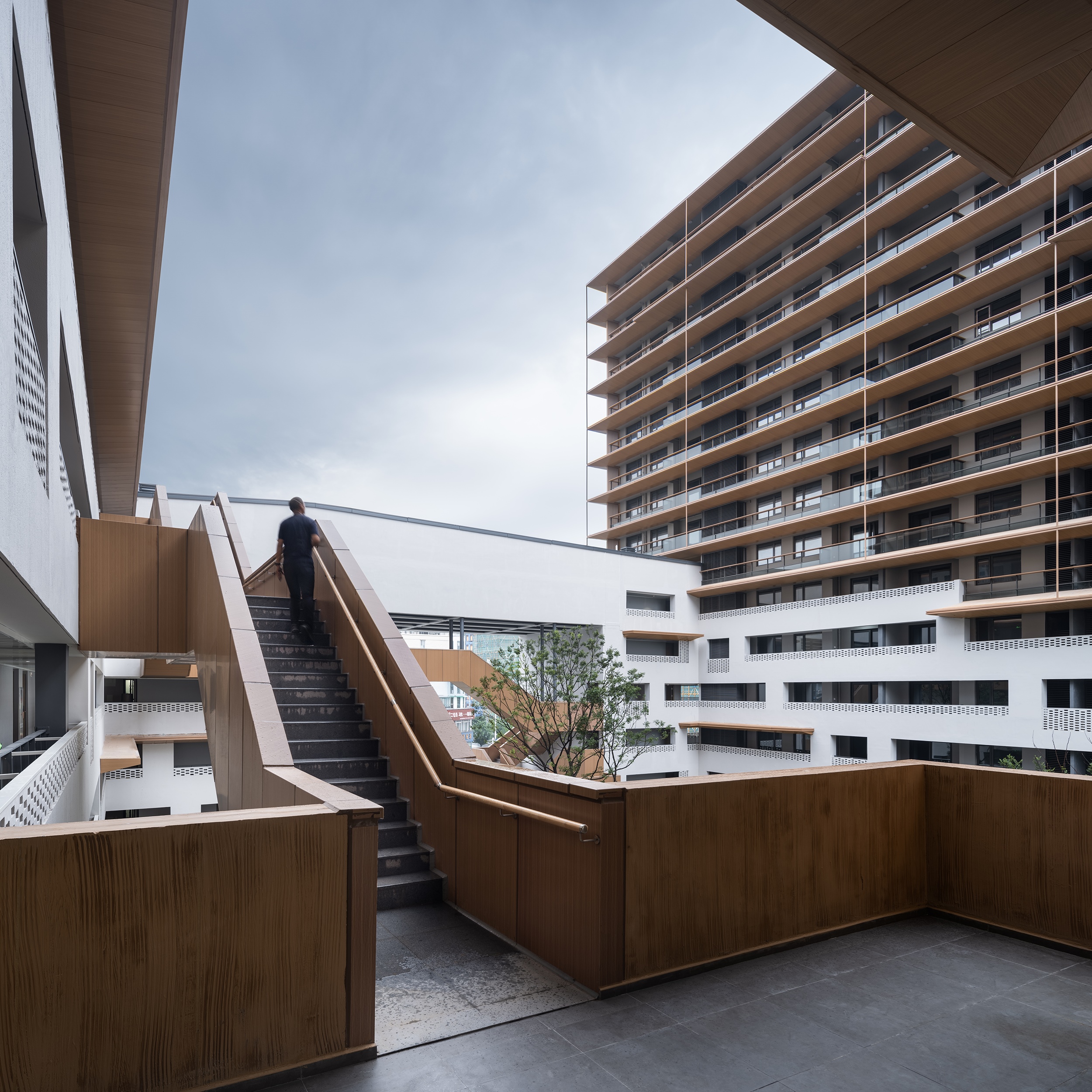 To make the space scale more intimate and comfortable, we use white and wood grain paint to divide the upper and lower space of 7 floors; Prefabricated hollow bricks are used for the east-west facade, so that sunshade and heat insulation are realized with the low-cost physical energy-saving method. We are inspired by the ancient city gate and traditional residence of Quzhou in terms of form: the large-scale ancient city arch doorway enhances the sense of ritual for residents to go home, and the horizontal cornices on the high-rise facade evoke the Quzhou memory of “old houses with cornices”, and have water-proof, rain-proof and other practical functions.