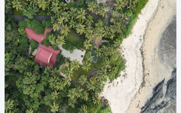 The hardscape is planned with the intention of maximising permeable surfaces to increase rainwater infiltration, recharge groundwater store, and reduce stormwater runoff. The driveway and paths are concrete-free, made of rubble and gravel, blending in seamlessly with the softscape. In the front garden, leftover brick cinder from construction has been crushed and reused as gravel. The brick absorbs water, and evaporation manifests a cooling effect. This red gravel is juxtaposed against a platform of granite slabs that host an al fresco dining area, decorated with boulders, and cascading fern chandeliers hanging from the trees. The slabs rest on compacted soil, avoiding cement mortar fixing. The poolside pavilions are also cement-free, employing natural thatch roofs to complement the beach-front atmosphere.