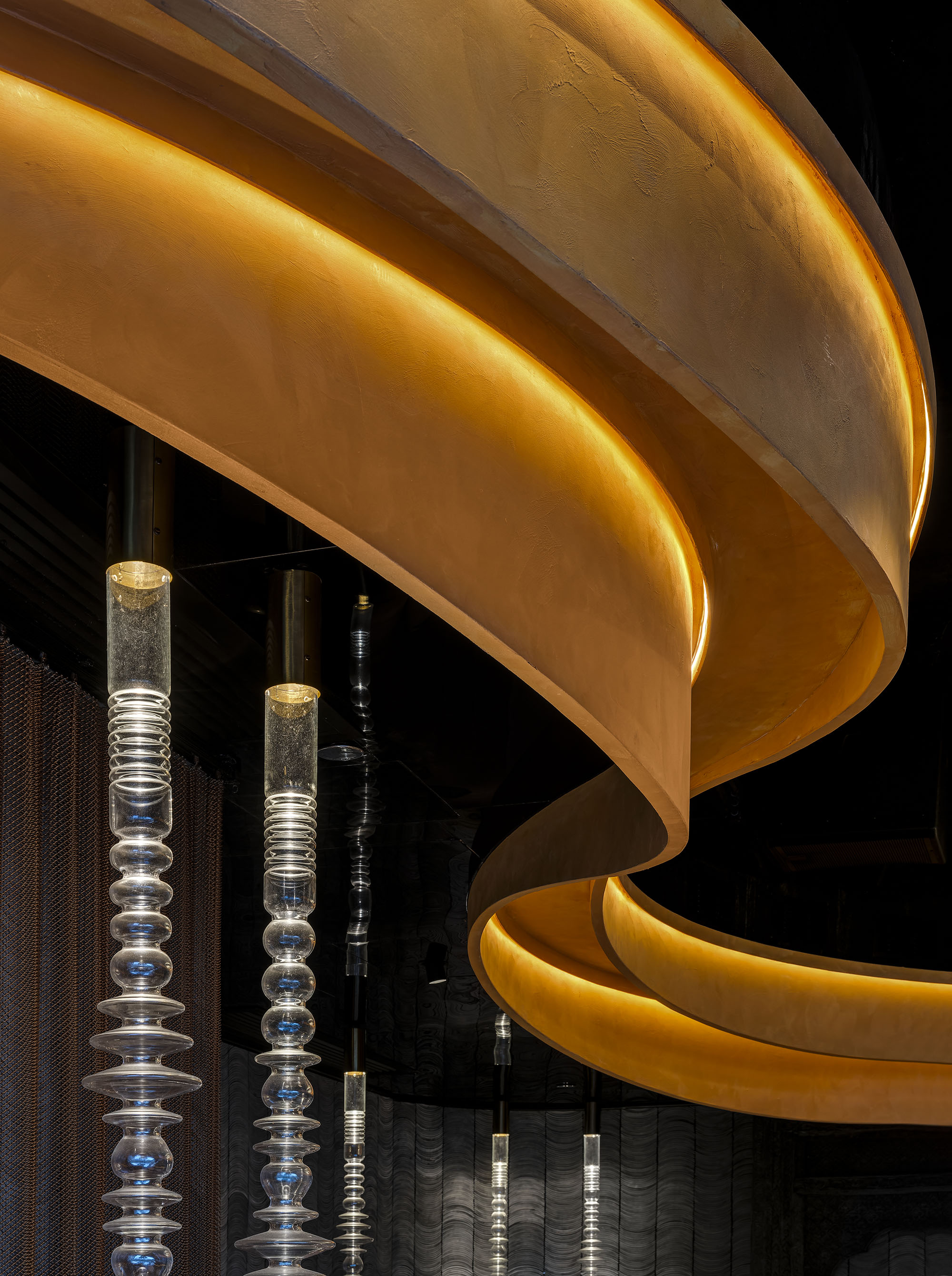 所有元素似乎都是舞动的动态,水波纹不锈钢材质的吧台是正在流动的恒河水,轻盈飘动的天花和沙发造型是随风而动的纱丽,这一幕上演的正是一位正在恒河上婆娑起舞的女子,或柔和或流畅或富有节奏,皆为游走空间的舞步增添了几分旖旎。