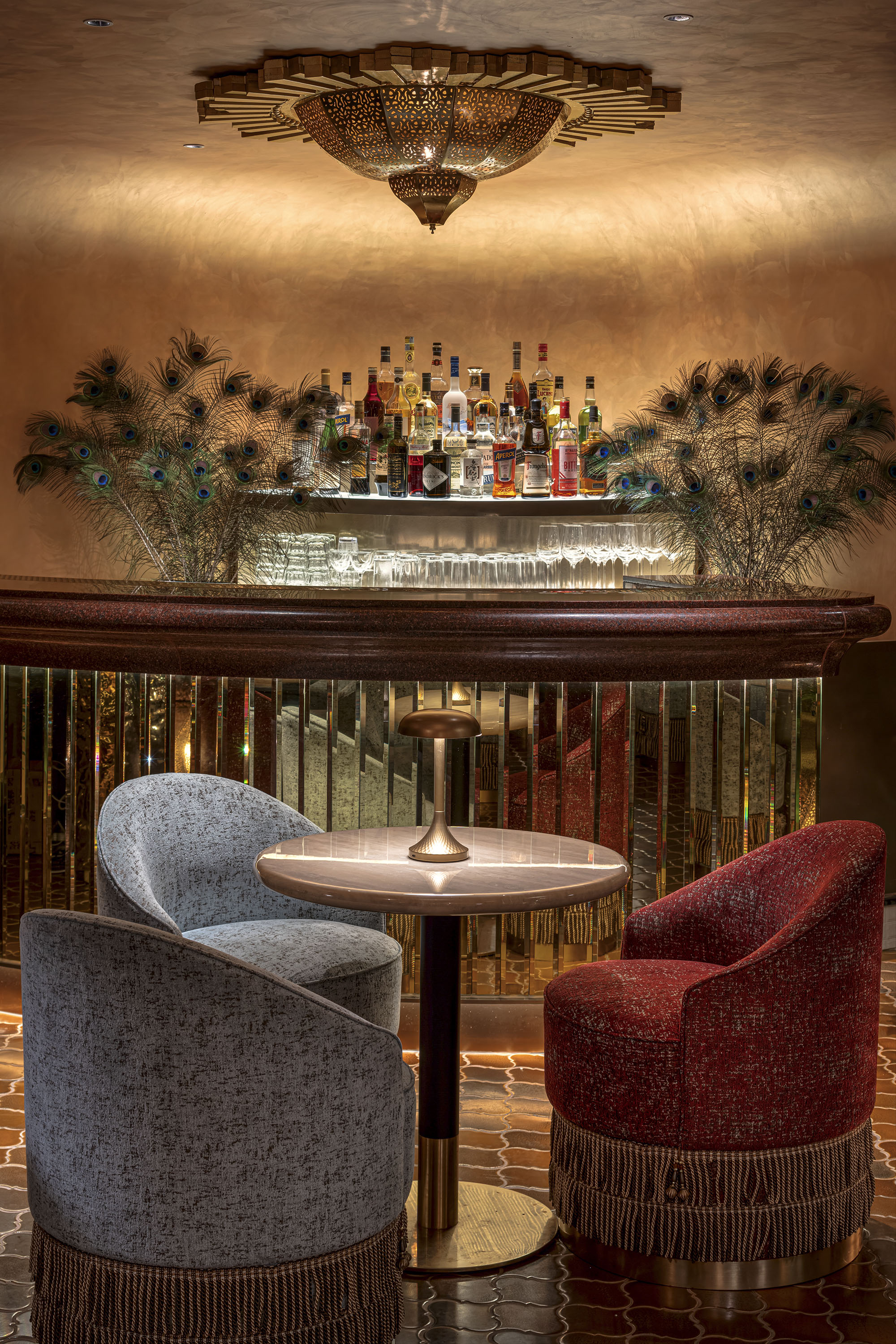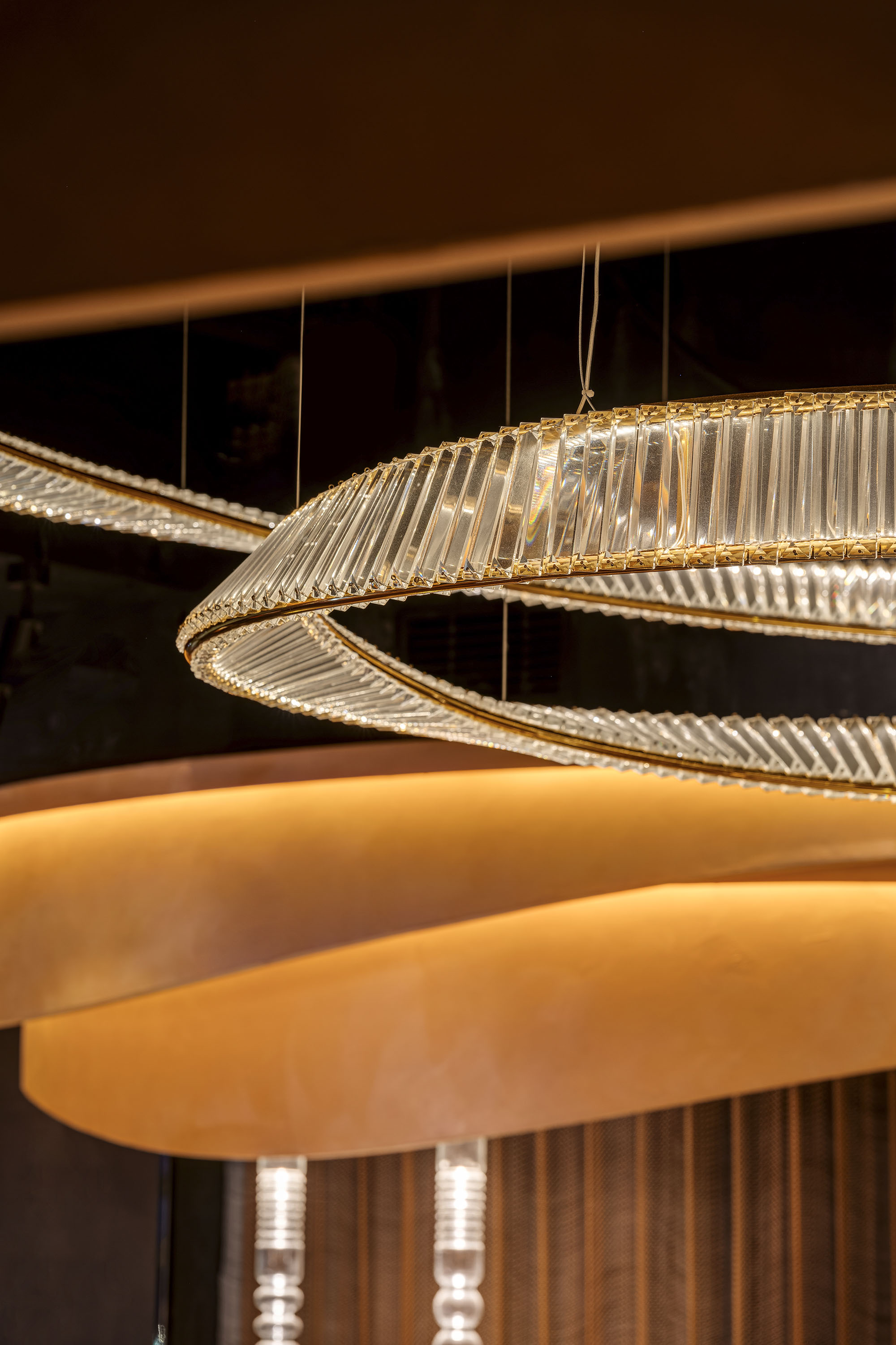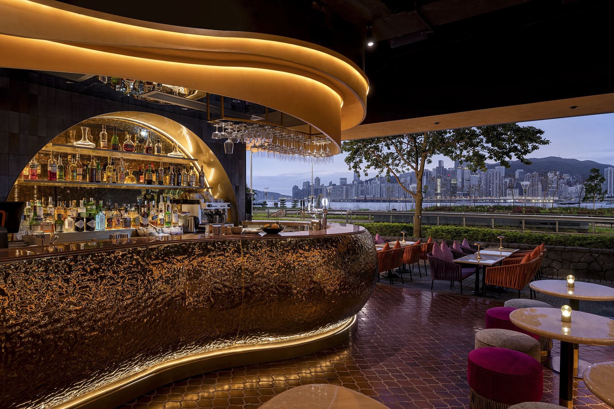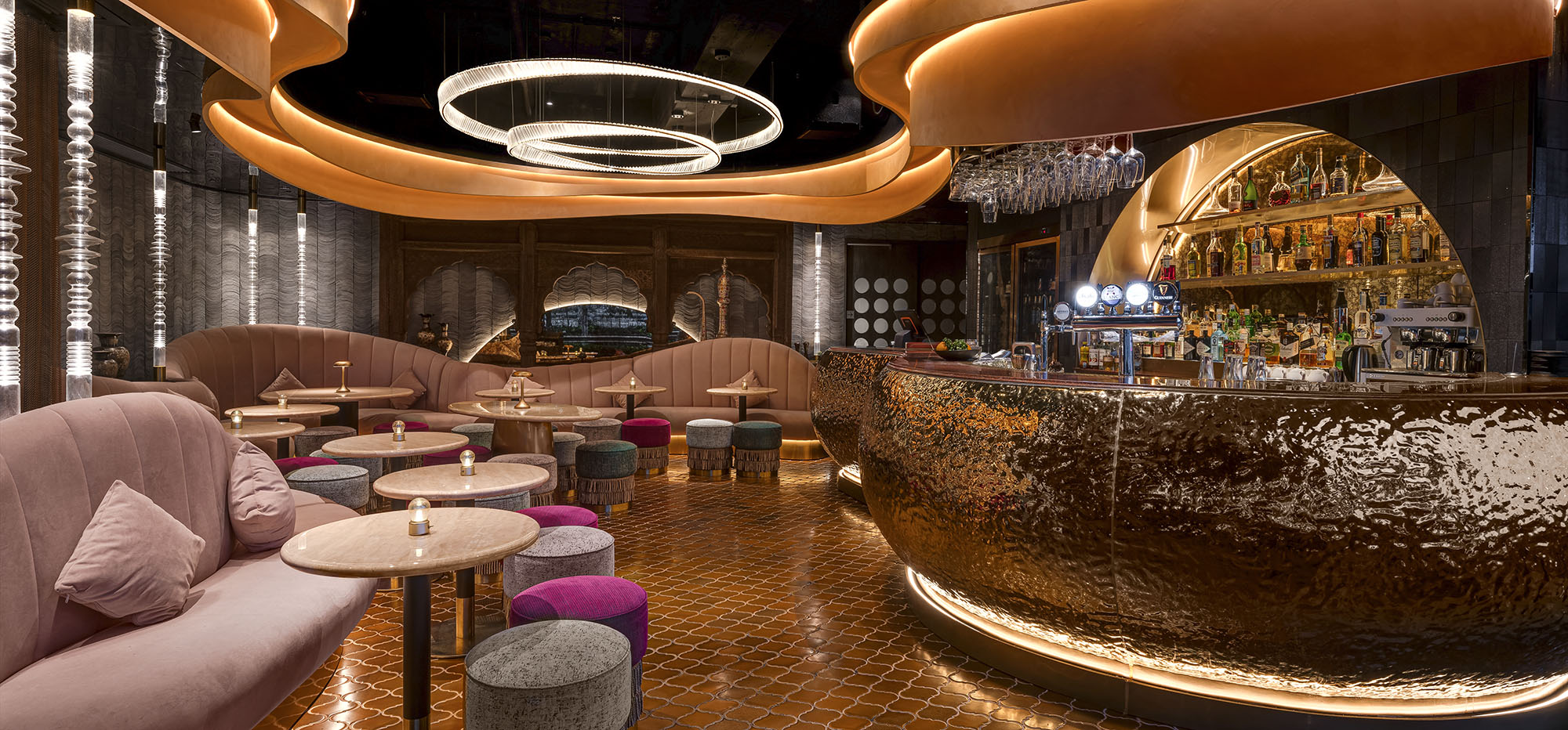 All elements in Bushra seem to be dancing and dynamic. The water ripple stainless steel bar counter is like the flowing Ganges River, the light floating ceiling and sofa are shaped like veils fluttering in the wind. This scene is reminiscent of an Arab woman dancing on the Ganges River.