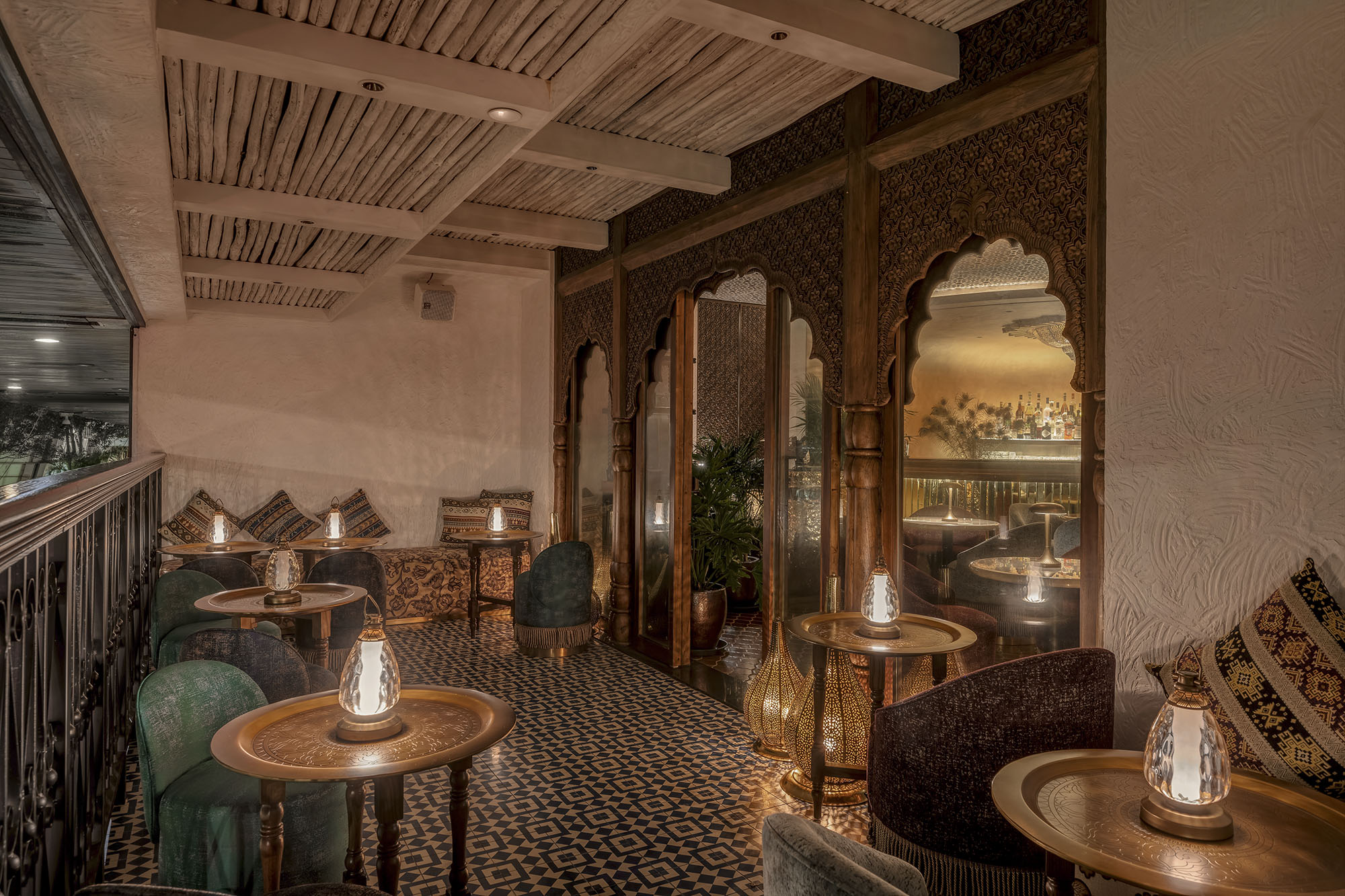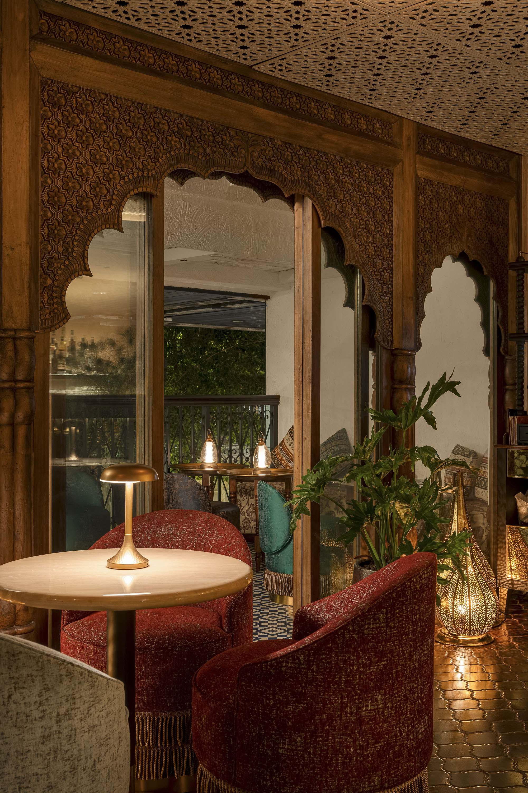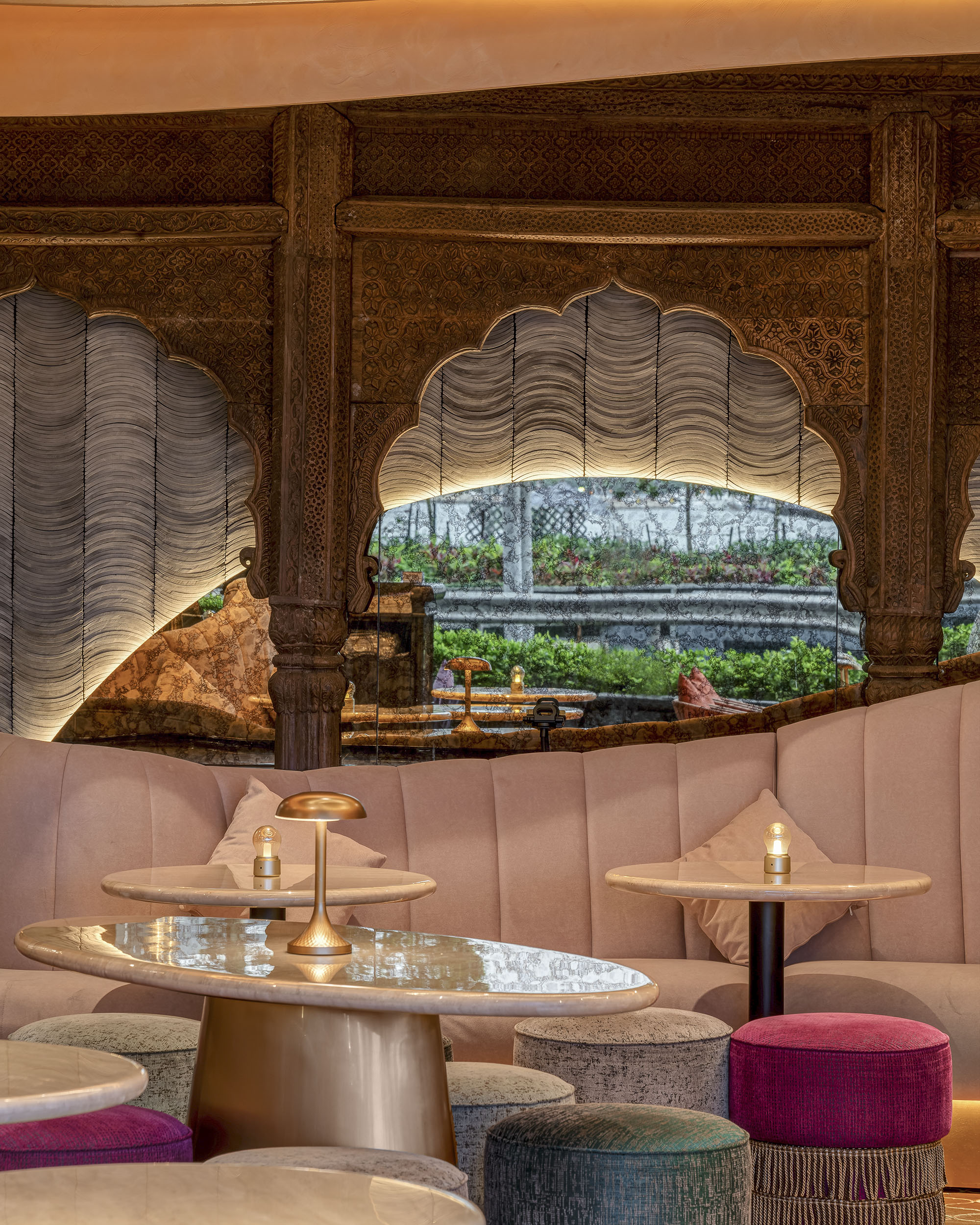 光影游离,觥筹交错,设计师营造的灯光氛围改变了人在此空间的时间和空间感知,在影影绰绰的光影间仿佛化身时间旅人穿越百年前的印度建筑内,在时间交错间嵌入印度独特的历史文化。