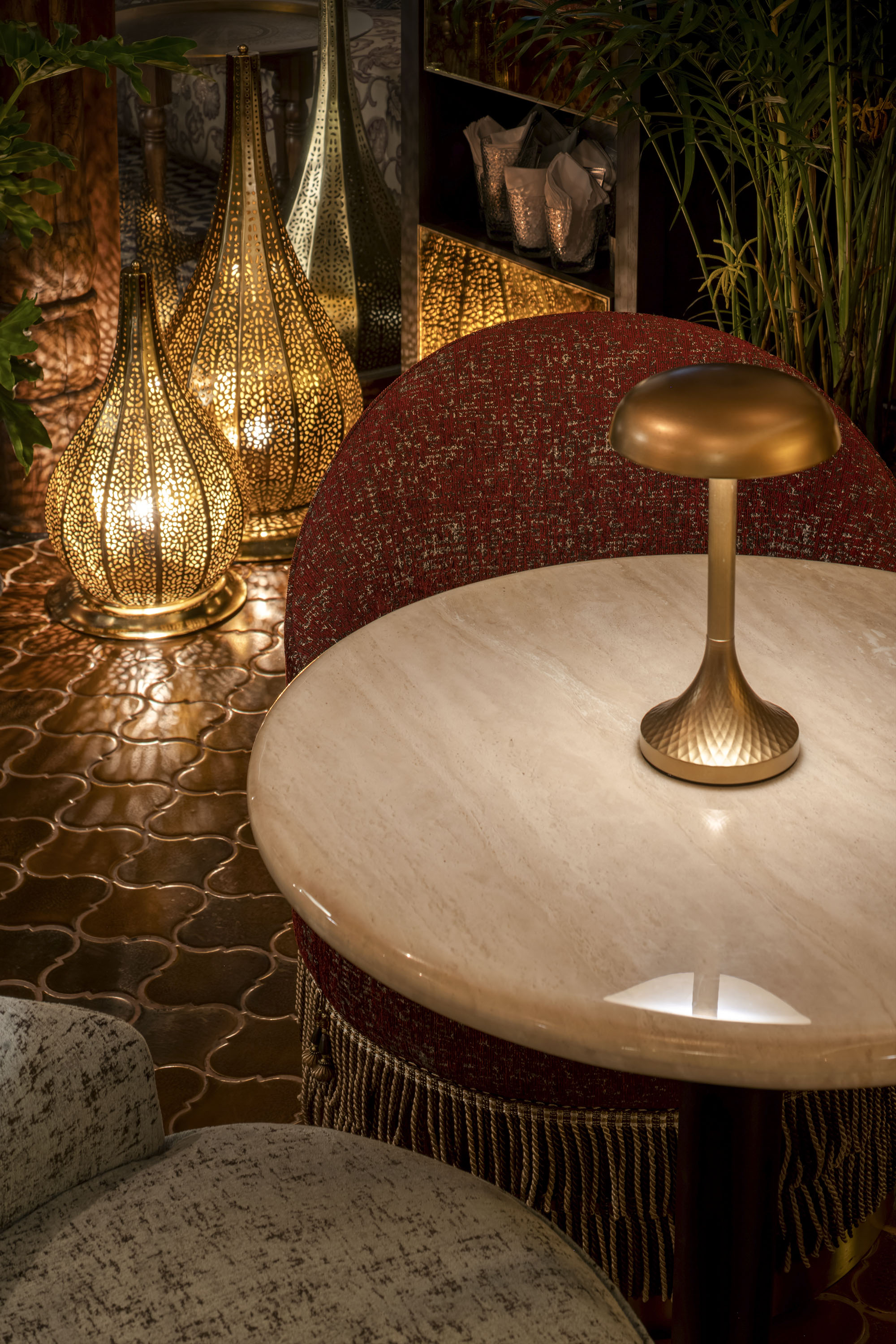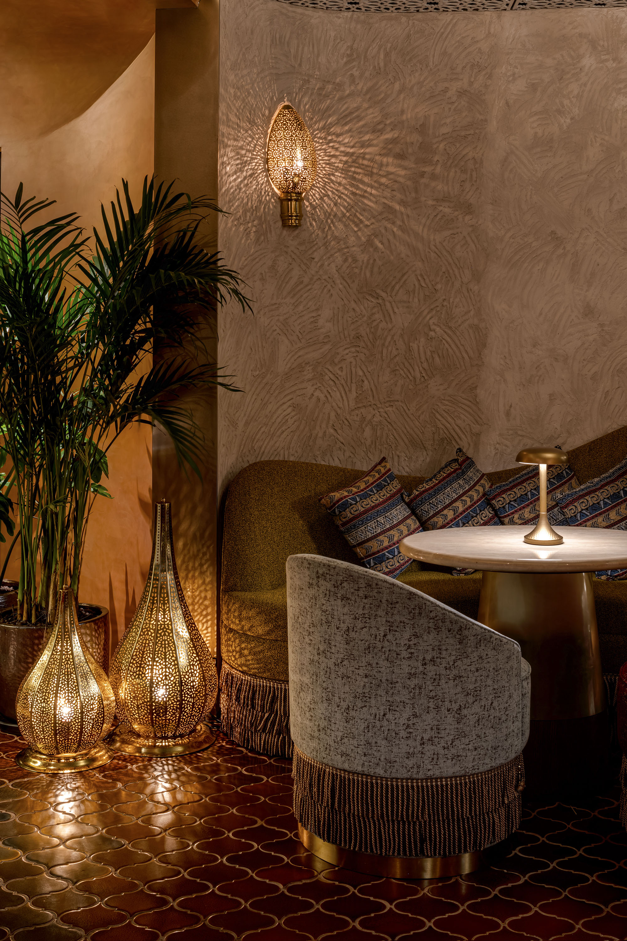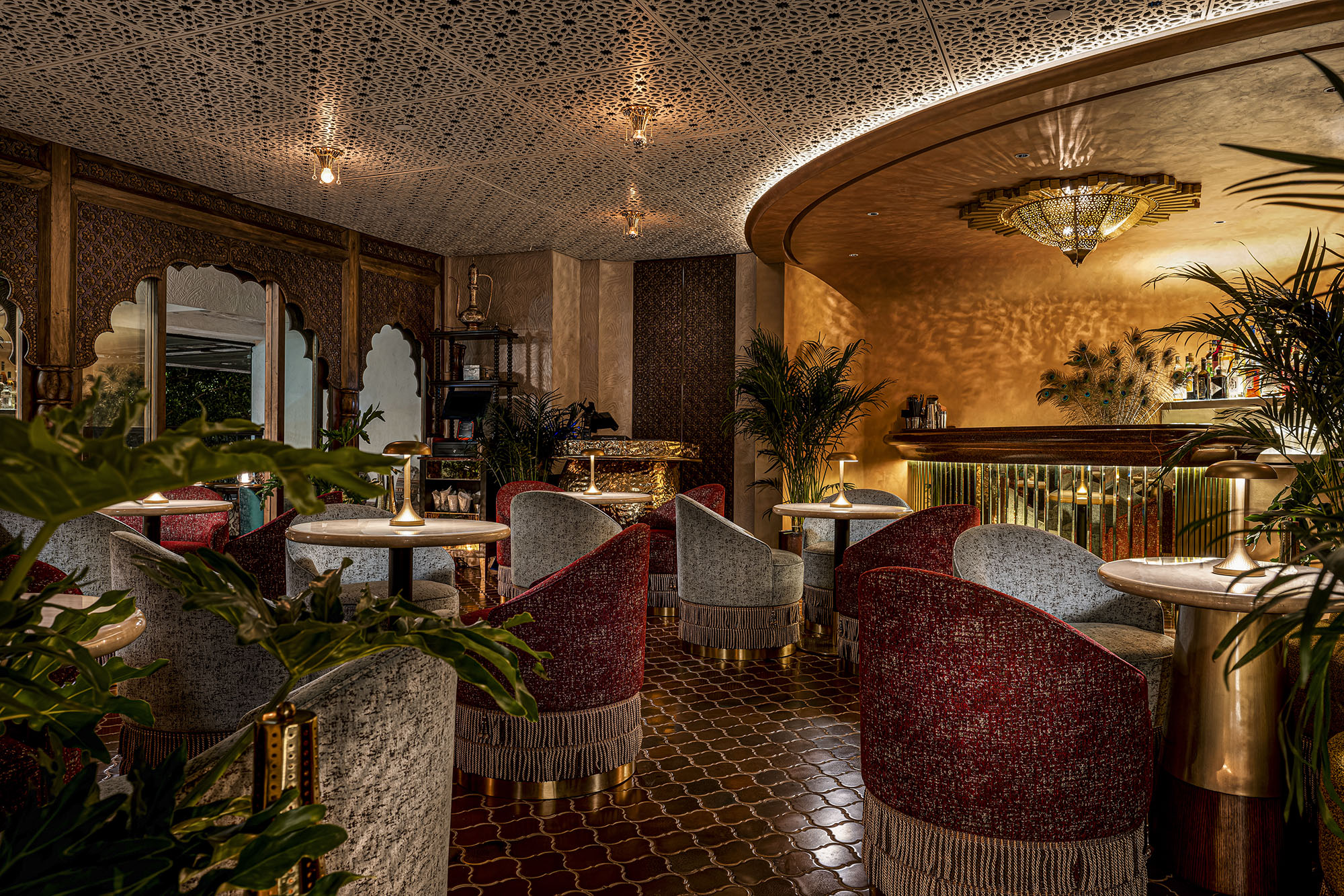 兼顾餐厅与水烟吧功能的Bushra,设计师通过灯光将截然不同的两种环境氛围以戏剧启幕和闭幕的状态表达两种空间情态。幕布缓缓落下,灯光亮起,灯烛辉煌的意境是用餐时的氛围;灯光逐渐暗去,一场异域风情的舞蹈表演渐渐显现,此时已悄然转换为水烟吧的专属舞台。