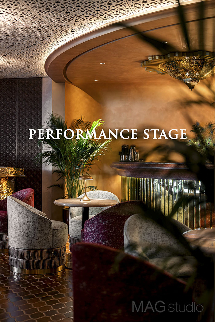 幕布缓缓落下,灯光亮起,灯烛辉煌的意境是用餐时的氛围;灯光逐渐暗去,一场异域风情的舞蹈表演渐渐显现,此时已悄然转换为水烟吧的专属舞台。