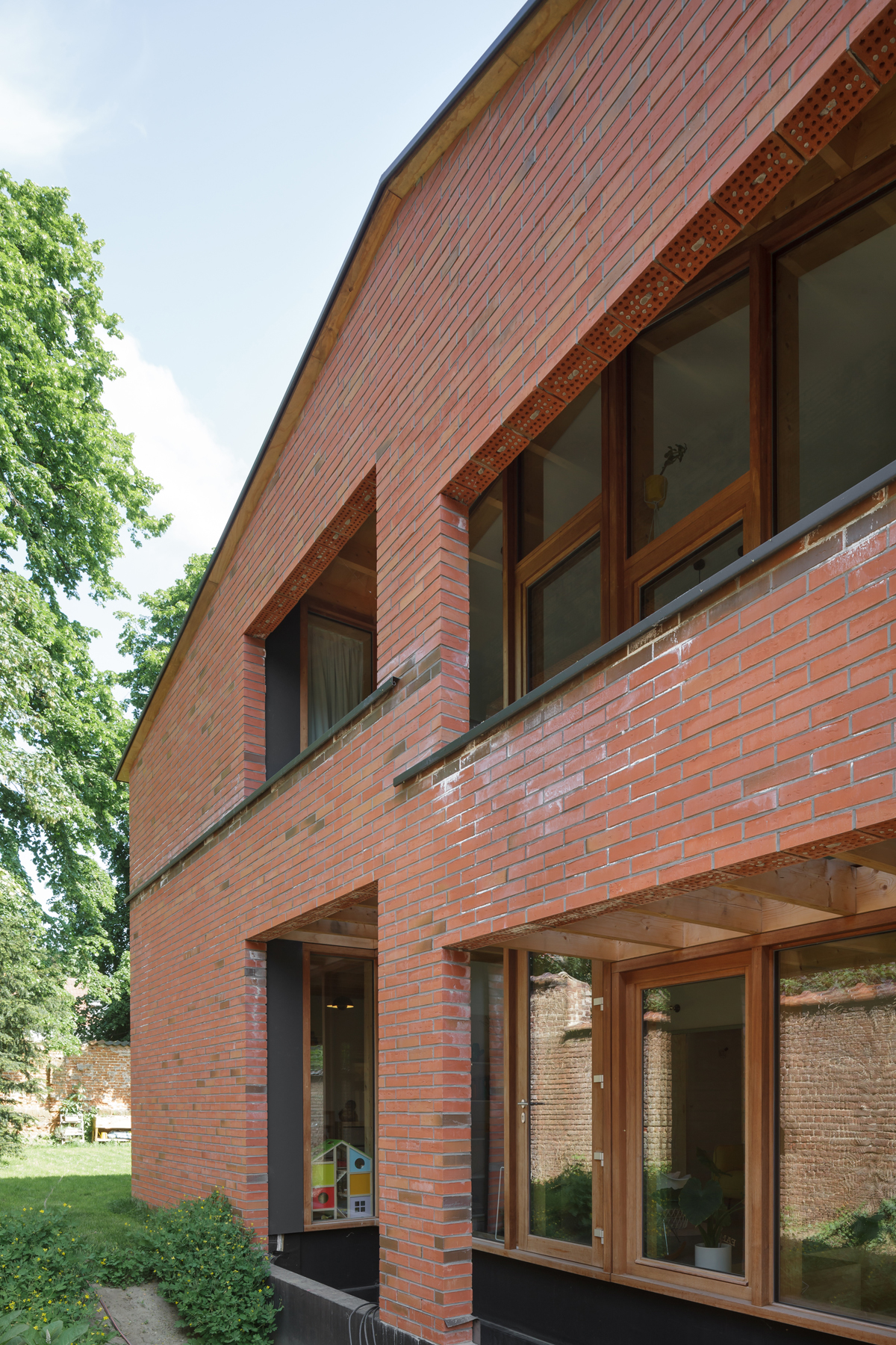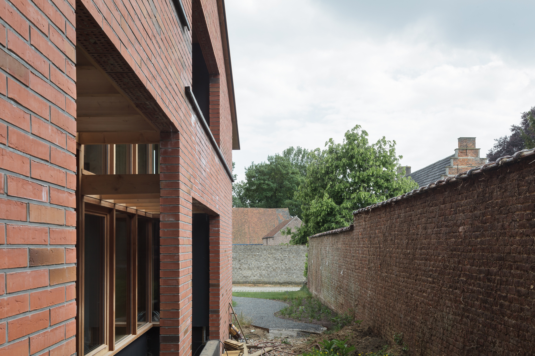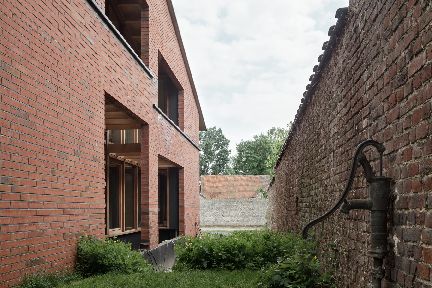 The simple house constructed in self-supporting masonry engages in a familiar dialogue with the village. The house reacts to its surroundings and the structure incorporates aspects of it through a precisely articulated tectonic expression. The layered, extremely recognizable setting reminds us of a bygone era: an archetypal village in Flanders, seemingly safeguarded from aggressive post-war housing policies and twentieth-century modernization processes. In an essentialist lecture, this project could be labeled as ‘regionalism’.