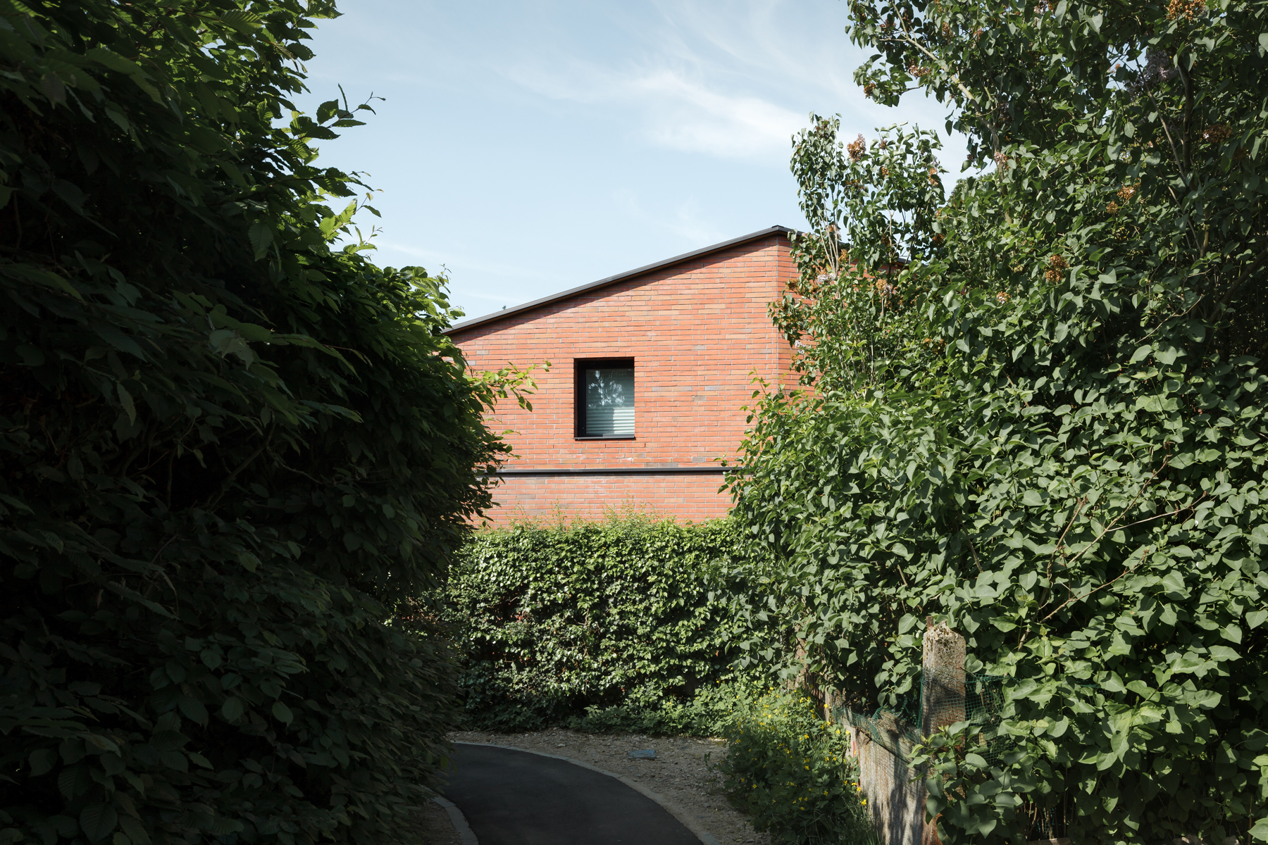 BLAF-architecten built a family home in Erps-Kwerps, a seemingly authentic church village in Flemish Brabant, in the Flemish outskirts of Brussels. The building plot is determined by the man-sized wall of the adjacent garden (a gelbe: a walled garden of a presbytery, a common typology in church villages); a dead-end street paved with cobblestones, designed as an extension of the village square; a wild beech hedge that separates the plot from a footpath that bends off from the plot to leave the village; and a few short-trunked apple trees that hide a banal apartment building on the other side.