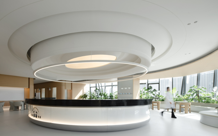 眼睛是心灵的窗户。以品牌符号演变而来的服务台以及灯光装置,如同明亮闪烁的大眼。环形动线的延伸指引清晰的医患动线,同时营造酒店会所般的温馨氛围。