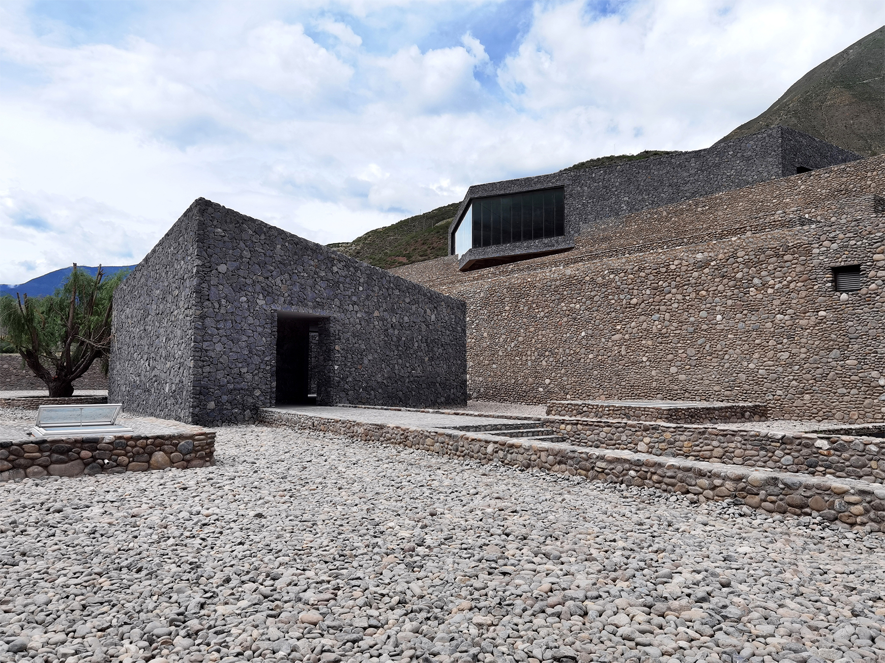 博物馆、餐厅、书吧和接待展示中心所构成的公共空间,则是三块散落在“盐田”上的“山石”,在核桃树的掩映下再构自然场景。外墙材料则就地取材,请当地的藏族工匠用场地现成的山石来砌筑。最终,整体设计就建构出一个诗意的场景:“盐田”逐层向下延续进澜沧江,江边石头之间夹着一棵老树;藏民依然在此牧牛、聚会;酒庄同时成为村民的日常活动空间。