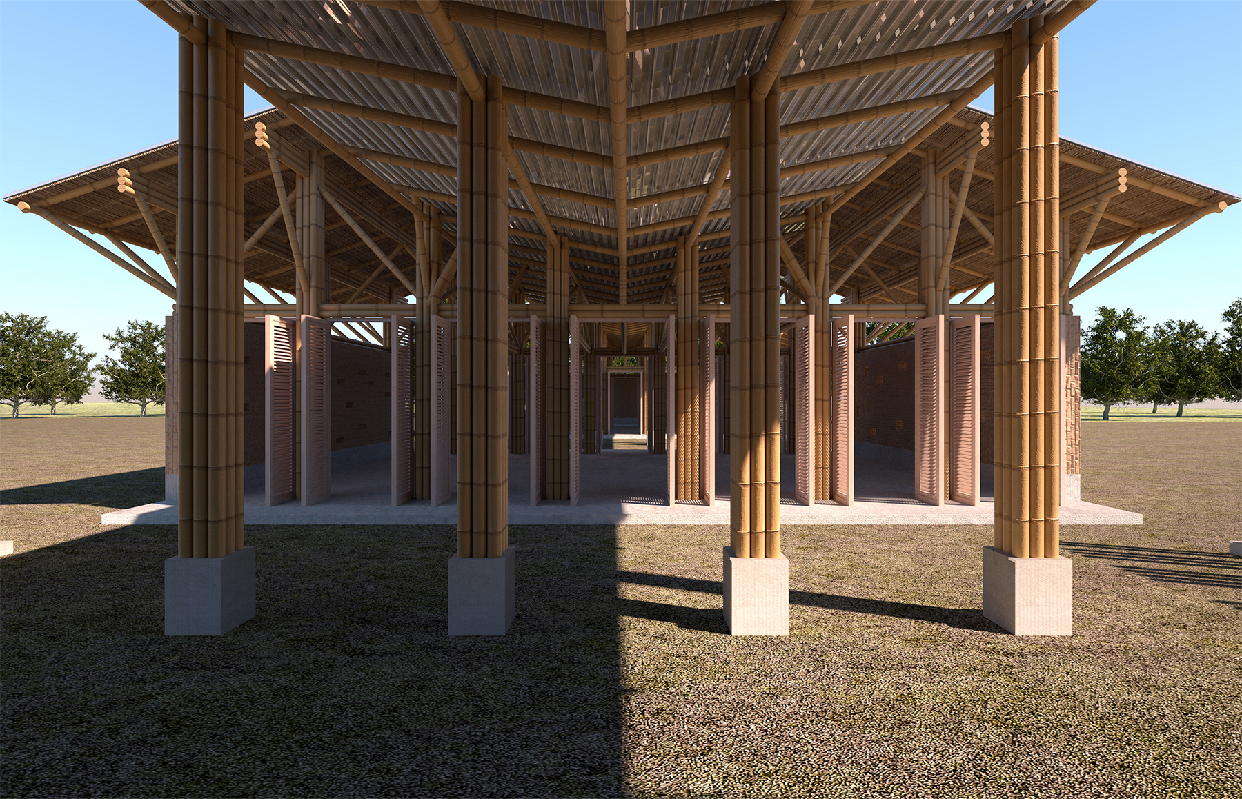 由于线性的排水槽也充当了另一片屋顶的作用,因此,我们就将最外层的斜屋顶从屋脊处打开。开放的屋顶使建筑能够更有效地收集雨水,同时,在为教学空间提供更好的采光和通风,也可以减少热辐射,促进空气对流,并为室内空间提供漫反射光。但有意思的是,这个建筑可以灵活地转换功能。当学校在休课期间,教学空间可以直接转变为乡村活动中心。这时,沿着水槽形成的中央通道,将三个教室空间划分为六个不同的村民活动空间。