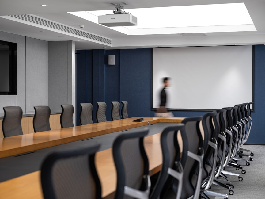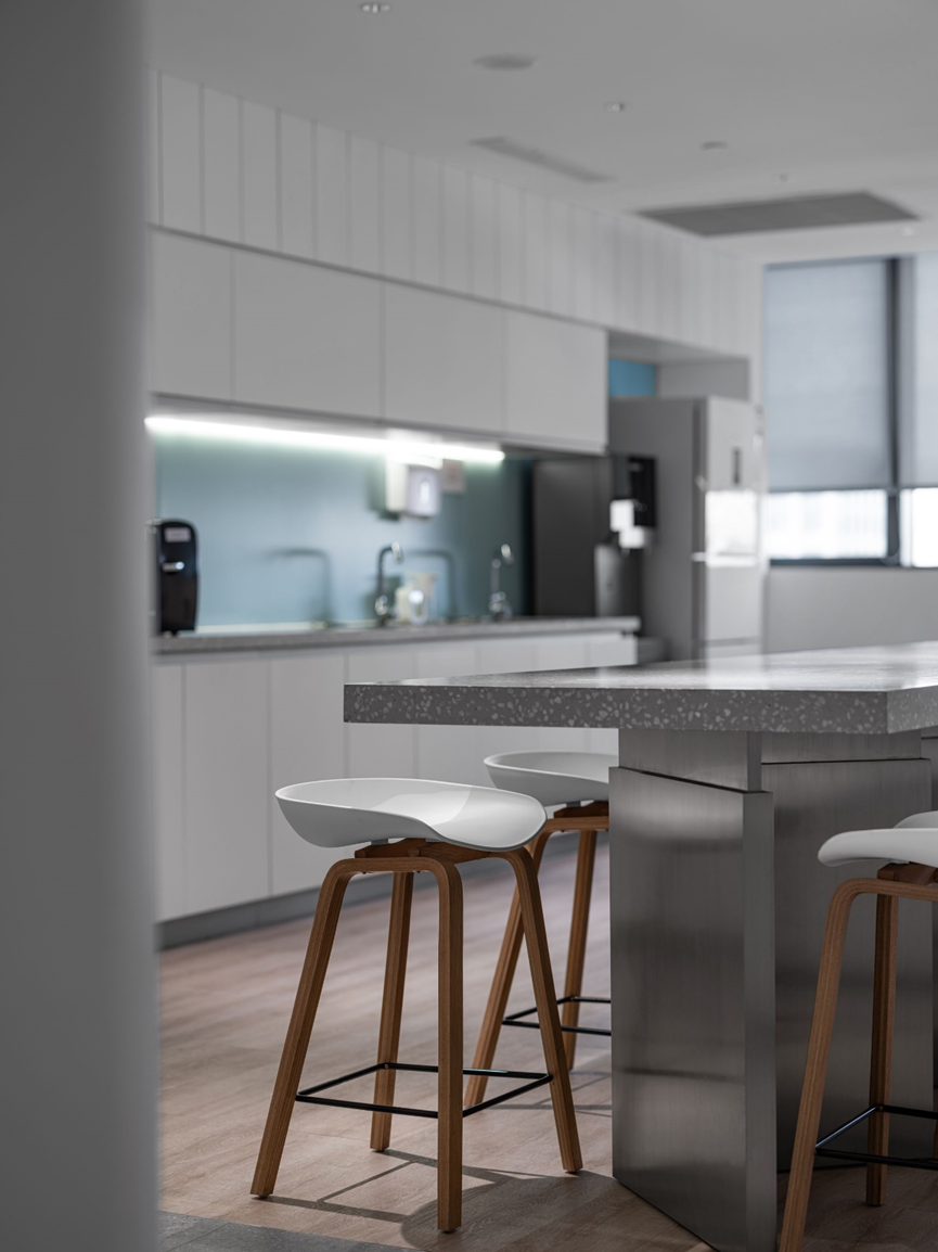 As the site is a long horizontal space, the convenience of using and the impact of sound are taken into consideration; therefore, the shared spaces such as pantries, reception rooms and meeting rooms are designed to be placed at the edge of the core- tube structure, so that not only the internal staff on both sides can reach them easily, but also the external visitors can achieve the business purposes without disturbing other employees. For employees on other floors, they can also share the use of the meeting spaces without disturbing others.
