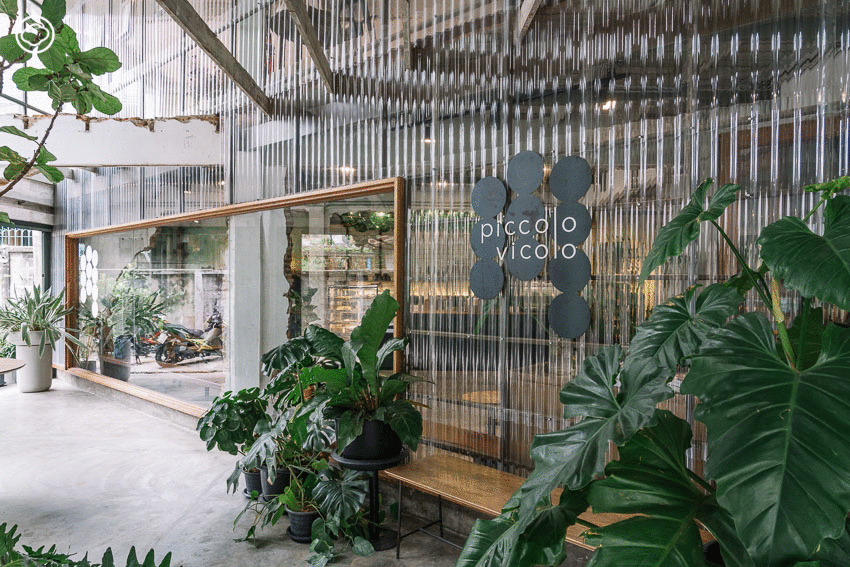 进入社区,映入眼帘的就是Piccolo Vicolo咖啡厅。整体保留了建筑的旧貌,斑驳的素色墙面、红砖残垣成为最独特的装饰素材。内部的家具则选择了藤条椅和柚木家具,颇具东南亚夏日情怀,而黄色牛皮座椅和苔藓绿瓷砖的搭配又极具西洋味,再通过老式打字机、缝纫机、放映机等摆件,营造出复古的气息。