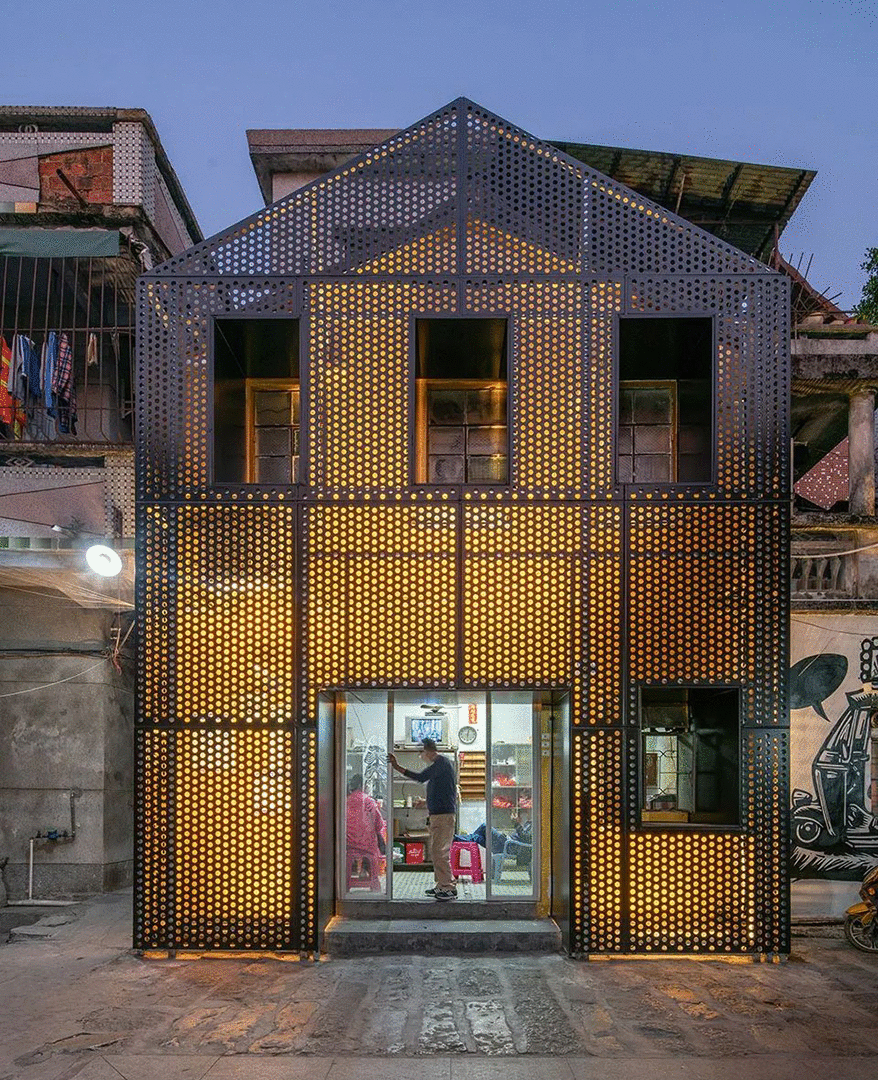 六角亭正对面的一栋老屋(一楼是麻将馆,二楼为居住)山墙立面进行了改造,使用黑色穿孔铝板(孔径40毫米),脱离老屋原有山墙建造,试图在已经非常丰富的历史场景中,塑造出新的戏剧化场所特质。另一栋空置老屋立面做了一套加固的钢架系统,并在入口处增加了黑色花纹钢板和透明白色亚克力,延伸进建筑内部,将屏幕、投影、灯光等设备自由安装其中,变成了老屋影像馆。