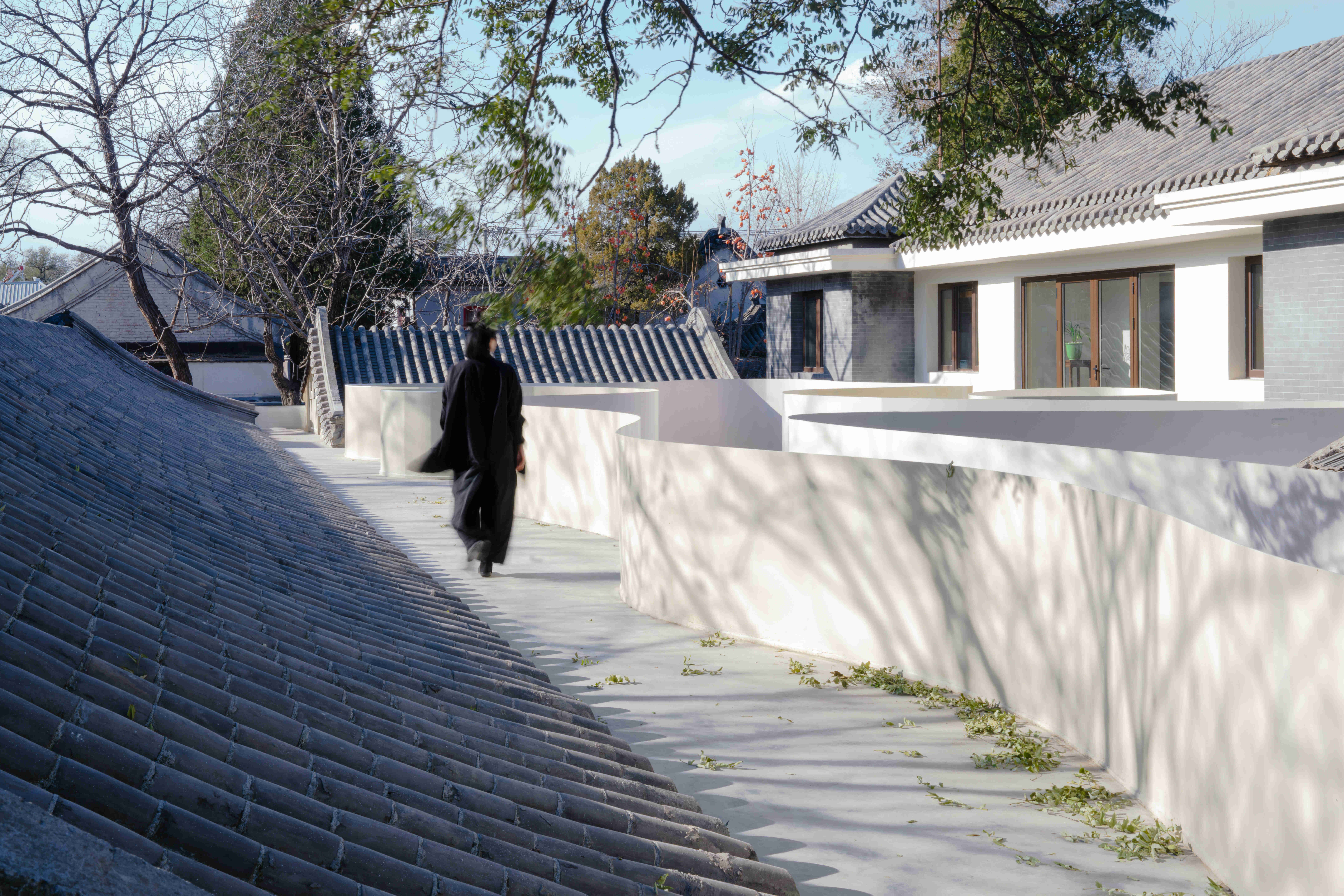 室内外由两部楼梯与云廊连接,步入云廊之上,传统的四合院屋顶如岛屿般被其环绕,心中不免泛起上房揭瓦的冲动。一层院子的轮廓在二层被云廊勾勒出丰富的层次,最重要的是这些戏剧性的曲线栏杆与人形成的有趣的互动,为空间增添了最重要的人文色彩。
