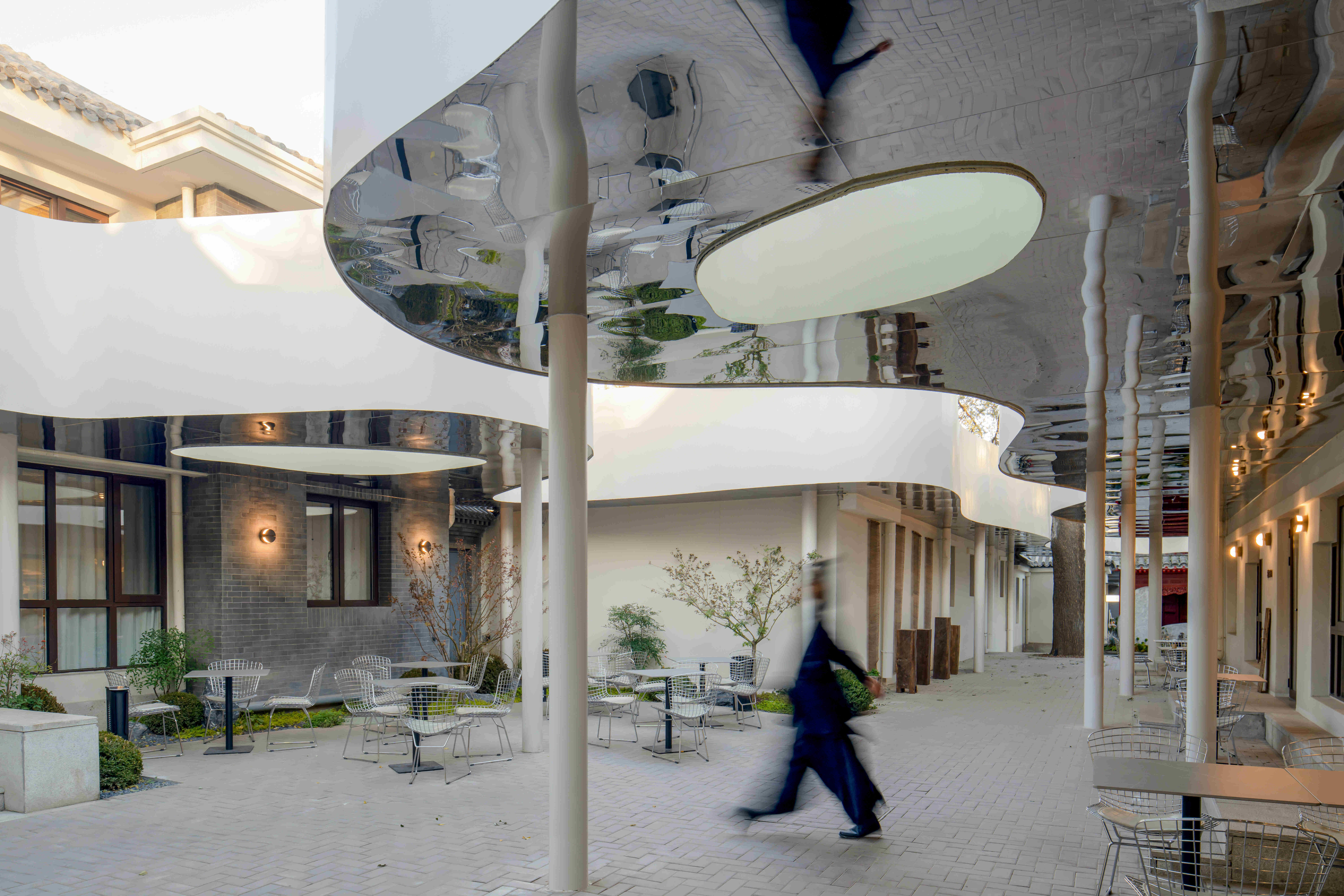 During the renovation process, WAY Studio redefined the skyline of the traditional Siheyuan (courtyards) with a cloud-bridge, forging a new relationship between natural and man-made spaces. Upon entering, the first impression is of a cloud-shaped corridor floating within the courtyard embracing two towering ancient trees. The cloud-bridge is made of twisted mirror images floating above, abstracting the immediate surroundings and offering visitors an unexpected experience. The bridge becomes an extension of the architecture, reorganizing the relationship between building and void, creating grey areas which alters the way the space is navigated.