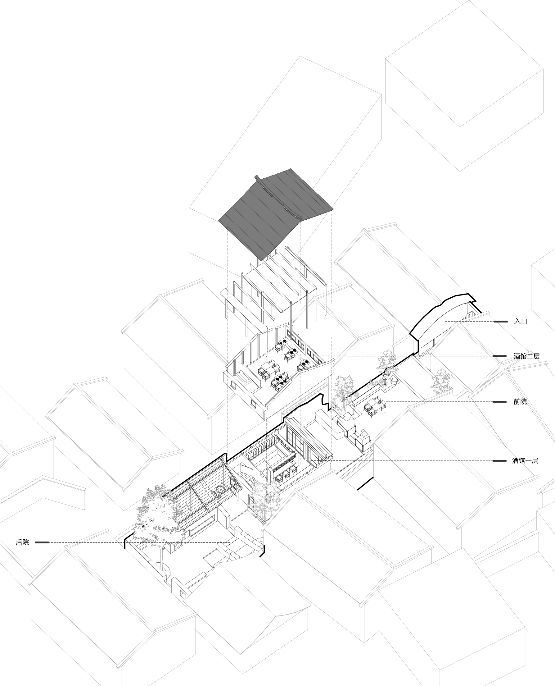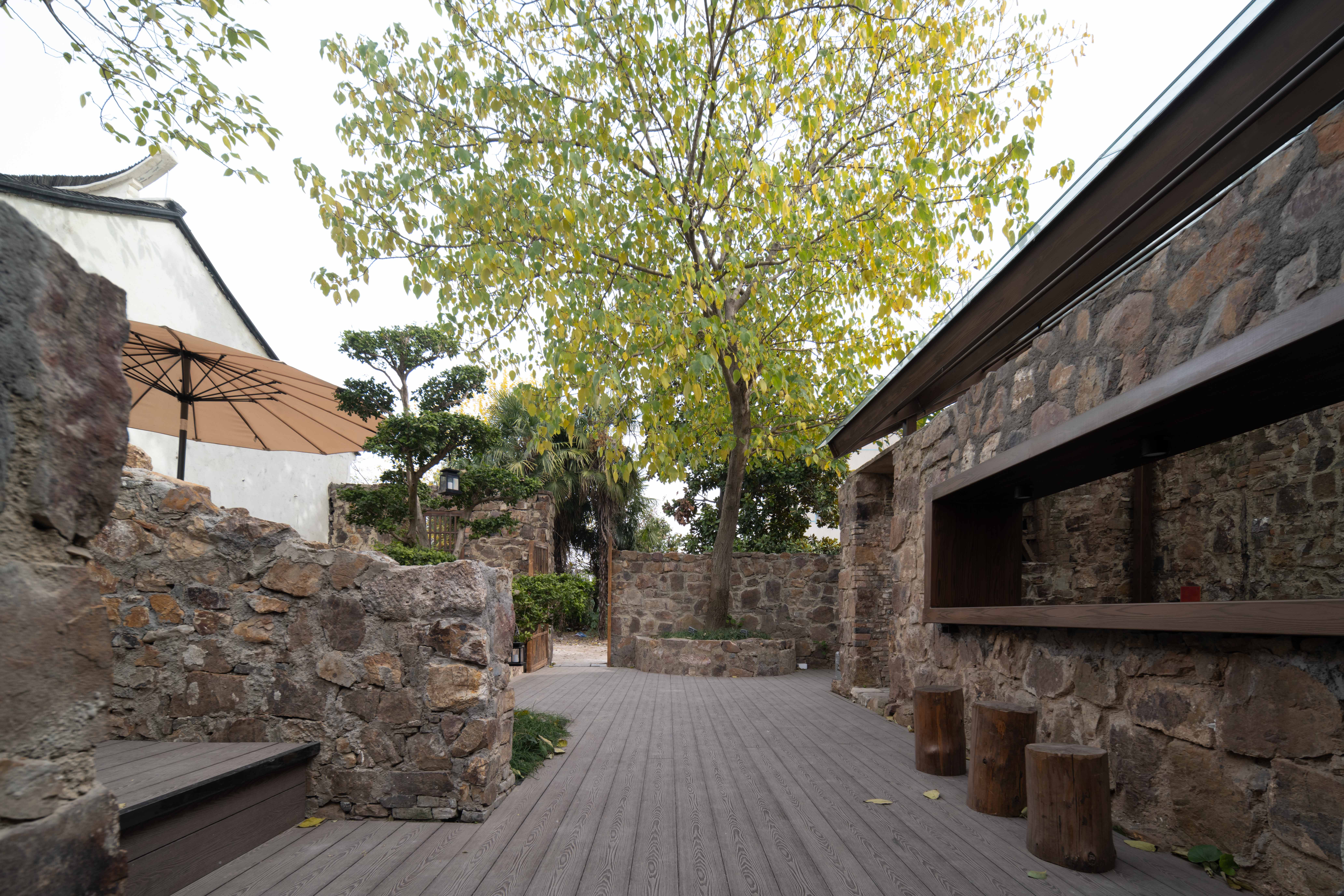 我们在保留后院遗存的黄石墙垣的基础上,增加了平台、阶梯、座椅等元素,以满足酒馆业态的使用需求。新业态的植入使这片废墟重获新生,让遗迹不再是仅供观看的展品。