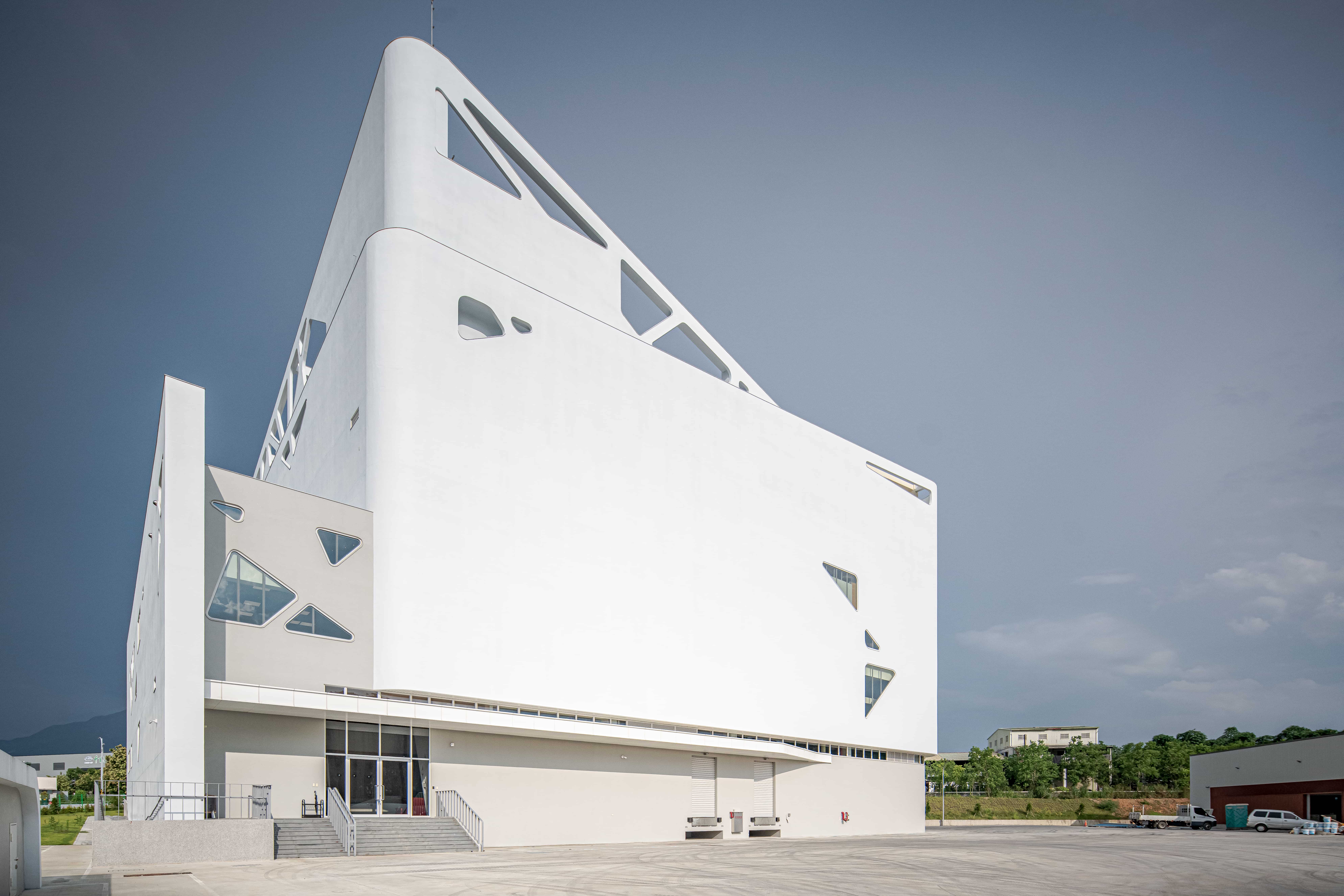 本案属台湾比菲多集团大埔美园区之一部分,供旗下爱维儿股份有限公司使用。爱维儿致力于研发生产美妆、保养与清洁用品,以 “95%源自天然”作为品牌诉求;设计概念以品牌形象“自然、纯淨、环保”的理念发展;空间规划希望突破仅专注于生产机能的手法,外型也打破了过往工厂建筑冰冷的垂直水平线条,塑造具有流动般温润的曲线,以“亲近”为出发点,回应品牌精神。