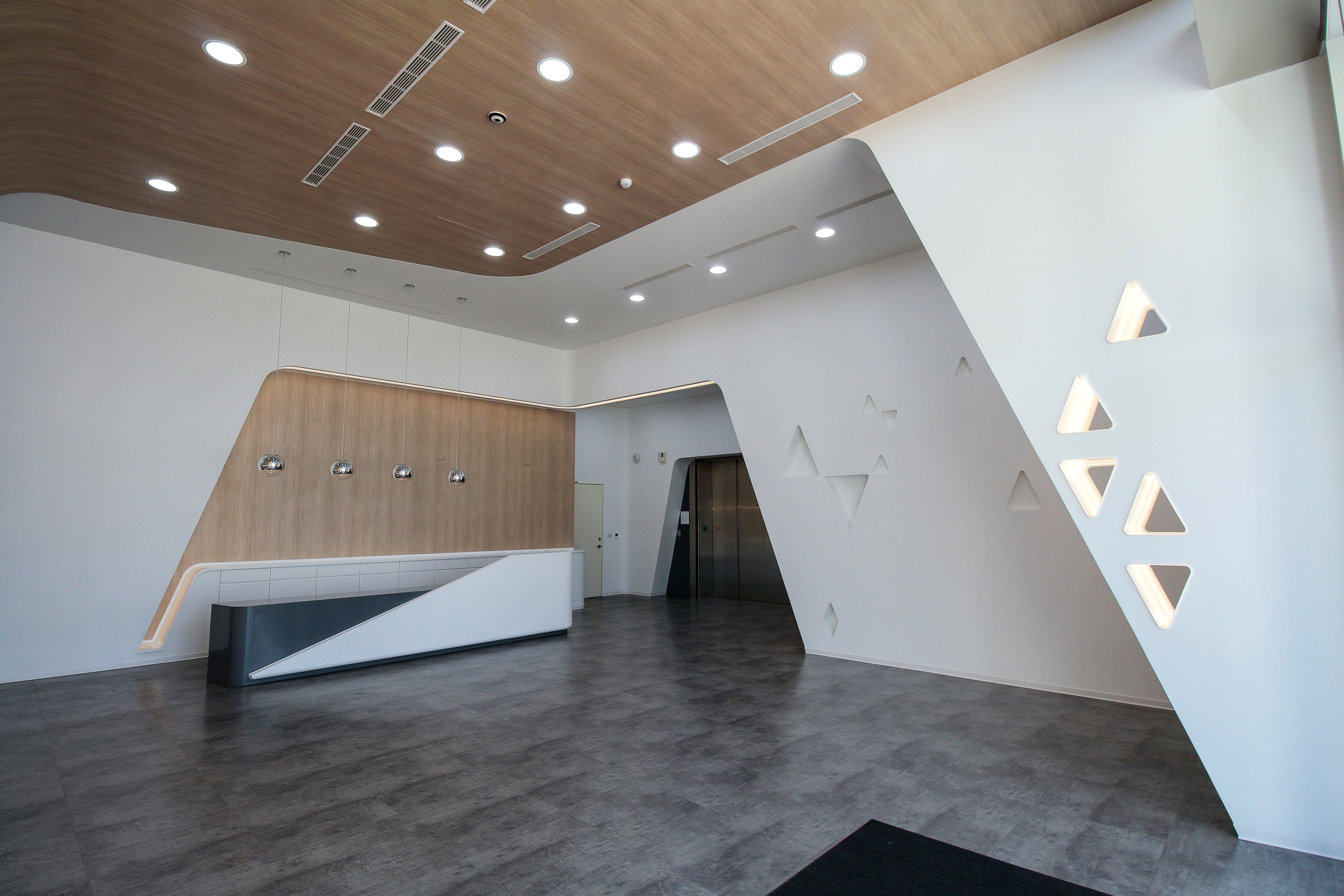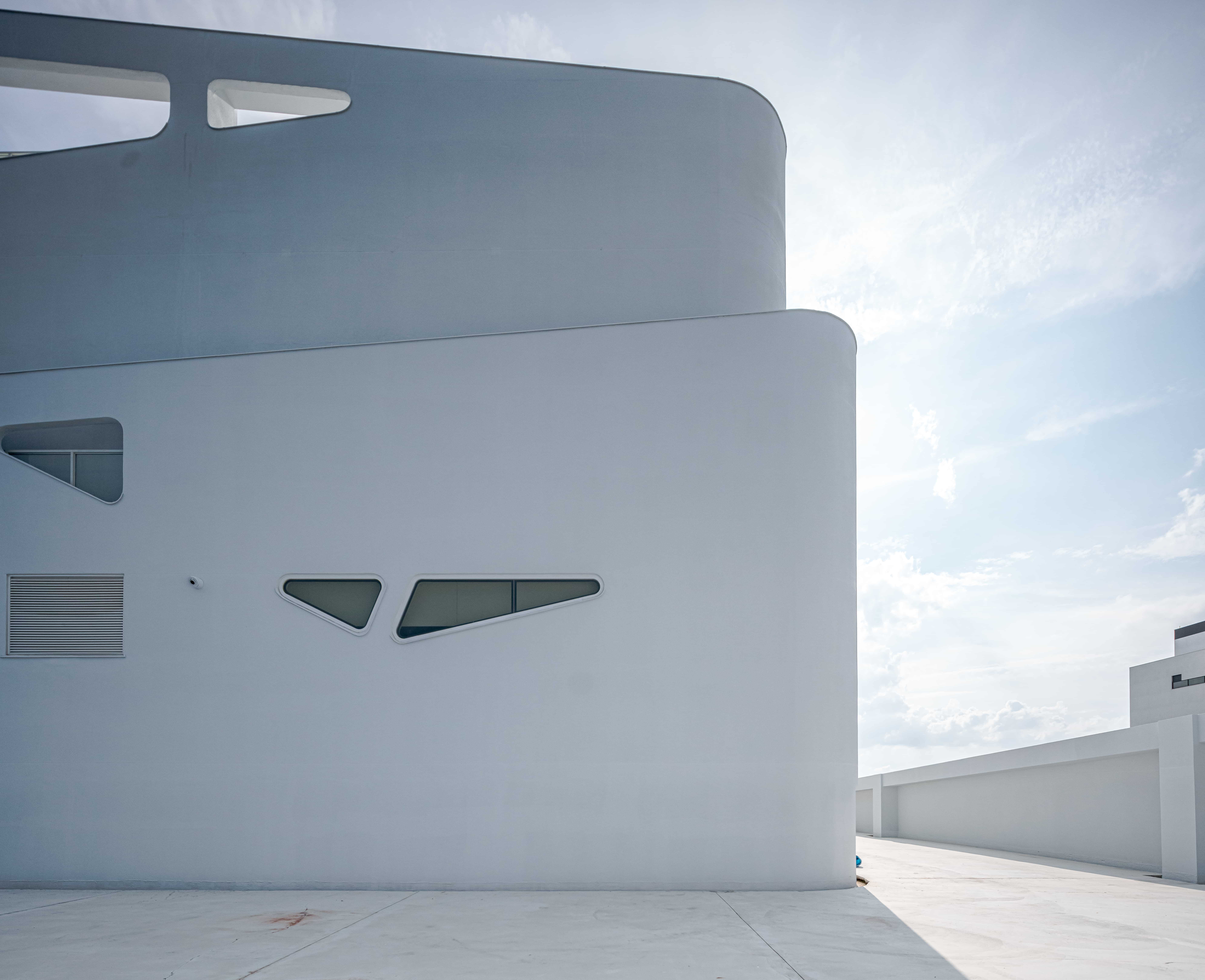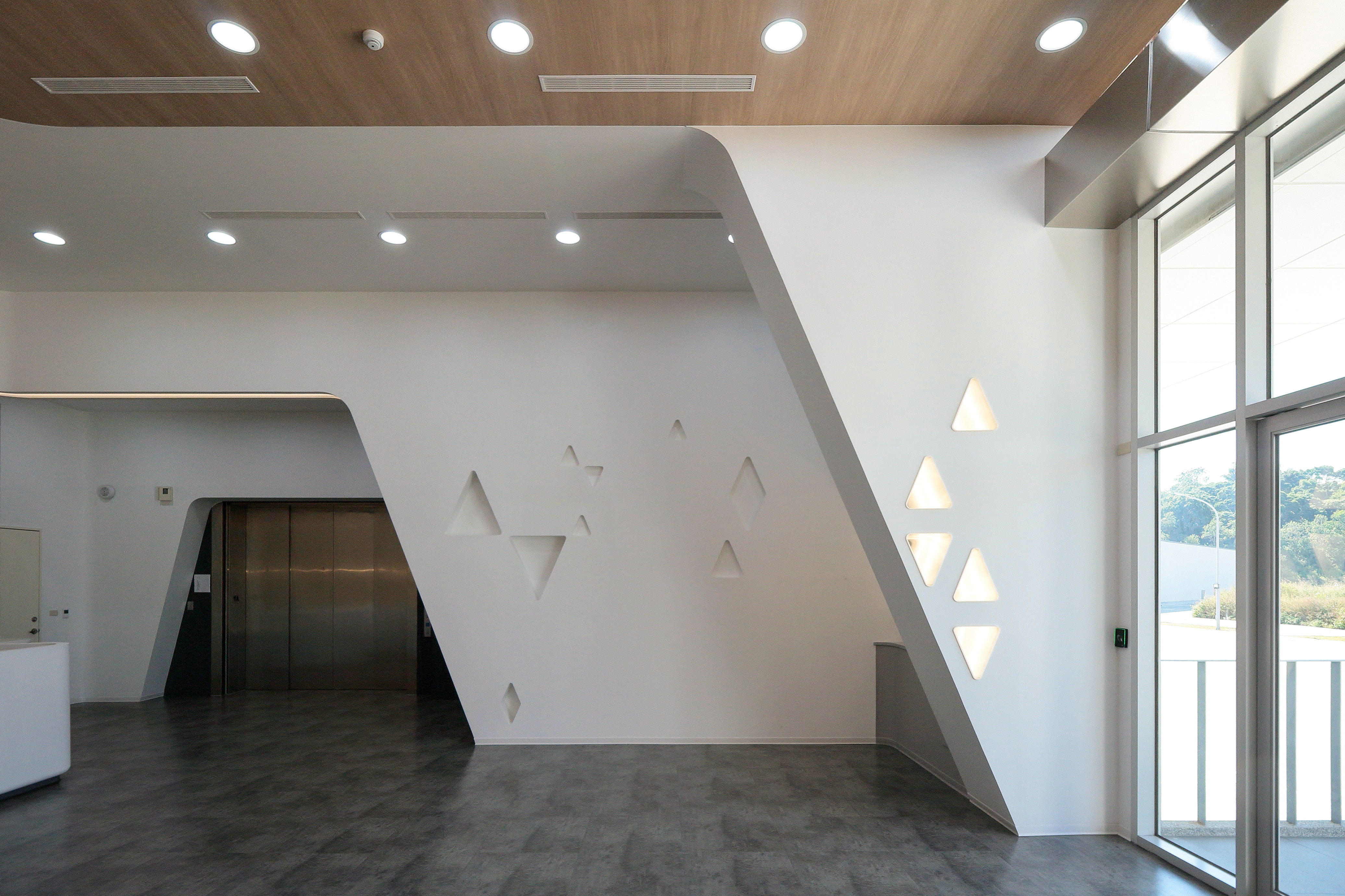 以产品使用时的物理特性“慕斯泡沫”发想,泡沫是在液体与气体充分混合时,由大量气泡分散在液体中而产生,亦是许多分散体系堆积而成的整体,细腻的泡沫更能深入肌肤,体现出洁肤产品的功效。建筑形态上利用牆体的陵线环绕与有机的通风採光开口建立形态上的呼应,清楚传达出企业产品意象,此外亦延伸其动态语汇至大厅室内设计之中,以流动的曲线环绕空间,并以造型吊灯作为柜台空间点缀,经营迎宾接待意象,创造具识别度的特色建筑。
