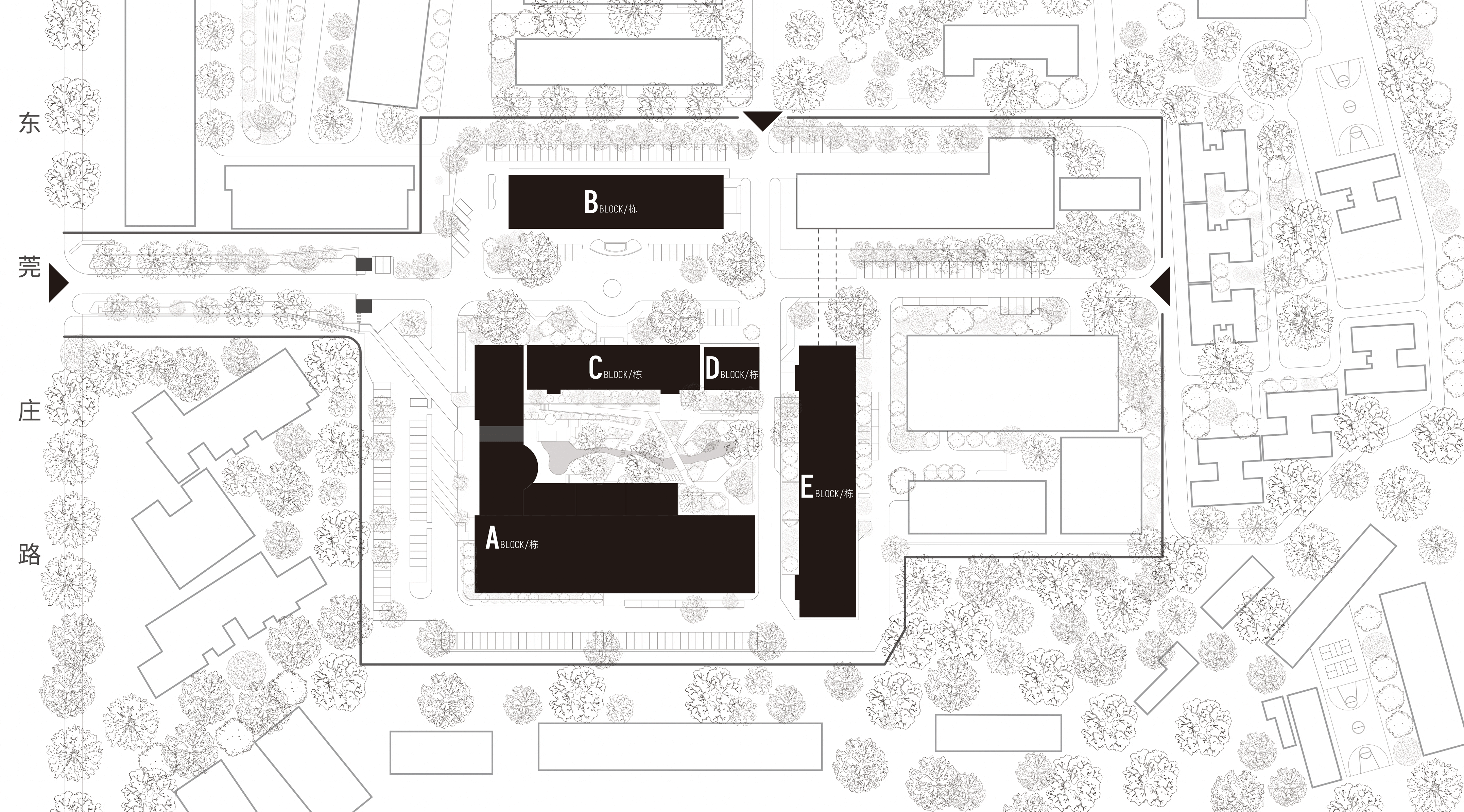 场地原先作为研究所是一种相对封闭的内向型空间,而办公园区则希望是一个能对外开放吸引人流的外向型空间,这一基本的矛盾成为了本项目立题的开始。也引导着我们对园区进行了一次从外至内的梳理。