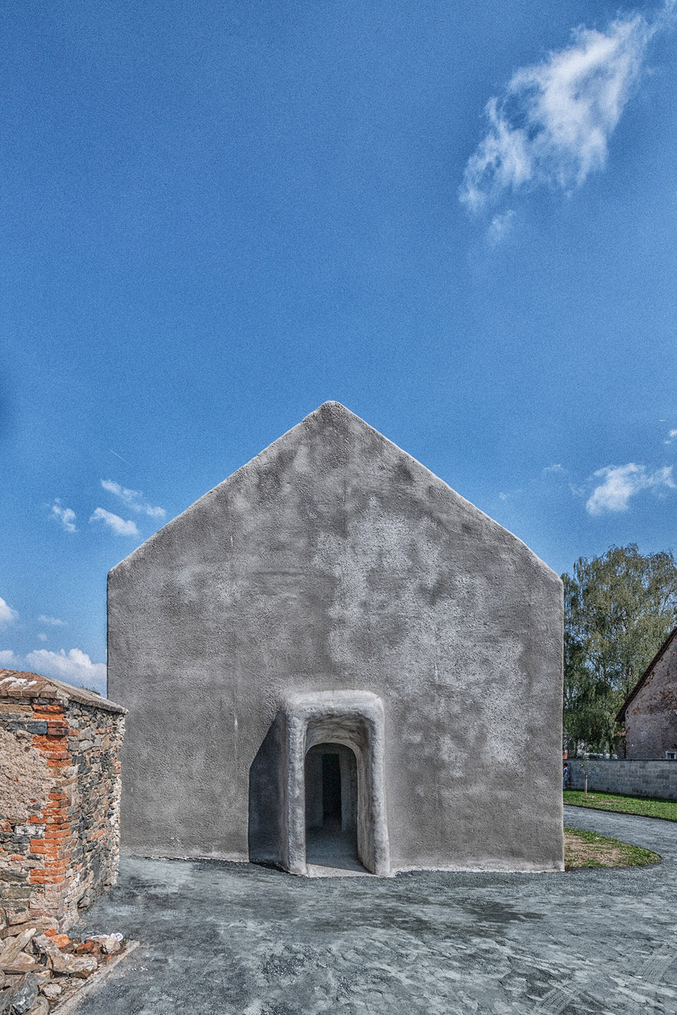 Following many reconstructions, the ancestral home of Josef Mašín lost its original character. The only trace of authenticity is represented by the masonry and vaulted rooms on the ground floor, preserved and hidden under a shell of sprayed concrete. The concrete serves a protective and stabilizing function. Other soft parts of the building, such as non-original windows and doors, the roof, and the beamed ceiling, were removed. To quote artist Rachel Whiteread, the process can be described as the mummification of the base structure, whose interiors can be entered and traversed.