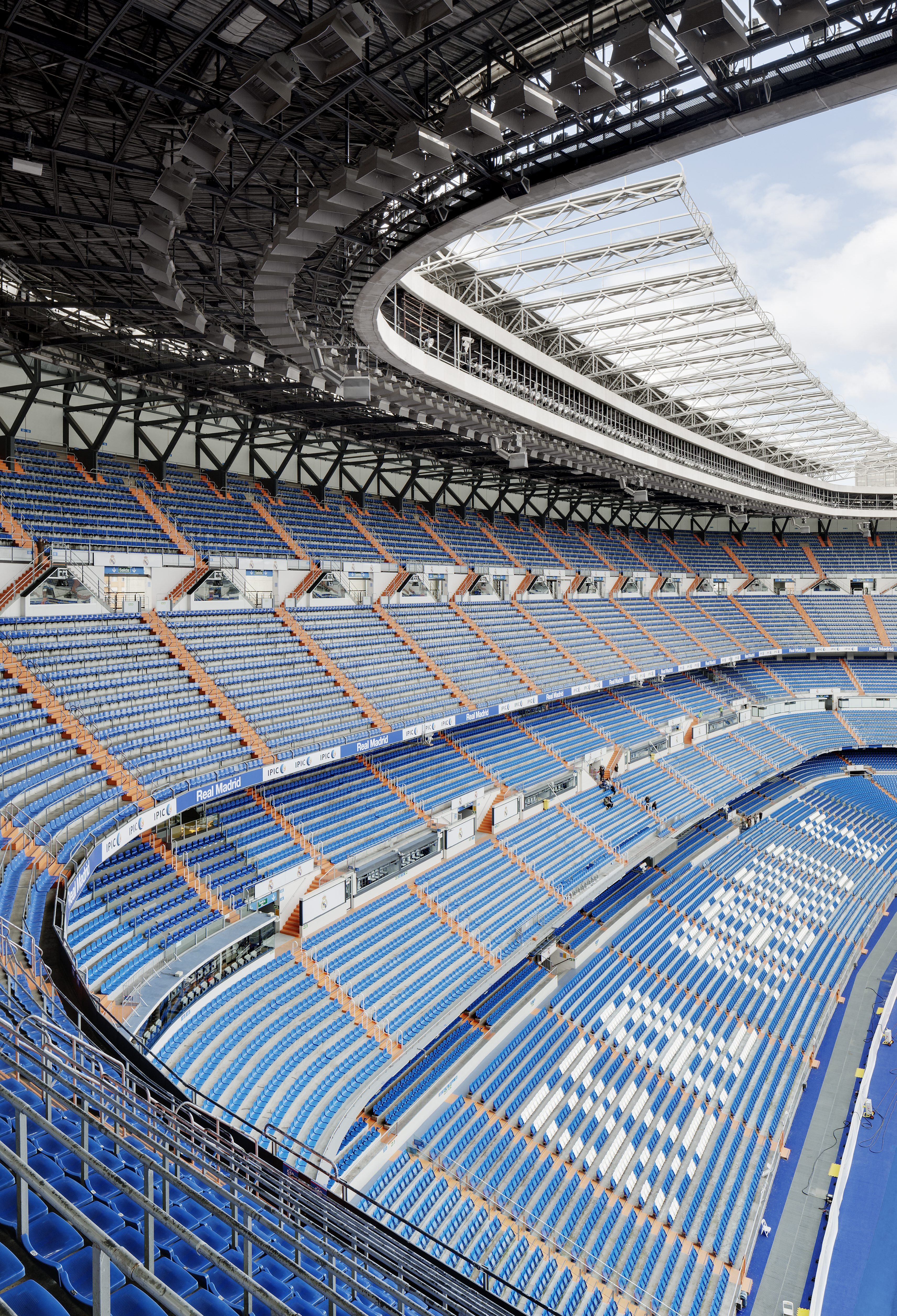 The transformation was carried out without interrupting the soccer schedule. After awarding the commission and following a lengthy planning and approval phase, the client, Real Madrid, appointed the Spanish construction company FCC as the general contractor; construction work began in June 2019. Because Real Madrid’s home games during the coronavirus pandemic had to be played in their training center without spectators, work on the construction site was able to proceed uninterrupted for about two years. Upon completion of the roof structure in May 2023, the club’s home games returned to the stadium while construction continued.