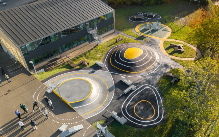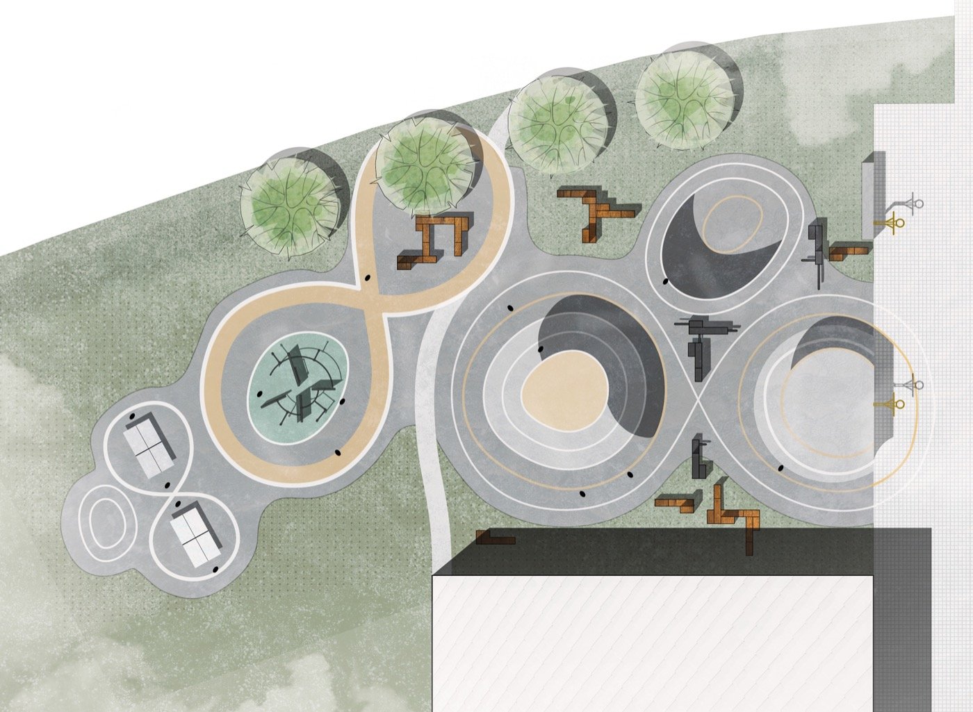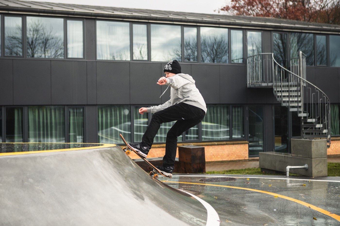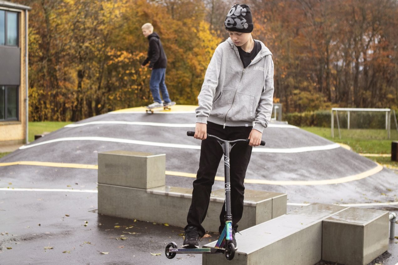 LOOPS youth hang-out and skate area has been developed for the school youth club and oldest students, aged 13-15, at a public school north of Aarhus. The layout includes a large undulating surface with multiple uses, interconnected in infinity loops that incorporate parkour, basketball, table tennis, skateboarding, and seating areas for small groups. This design makes it pleasant and welcoming for students to sit alone or in groups.
