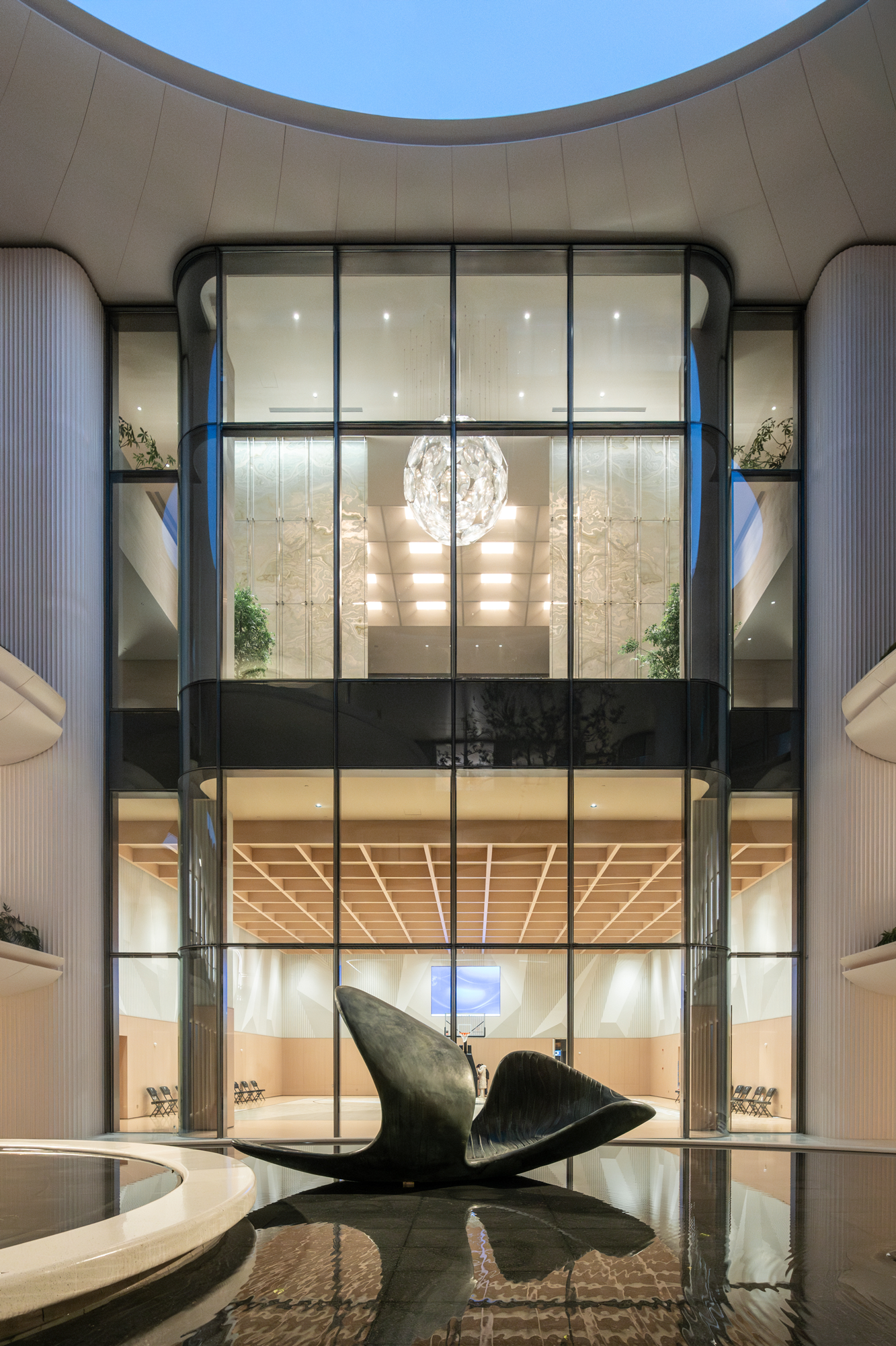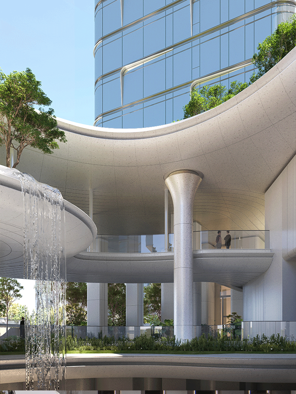 中庭空间以多层瀑布景观和垂直绿植为视觉核心,同时结合艺术展陈、城市休闲、景观打卡等功能,打造包容性的公共活动空间。