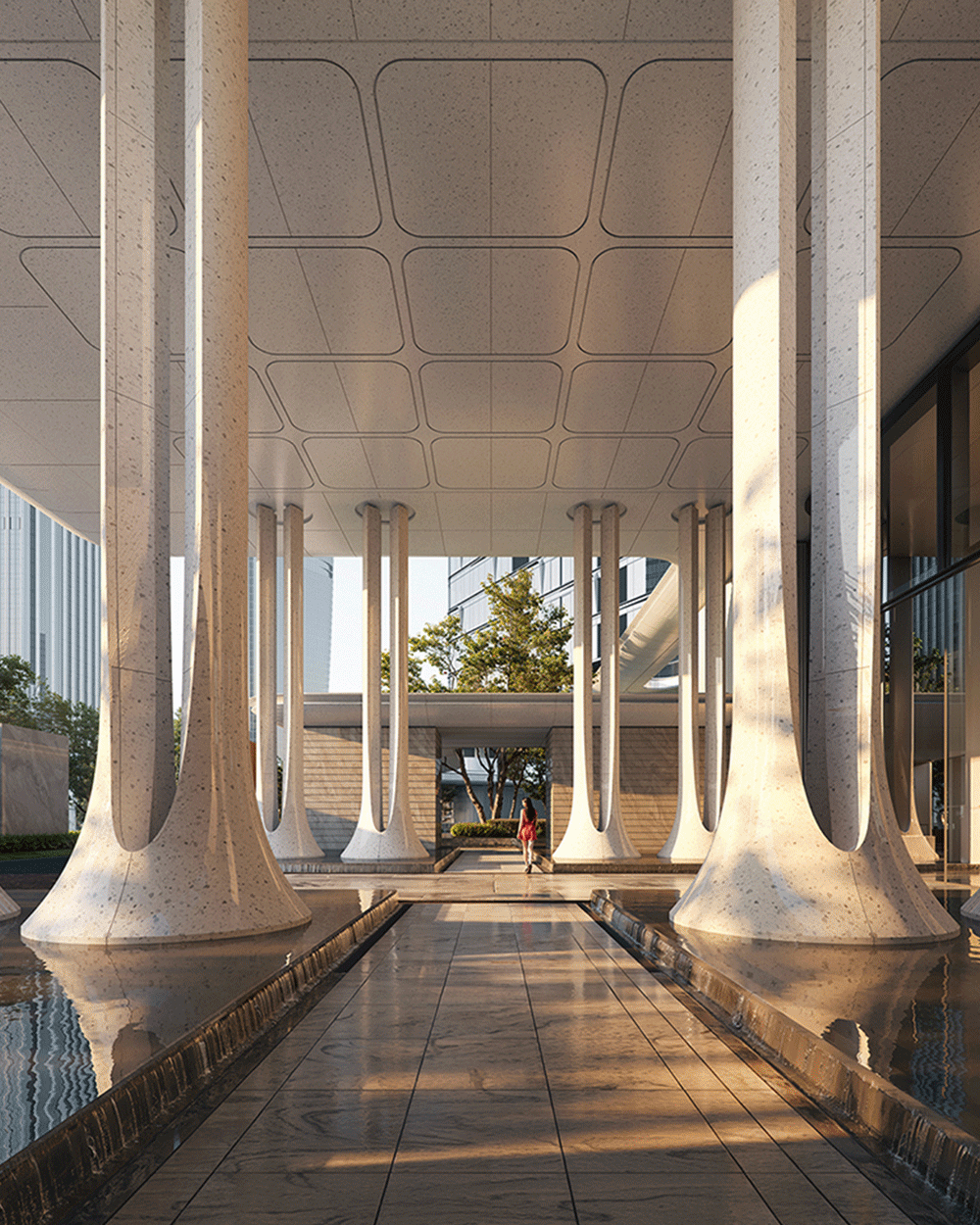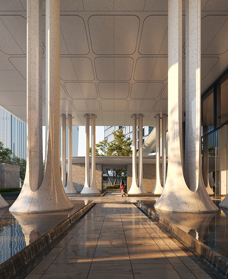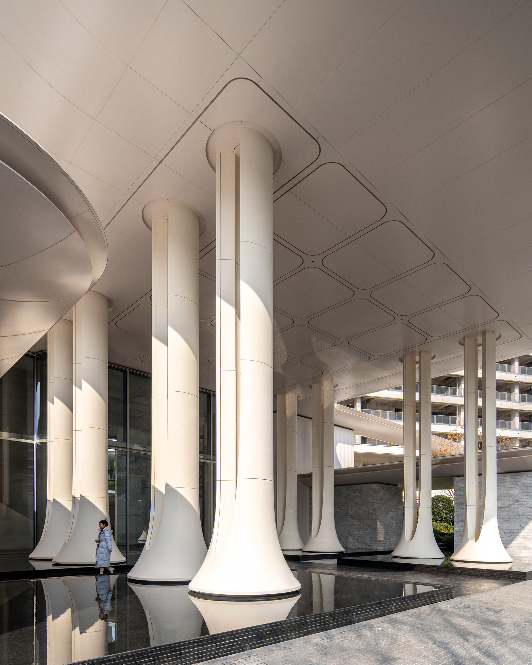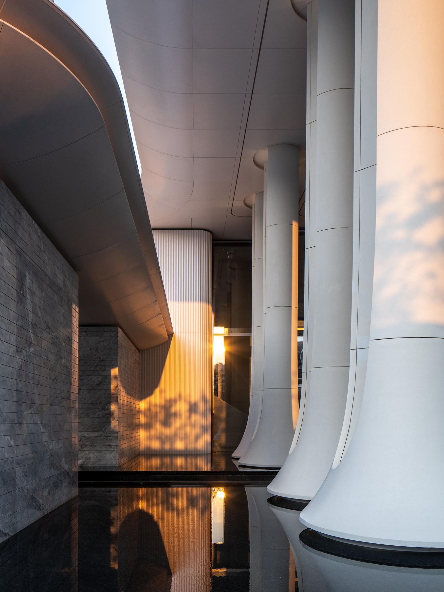 艺术中心主入口,由8根白色UHPC树形立柱阵列支撑,形成10.5米挑高的视觉引导与标志性空间。