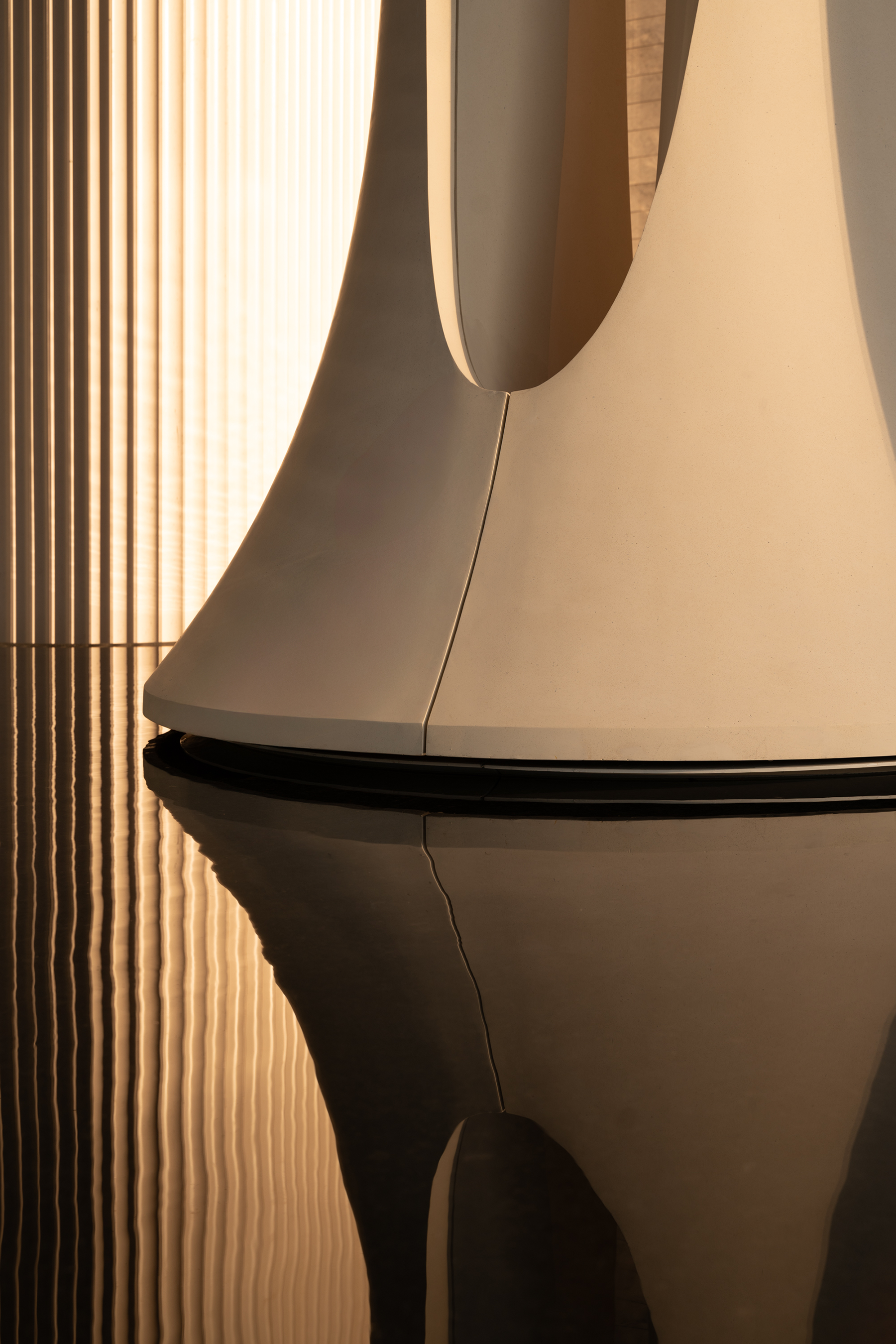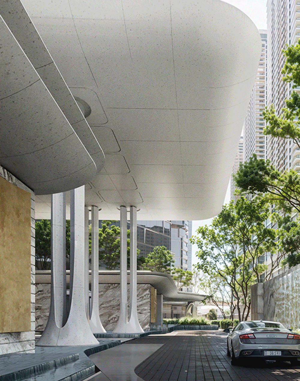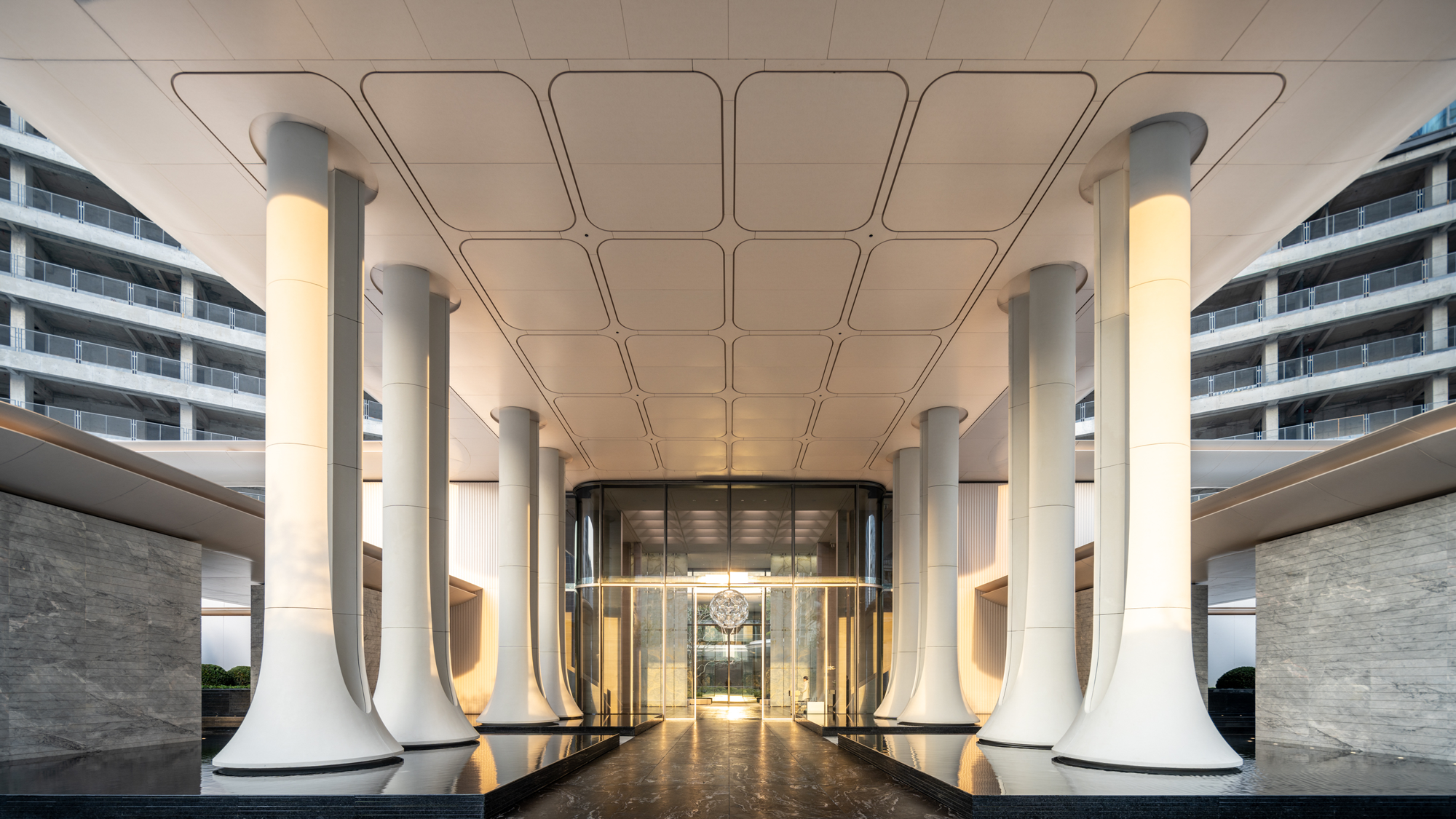 艺术中心主入口,由8根白色UHPC树形立柱阵列支撑,形成10.5米挑高的视觉引导与标志性空间。