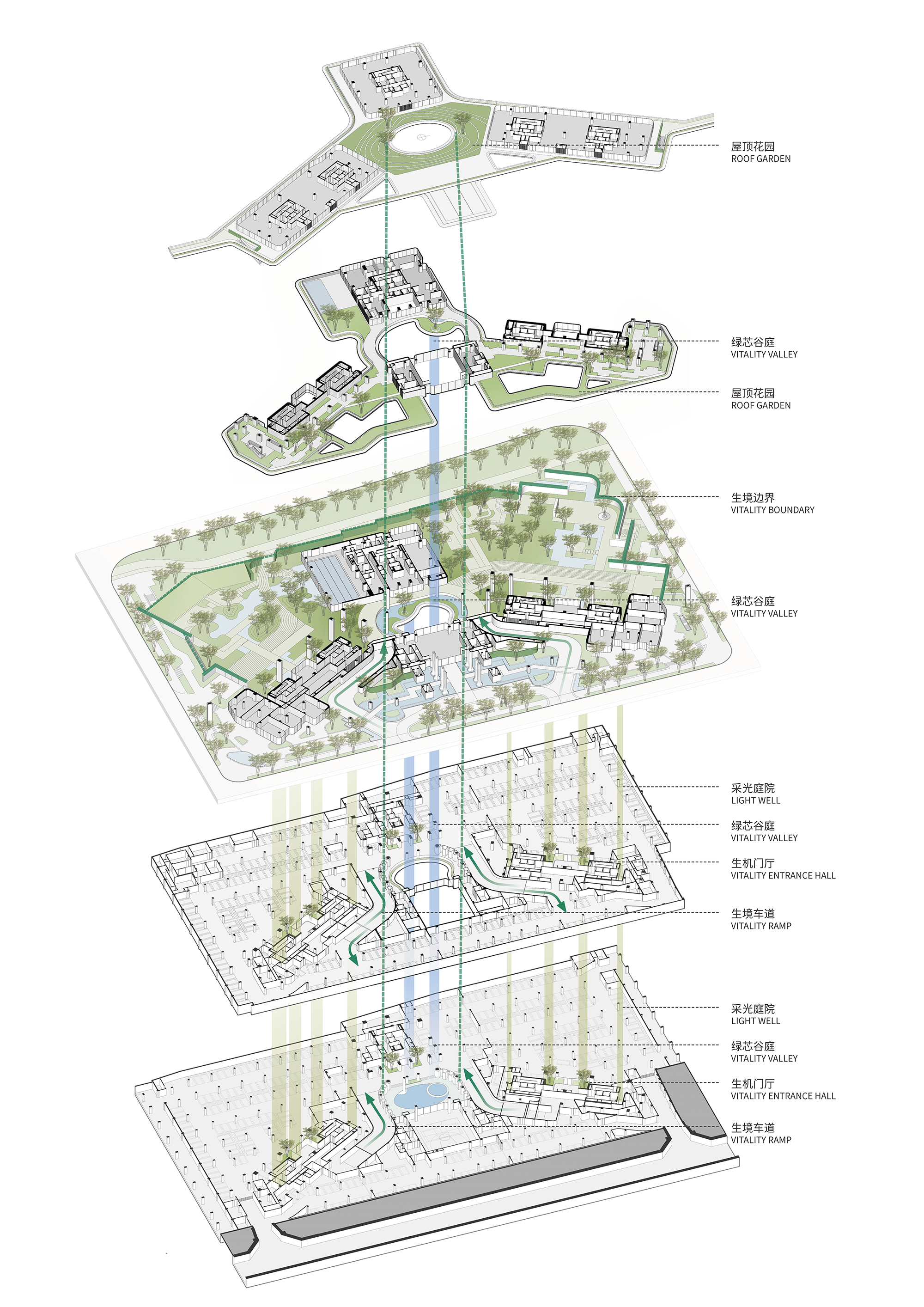 “生机之环”的中央庭院,整合了采光、景观与流线,通过环形路径实现各楼层的高效连通与人流分流。
