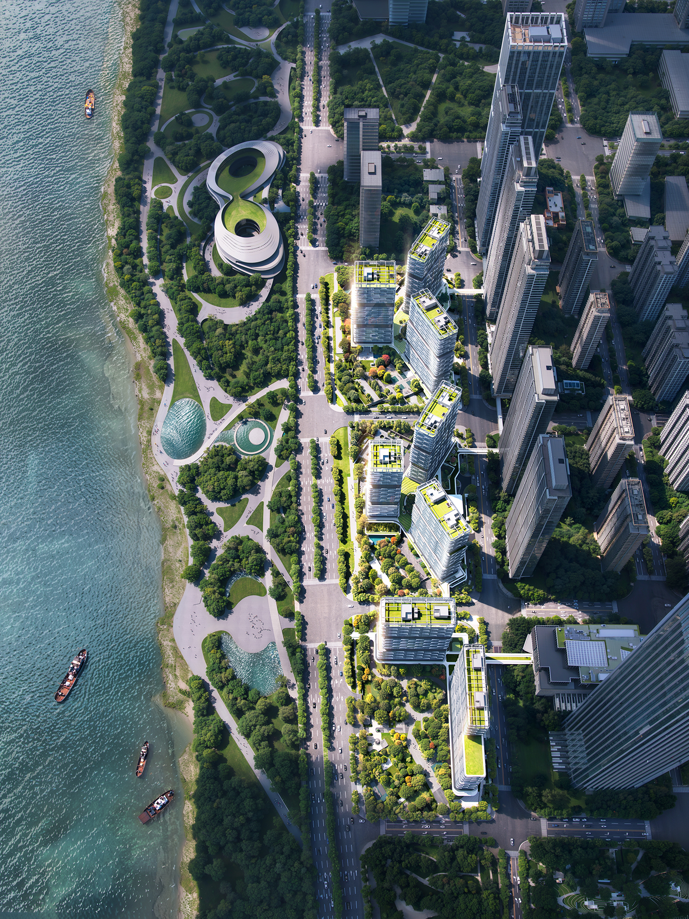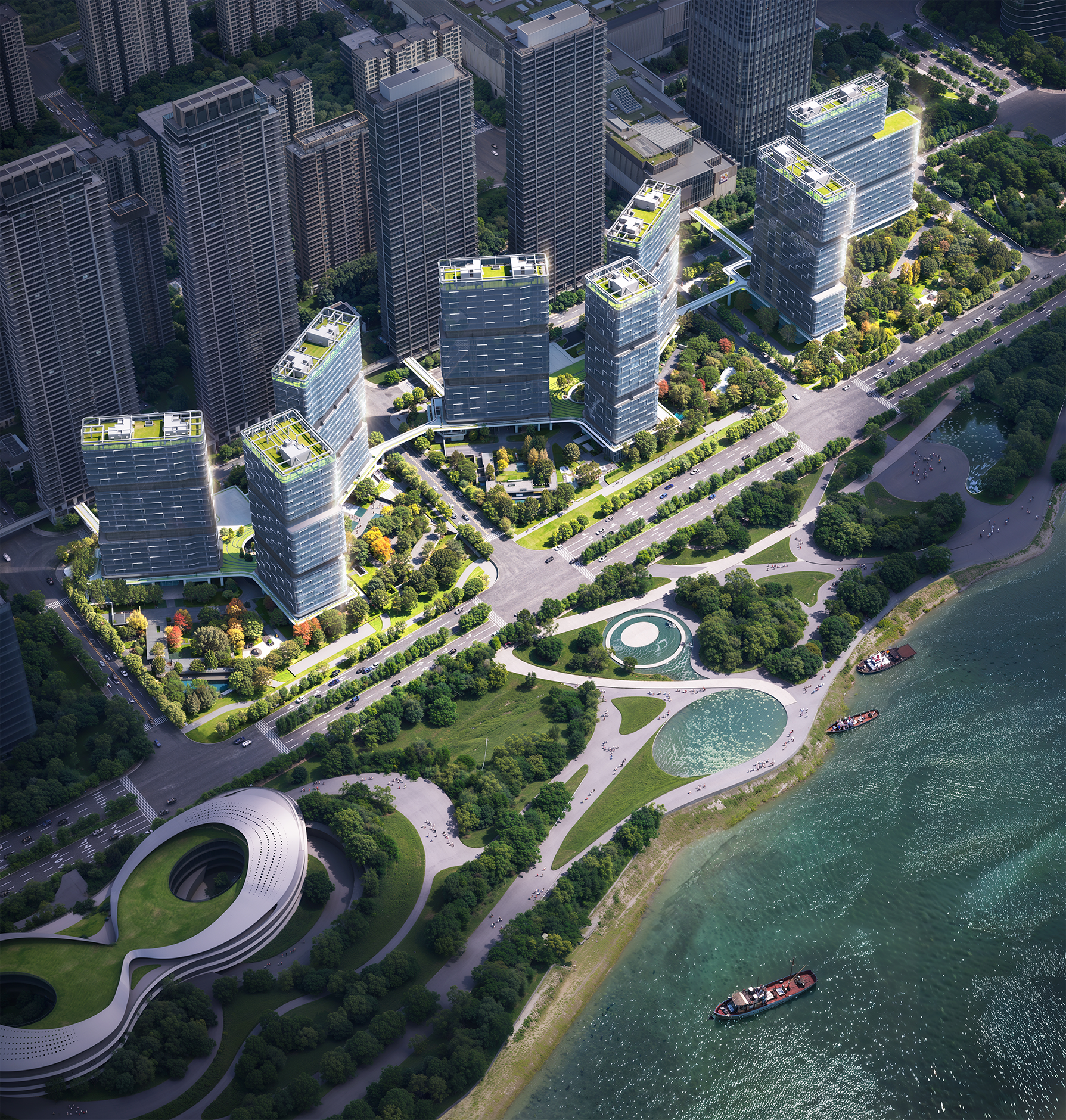 低区的“生境底盘”通过立体化路径串联8座塔楼和周边社区、滨江城市绿带,形成多维的公共系统:首层沿街设计为开放街区,10.5米标高处构建社区高线公园。通过街道近人尺度的商业盒子,艺术中心,水平错动的天街和片板绿化,以及被消解的建筑体量,来营造更具亲和力的城市空间尺度。